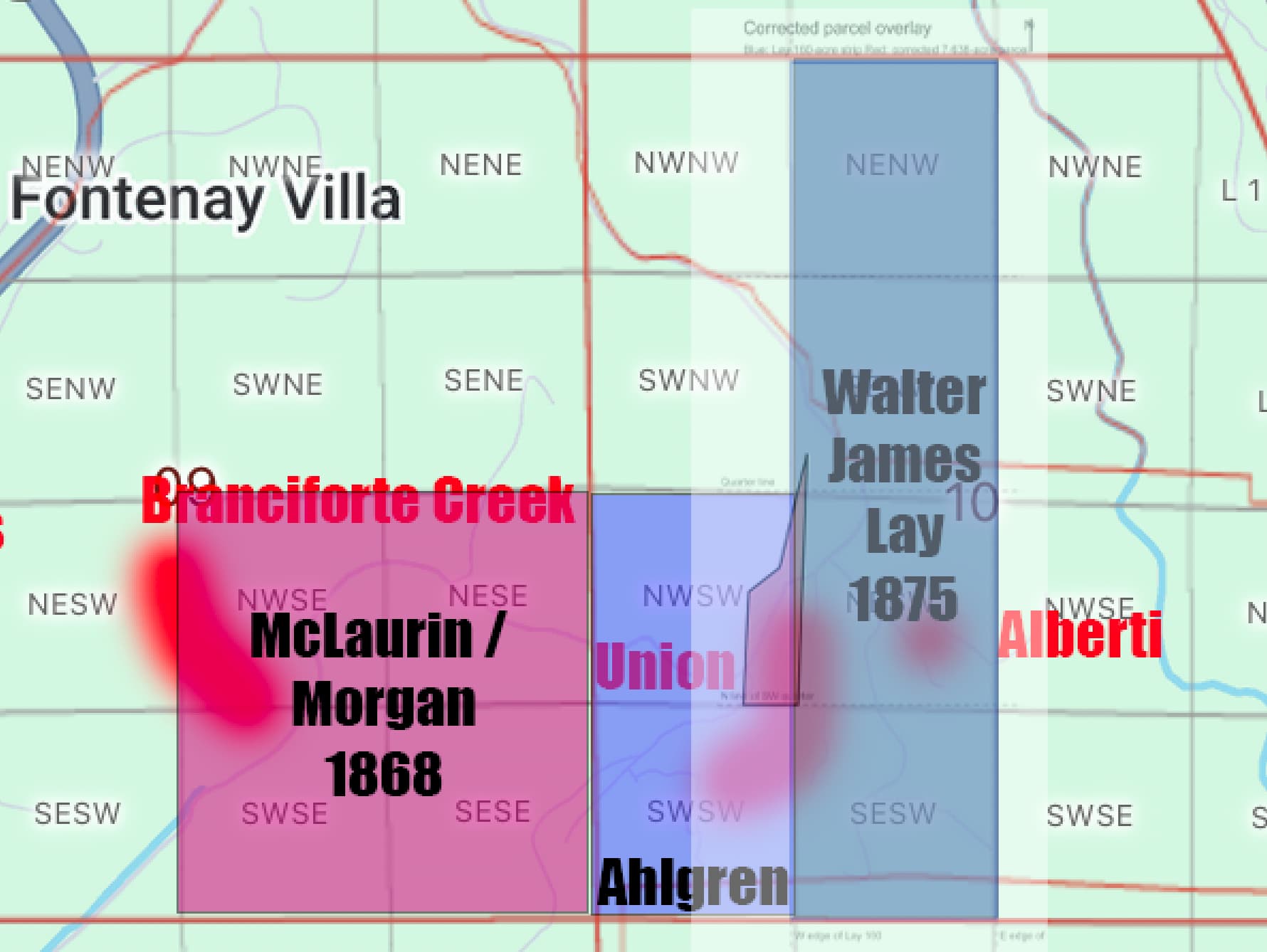 My starting coordinates were off, here’s the corrected locations of the Ahlgren and Lay parcels.