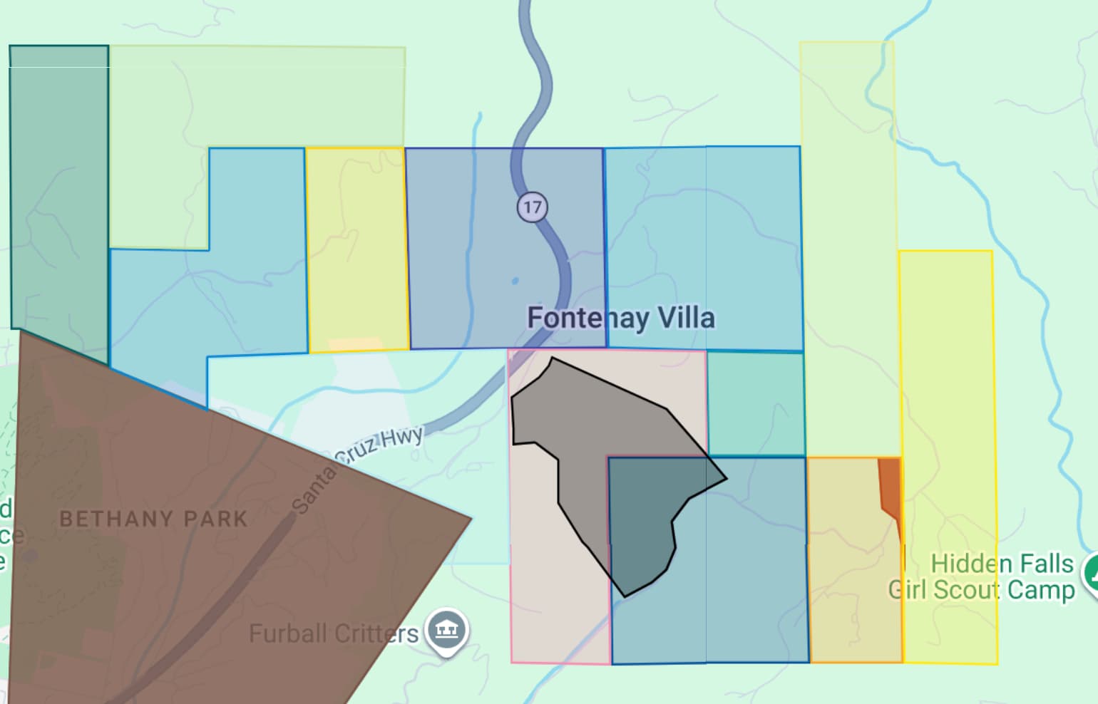 I reconstructed the plot best as I could according to the description. It lies wholly within the William Williams and John C Morgan patents, and borders Jarvis Road/Branciforte Creek/Blackburn Gulch, encompassing the modern day Branciforte Creek vineyard.