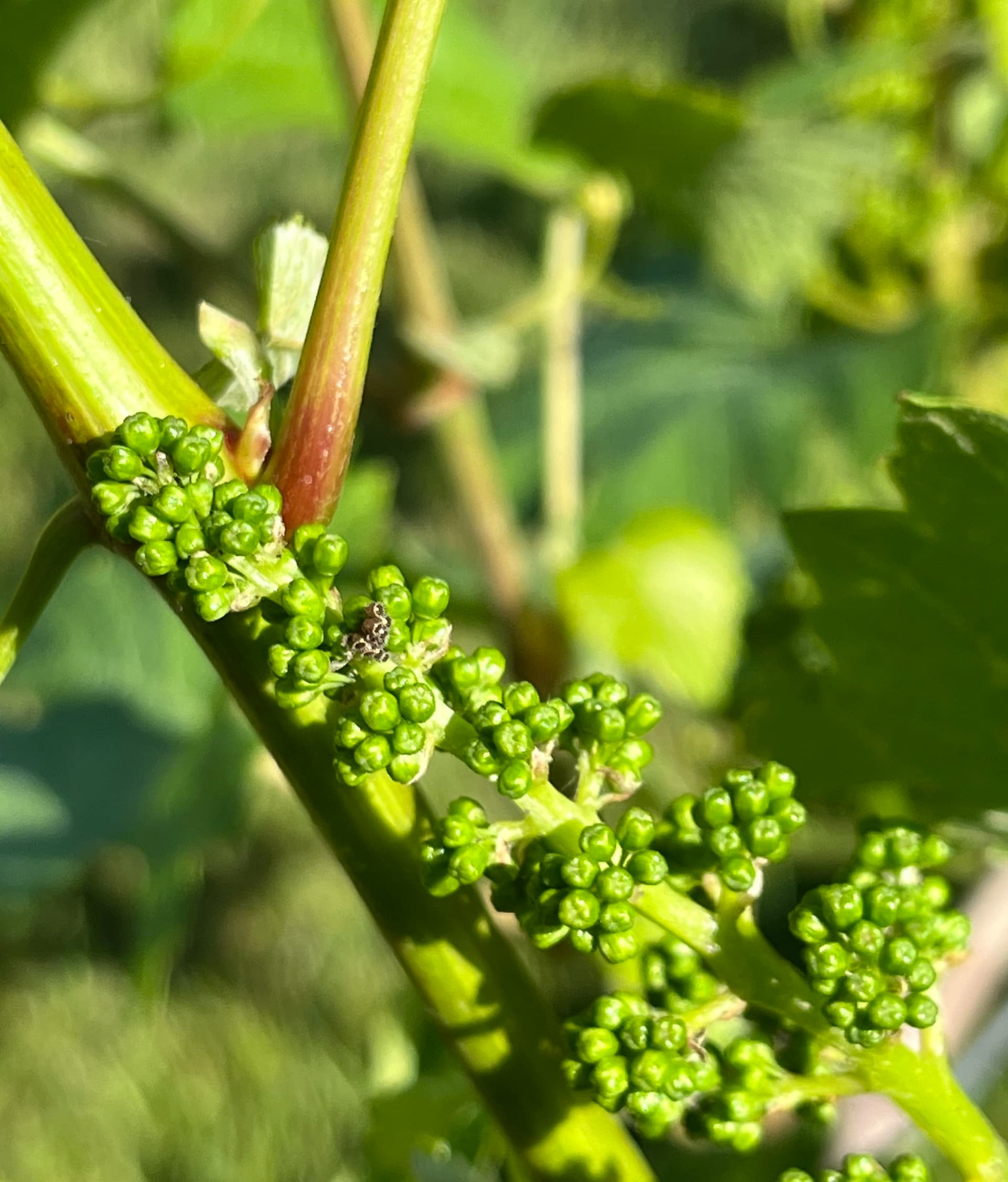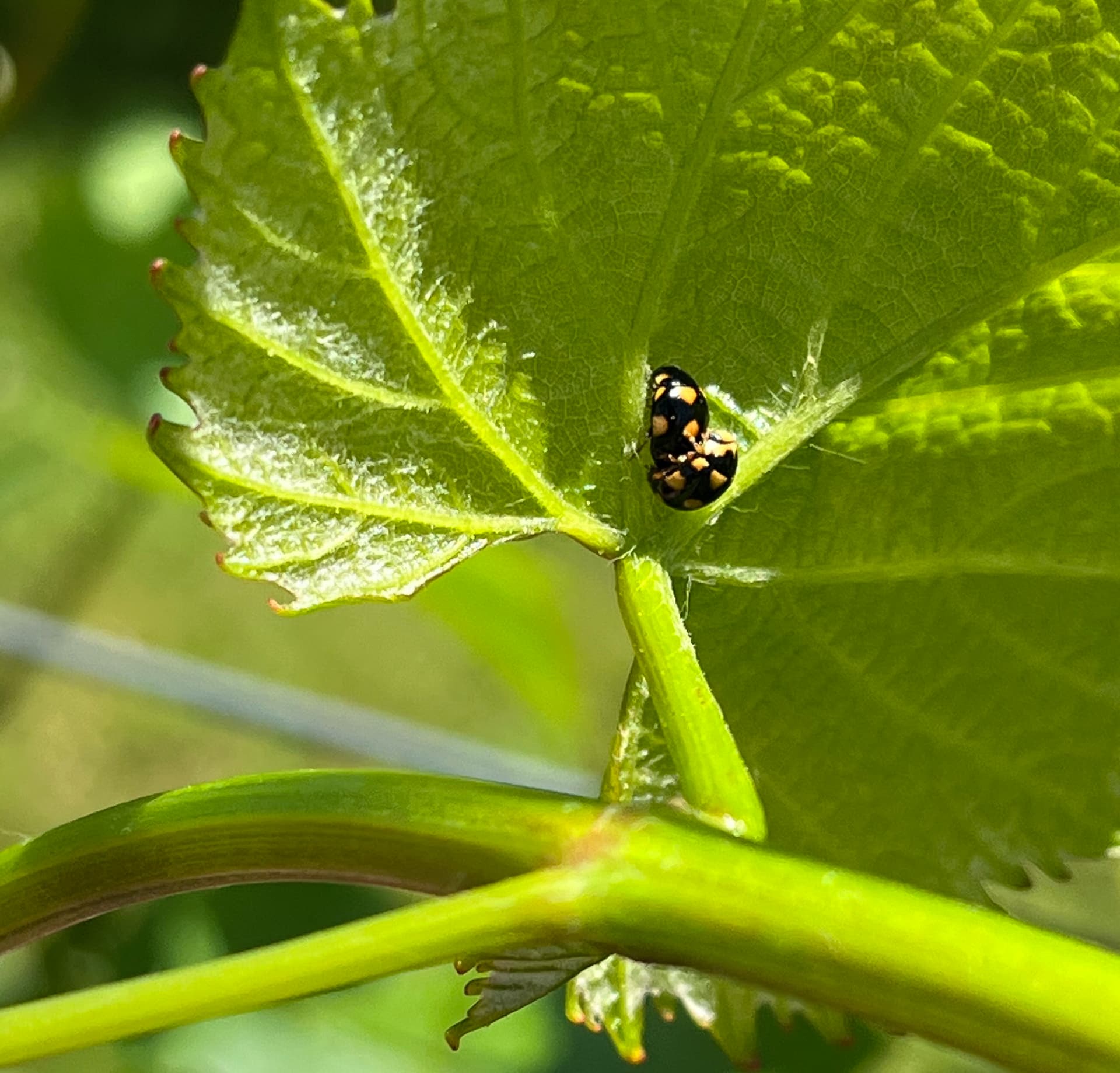 Several good insects have been showing up in our chenin blanc block . The first is a black lady beetle that is known to eat scale insects and aphids. My apologies to those that are sensitive to seeing beetles doing the “wild thing”. The second are spined soldier beetle eggs that are neatly nestled in the inflorescence of a future chenin blanc cluster.