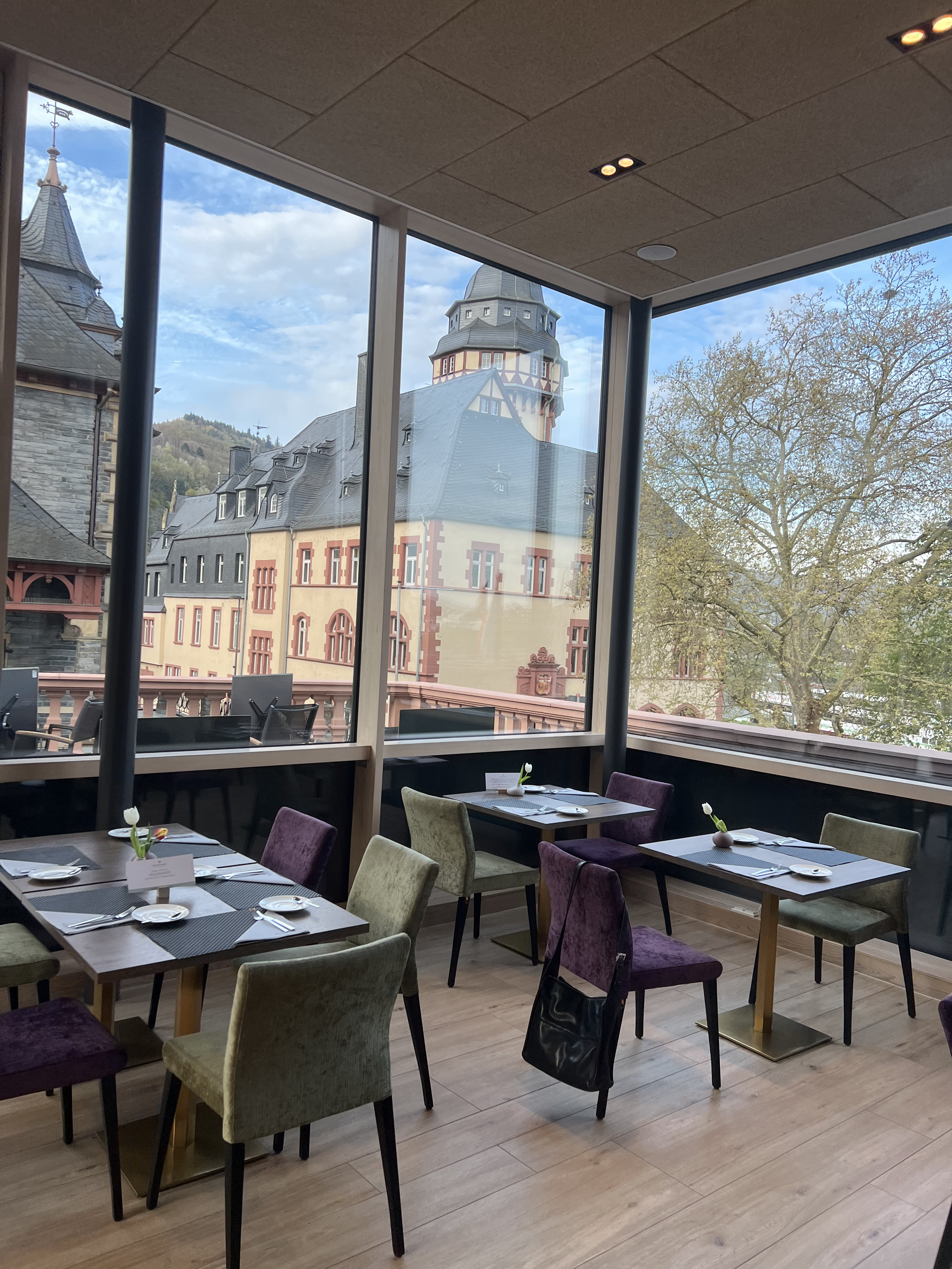 I woke up early to get breakfast at Deinhard’s. I heard that they have a very nice breakfast at their Restaurant Flora, and so I had booked this in advance for 28 Euros. The restaurant really is quite beautiful, and there is an area surrounded by glass windows where you can see the Bernkasteler Graben and the river on opposite sides of the room. In terms of food, there is slightly more variety than at Burgblickhotel, and I am especially happy that they were able to make omelettes for me.