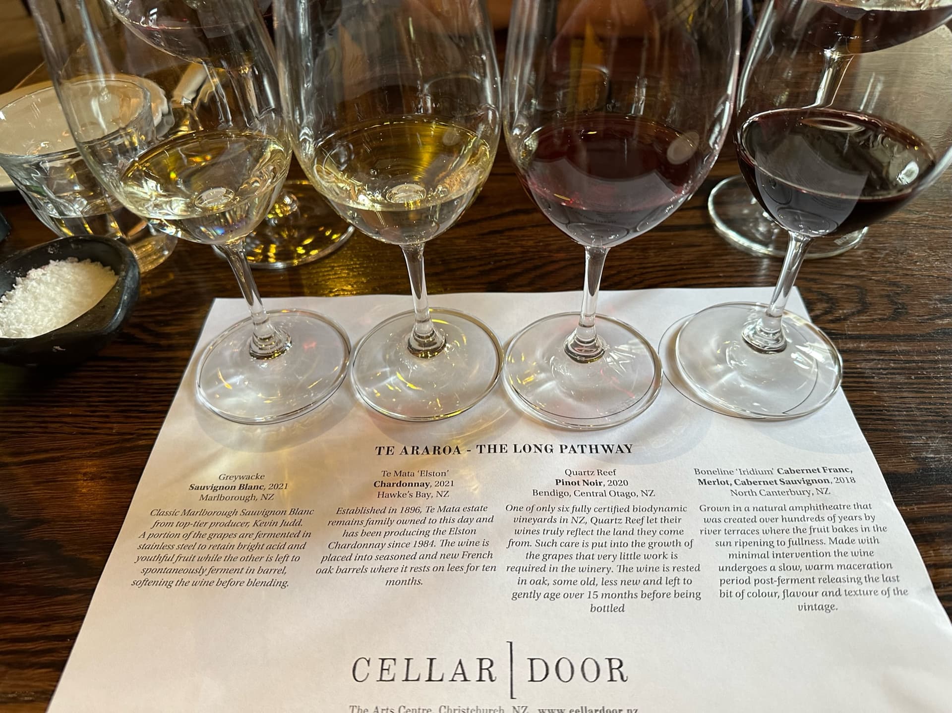 Dinner on Christchurch Day 2 at Cellar Door, which does a ton of wine flights and wines by the glass. Food was very good, a lot of wines by the glass, and here is where you begin to confront that much of NZ Pinot Noir is pretty heavy, tar-inflected samey-samey. Recommended. But they don’t want you to create your own flights on the fly … either order the pre-defined ones or order wines by the glass. Fair enough.