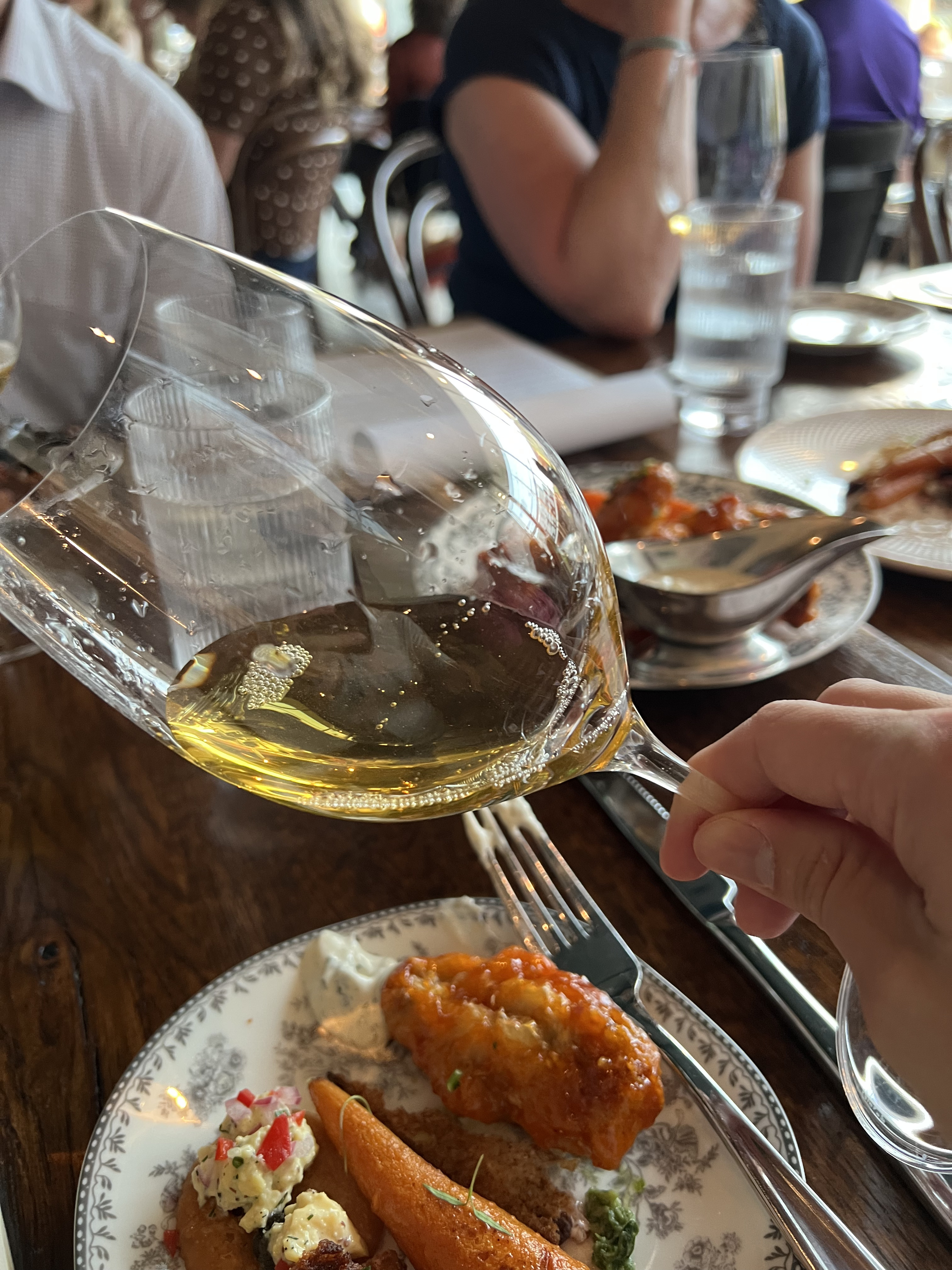 - A clear favorite amongst the group, there was a lot of discussion around what characterizes this as a grand cru, especially when sitting next to a 1er of the same producer. Intense depth, strawberry stem, and quite juicy. What I found interesting was how it was clearly more tannic, with very mild astringency, and yet as Nick put it, it was distinguishable for its “harmony in the mid-palate.” I quite agree. Many sat with this in their glass for quite a long time, and I remember at 30 mins thinking that there was now a layer of red plum that had made its way into the glass. Special stuff, Stan was kind enough to let me take the empty bottle home. I don’t know if I’ll ever see another! Paired quite well with the chicken in cherry sauce with hash brown and mushrooms.