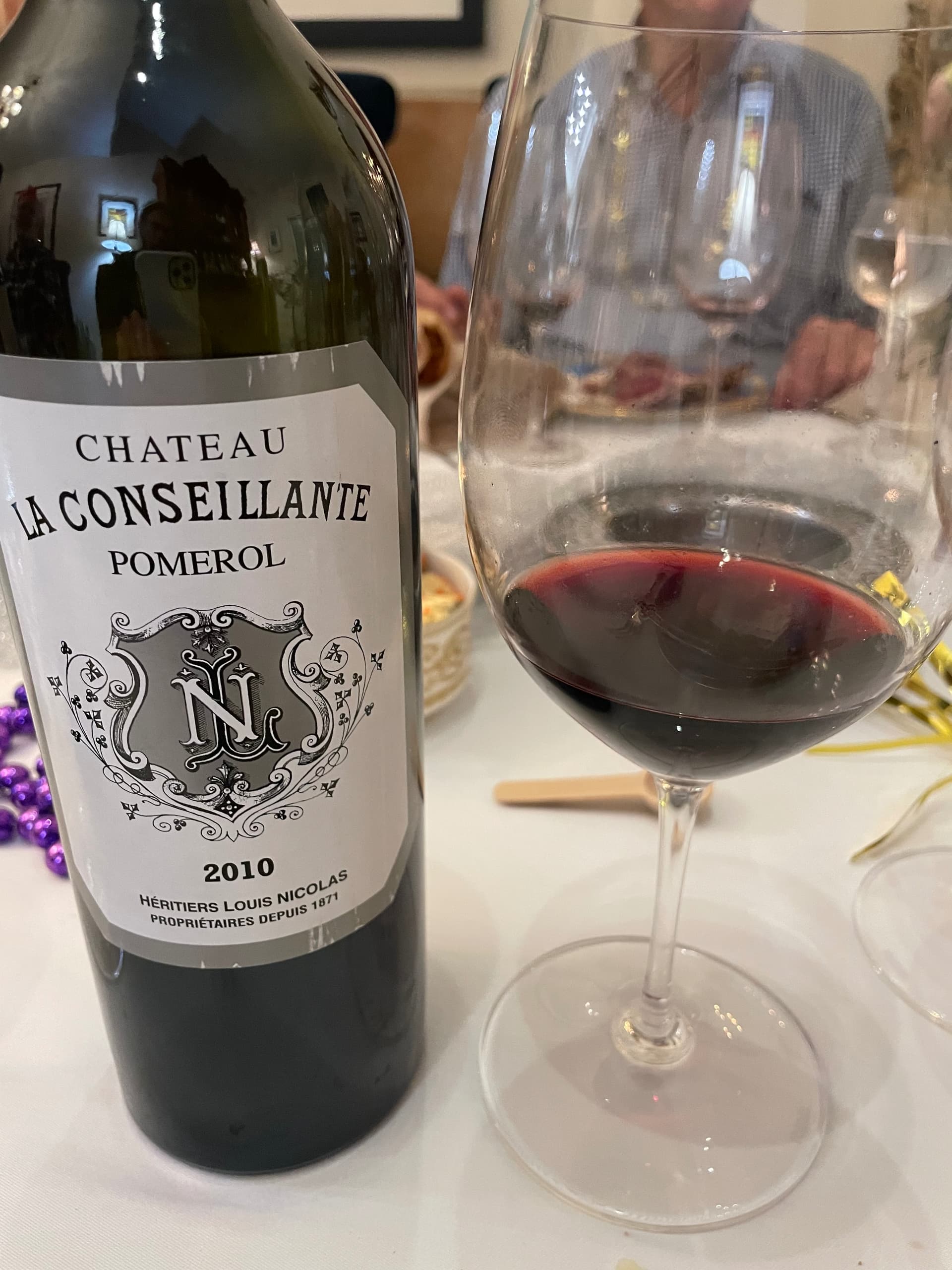 2010 CHATEAU LA CONSEILLANTE POMEROL- blind; the color was a young, dark red purple and the nose offered wondrous aromas of milk chocolate laden black currant and blueberry with accents of wood spice, eucalyptus and cedar in the background; it had marvelous balance, a soft and smooth feel and good depth; I first thought it was a Napa Cab, but kept shifting to Super Tuscan and then Right Bank Bordeaux, but not enough to avoid eventually calling it new world Cabernet. This is comprised of 80% Merlot and has at least 10% Cabernet Franc in the blend.