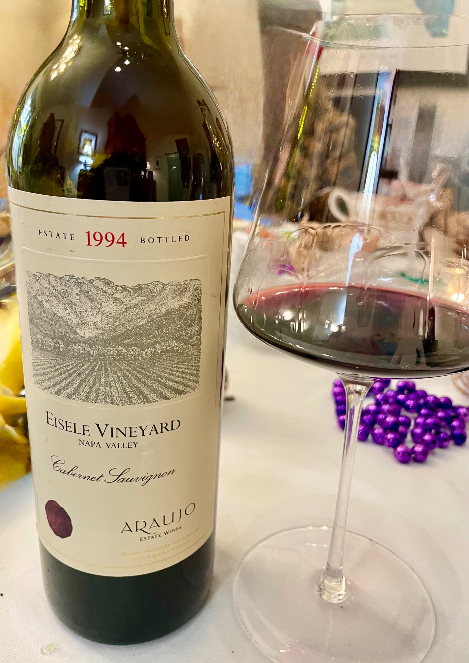 1994 ARAUJO ESTATE EISELE VINEYARD NAPA CABERNET SAUVIGNON- blind; my bring and easily recognized since there was only one other red and the vibrant dark red purple color showed some age relatively; the nose included righteous accents of cedar and spice laden black currant and blackberry, joined by black cherry and plum on the palate; it was full bodied with lots of weight and complexity and some power, but it had lots of finesse to balance it out; I thought it was was good as any of the 1994 Eisele I’ve had; this is comprised of 93% Cabernet Sauvignon Eisele Vineyard, 4% Cabernet Franc Eisele Vineyard and 3% Petit Verdot Eisele Vineyard; for more info: https://eiselevineyard.com/notes/Araujo-Estate-Cabernet-Sauvignon-1994.pdf