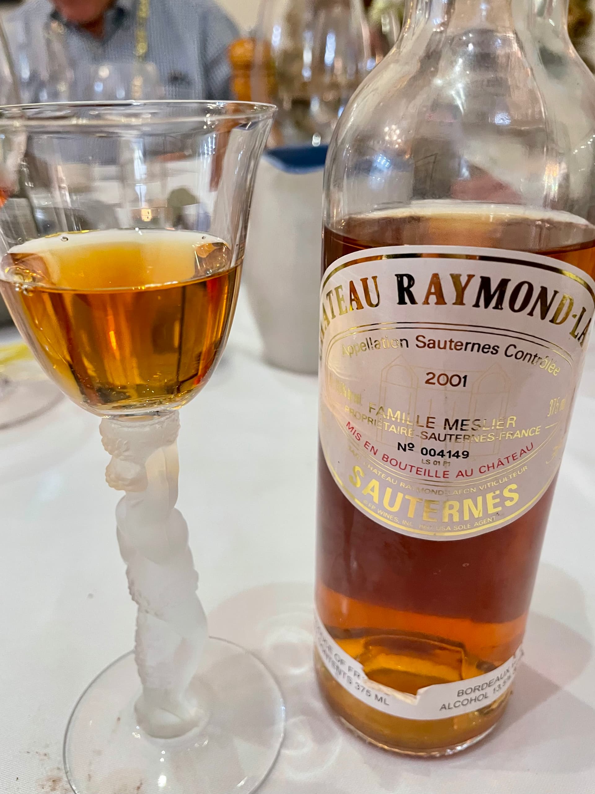 2001 CHATEAU RAYMOND LAFON SAUTERNES in 375 ml- this was another gem from the fantastic 2001 vintage in Sauternes and served to finish off our evening in style, albeit a very sweet style with its butter and honey covered apricot and tangerine fruit delivered in a viscous, thick textured medium that coated the mouth cavity with an ever pleasant film of delight that eventually accompanied the striking of 12 chimes.