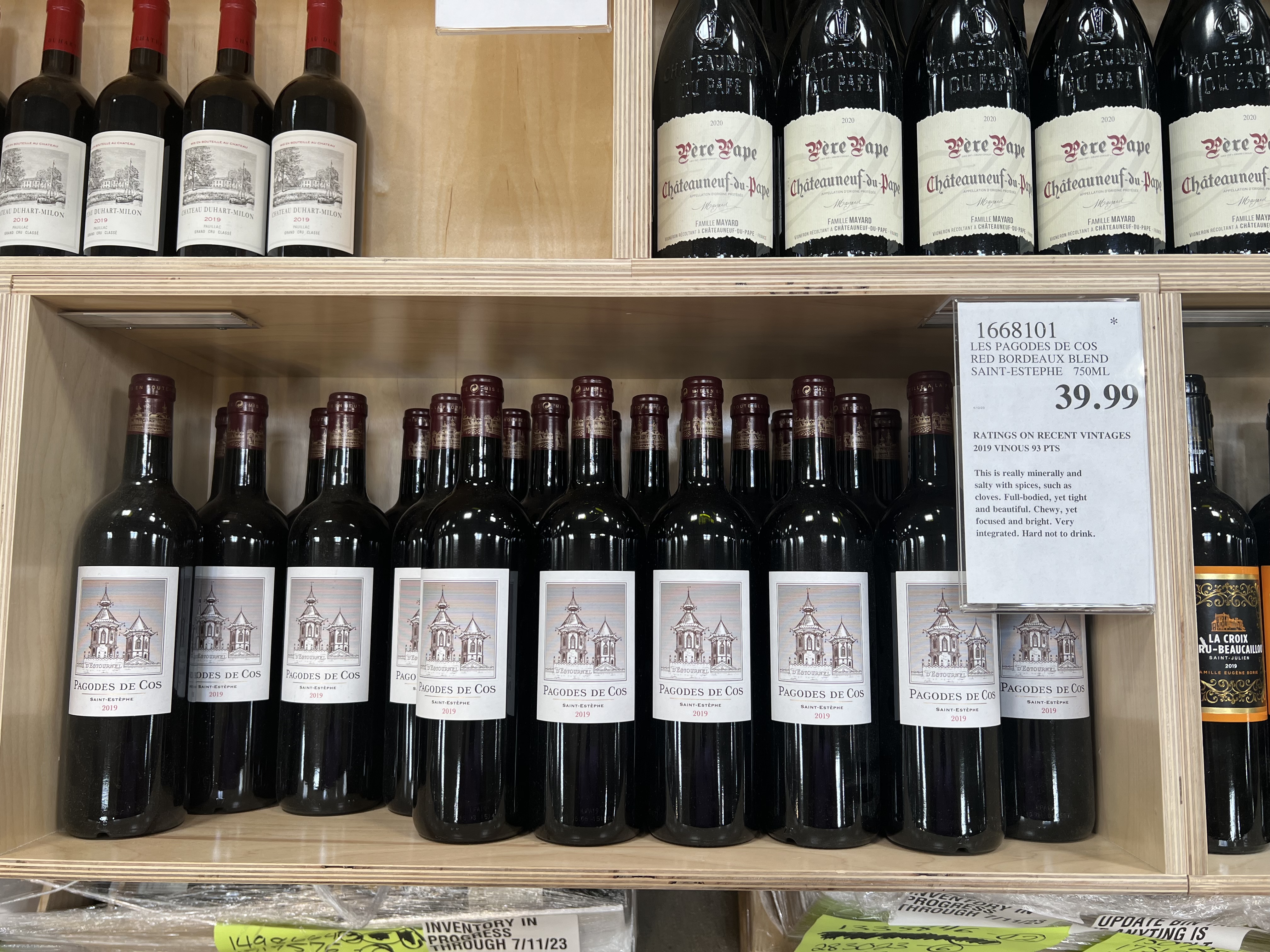 Few 19s left in Boise…Pontet Canet, Alter Ego, Giscours, Malescot, d’Issan, Fleur Cardinale, and Cos d’Estournel. Couple new too, Carbonnieux $35, Grand Tayac $25, Lillian Ladouys $20, Siran $26, and a 6 pack of Palmer at $200 per that is no longer there. Couple others of interest, Produttori Barbaresco, Pedestal Merlot, and some Sordo Barolo.
