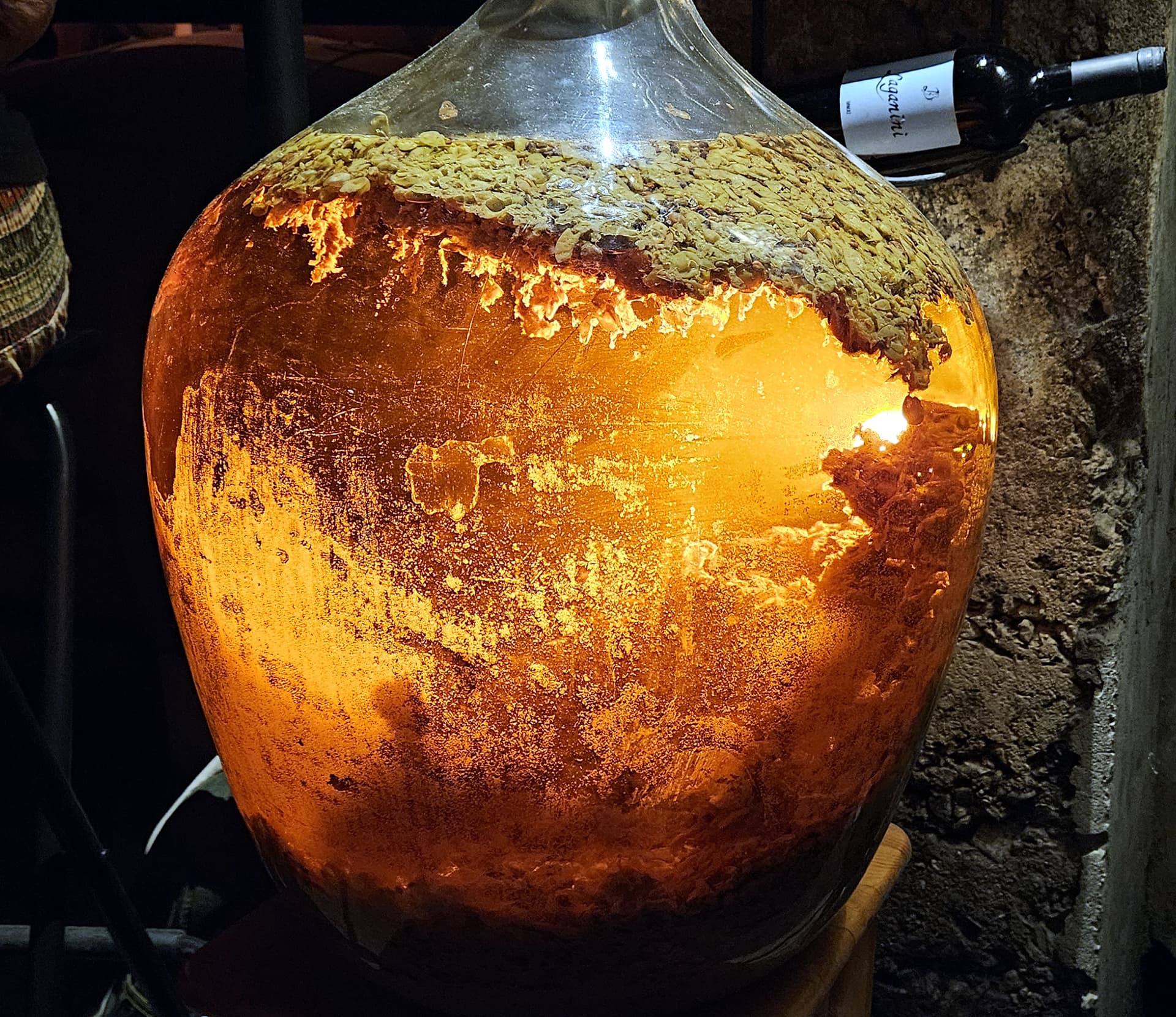 Dubokovic is experimenting with new ideas every year. This is his experiment with extended skin contact - this huge carboy has wine that is passively macerating with the skins for a whole year. We’re about 9-10 months into the experiment now.