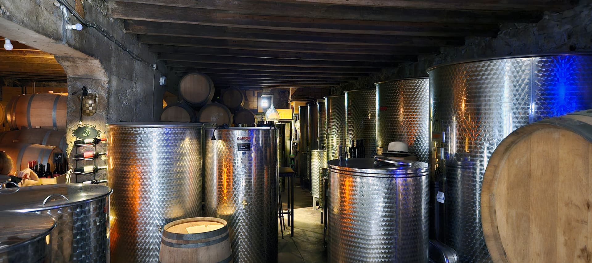 The other side of the cellar is full of stainless steel tanks and some oak barrels.