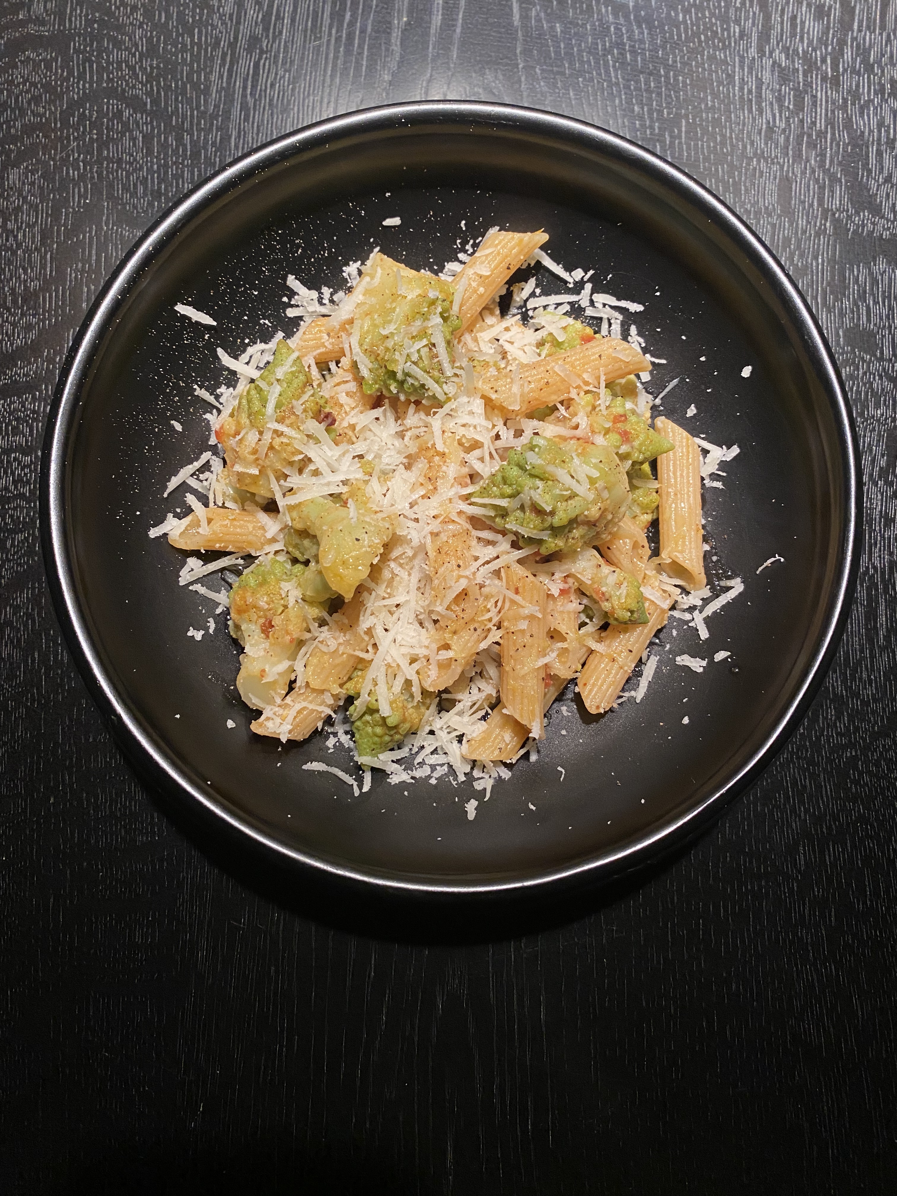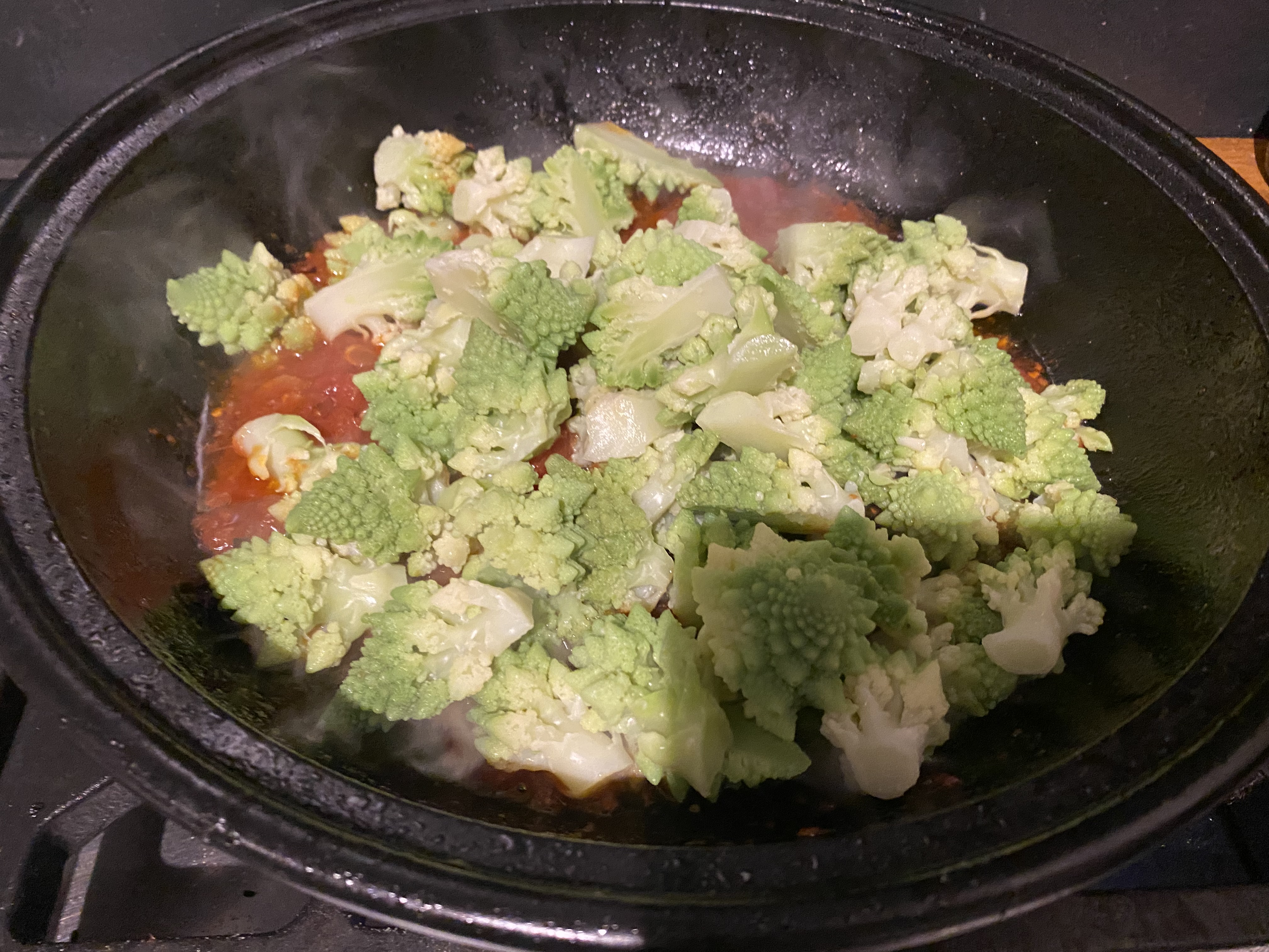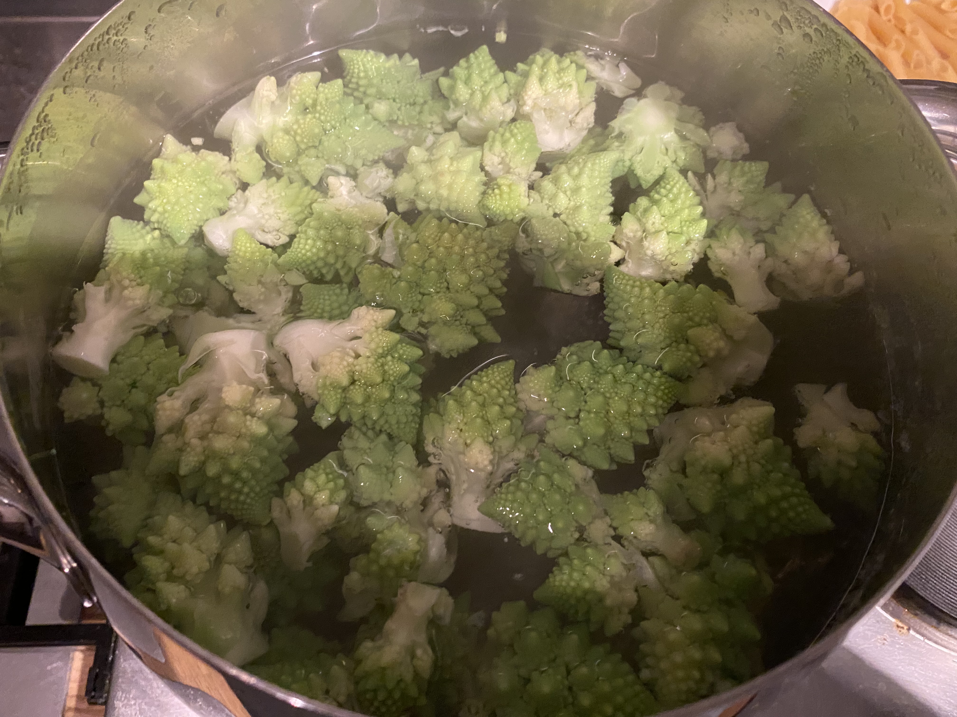 Add broccoli romanesco florets. The bigger florets you can halve. Combine and cook for 4-5min. Remove pasta water and add a dash to the broccoli romanesco when there is not enough liquid in the pot.