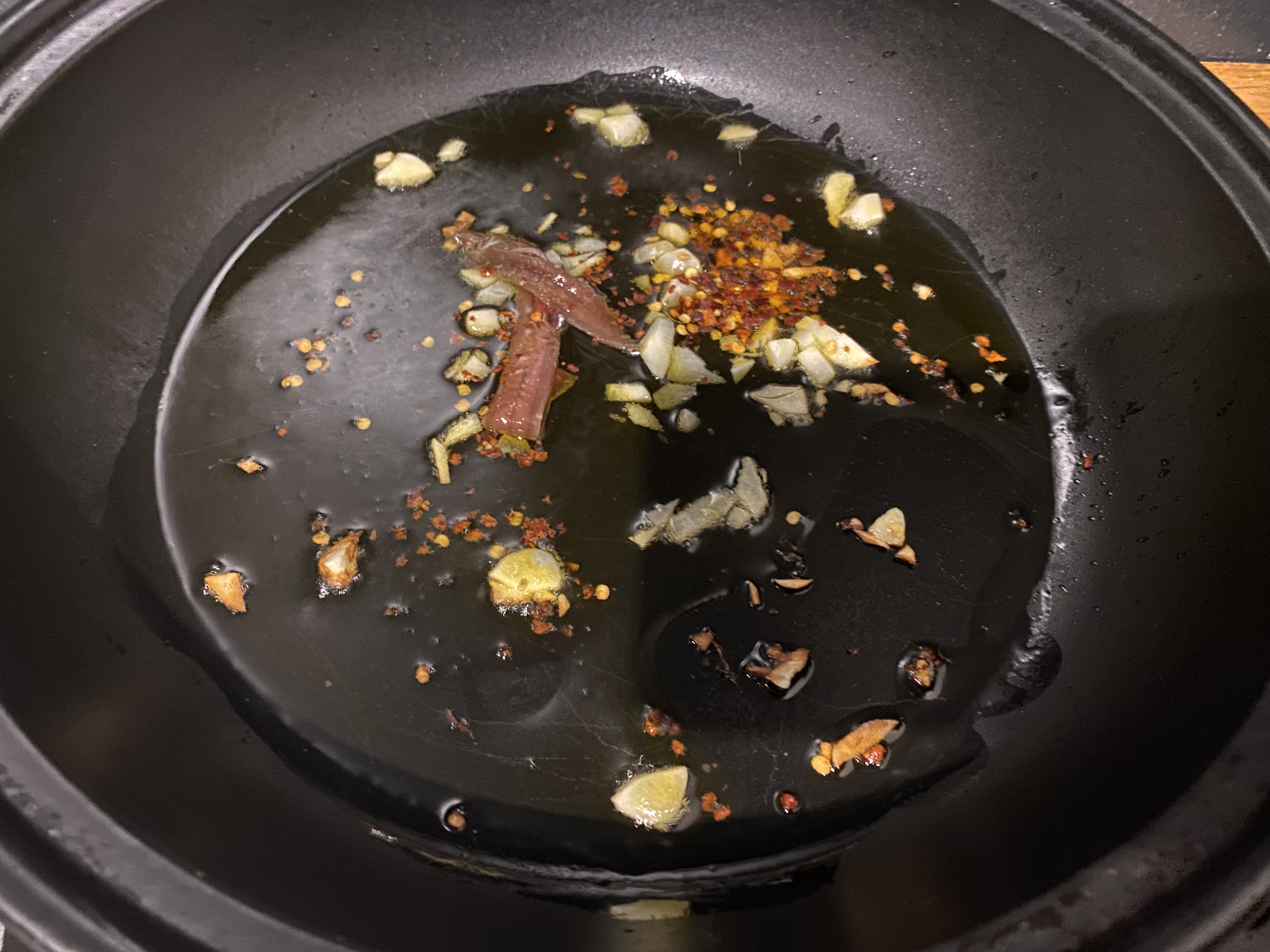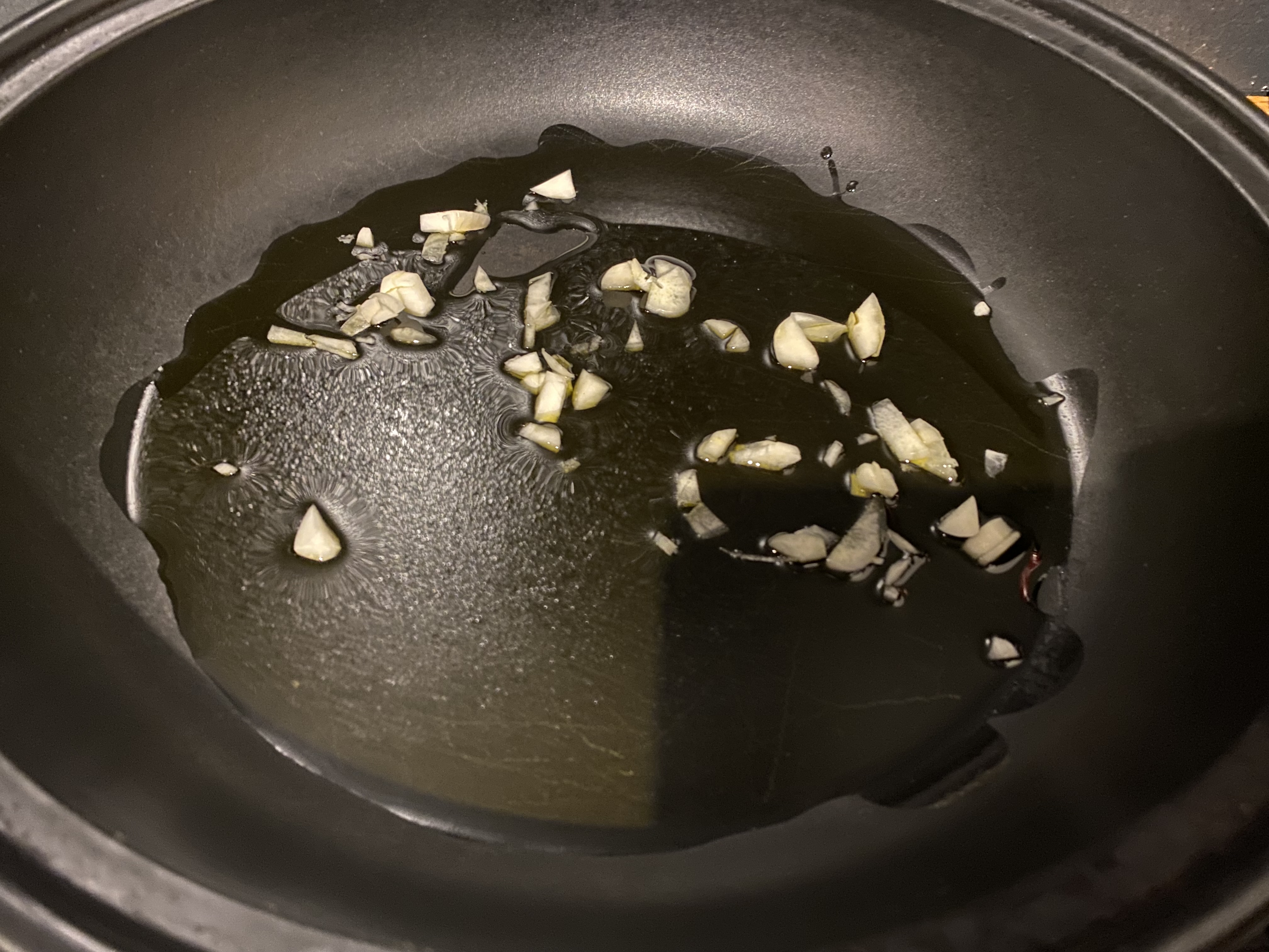 While the pasta is cooking, heat the olive oil in a big pan with sliced garlic. Take care with the heat, the garlic should not look black. Cook for 2-3min.