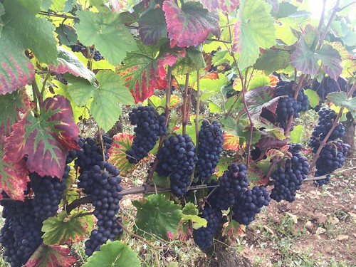 Here are two photos of really high quality Pinot Noir selections growing in the Côte de Nuits. Note the small berries and open cluster architecture. It seems as if the really good selections also tend to go through verasion in a much more rapid, homogeneous way. Selections such as this are both comparatively difficult to destem and much more favorable to whole cluster vinification than the lower-quality selections that we will come to next.