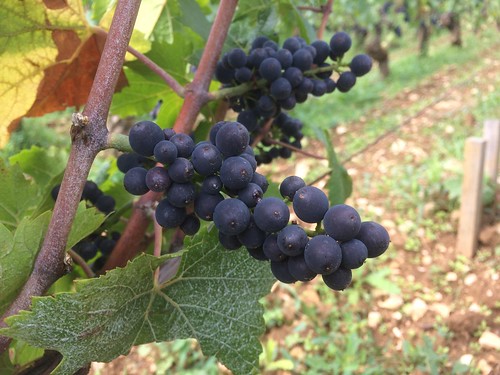 Whereas here is a photo I took in Volnay Santenots in 2017, showing a much more productive Pinot Noir selection, with fatter berries and less open clusters. Obviously compact clusters such as this will be more susceptible to disease (due to poor aeration) and the fatter berries will have a higher juice-to-solids ratio. Typically skins will be thinner, too.