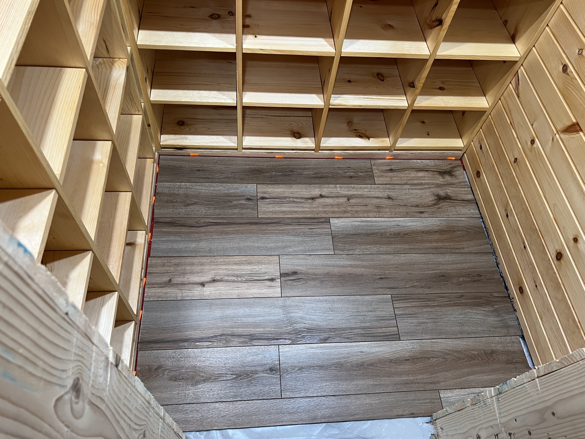 Today’s project was installing vinyl plank flooring in the wine cellar. This is the first time I’ve ever done flooring, so I had a lot of waste at first. But once I got the hang of it, it went in really easy.