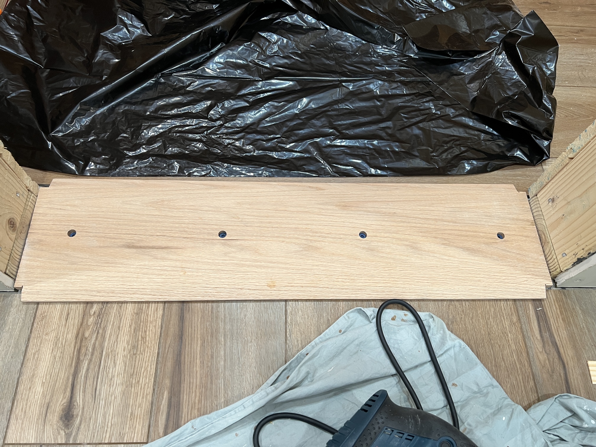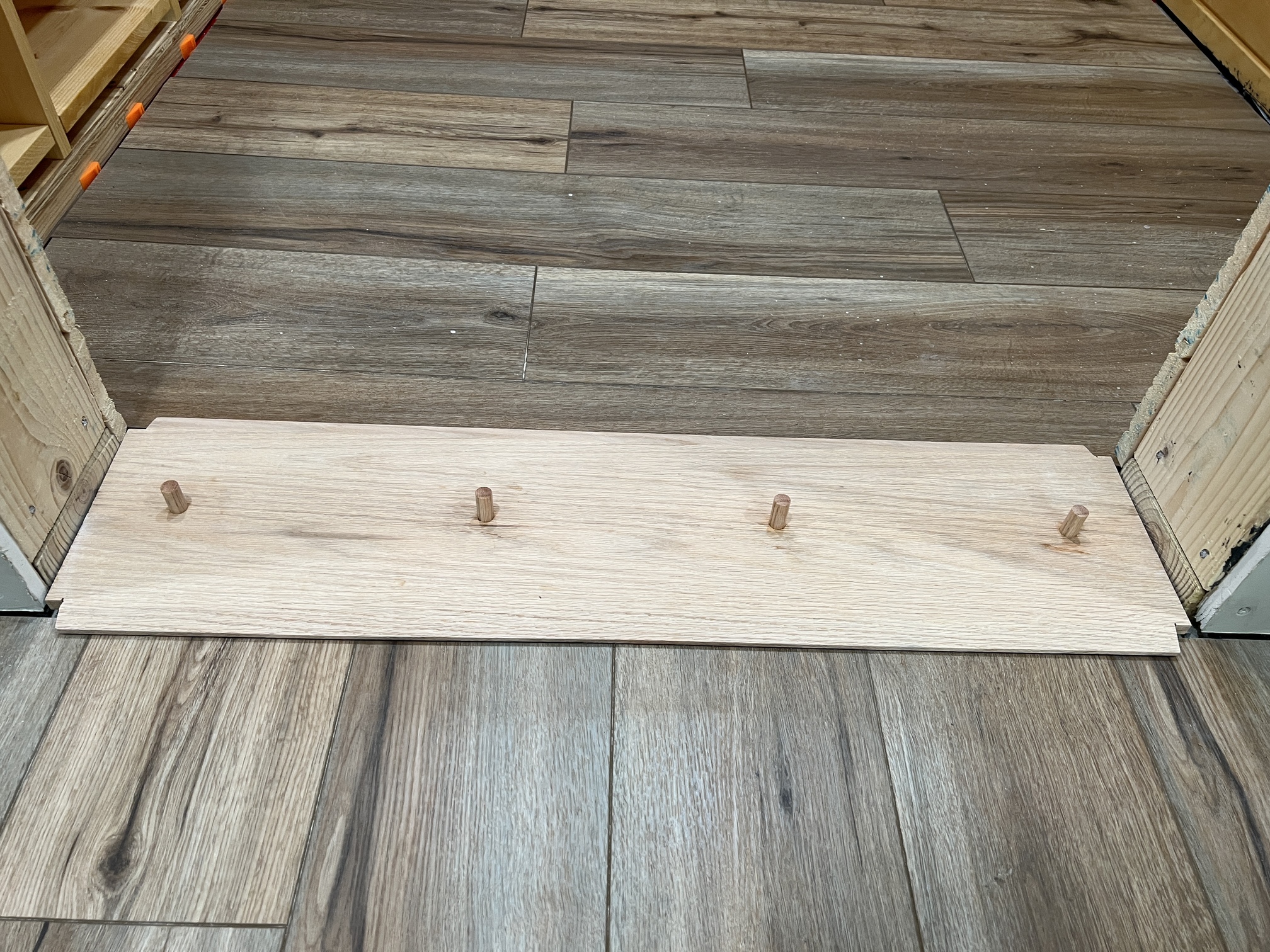 Today was the last work day of this trip. I drilled pilot holes for concrete screws, and drilled counterbore holes so that screw heads are hidden. Then I secured the threshold to the floor with concrete screws and a healthy helping of construction adhesive. Finally, I inserted oak dowels in the counterbore holes and glued them in place. Next trip I’ll cut the dowels flush to the surface and sand smooth.