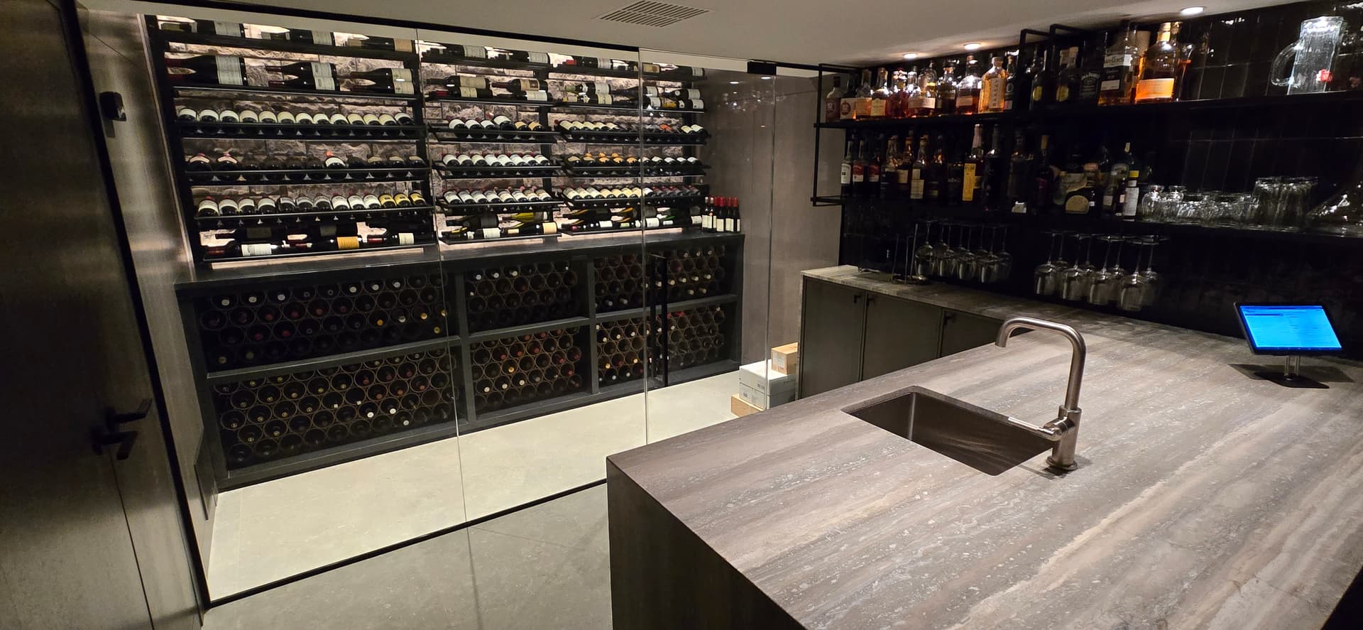 Here are a few pictures of my new cellar. The cellar holds a total of ~700 bottles total with 500 bottles in the lower cabinets and 200 bottles in the racks. The lower cabinet have ~250 four inch tubes that are 21 inches long. They are big enough to be double deep and hold pretty much any 750ml bottle that I own.