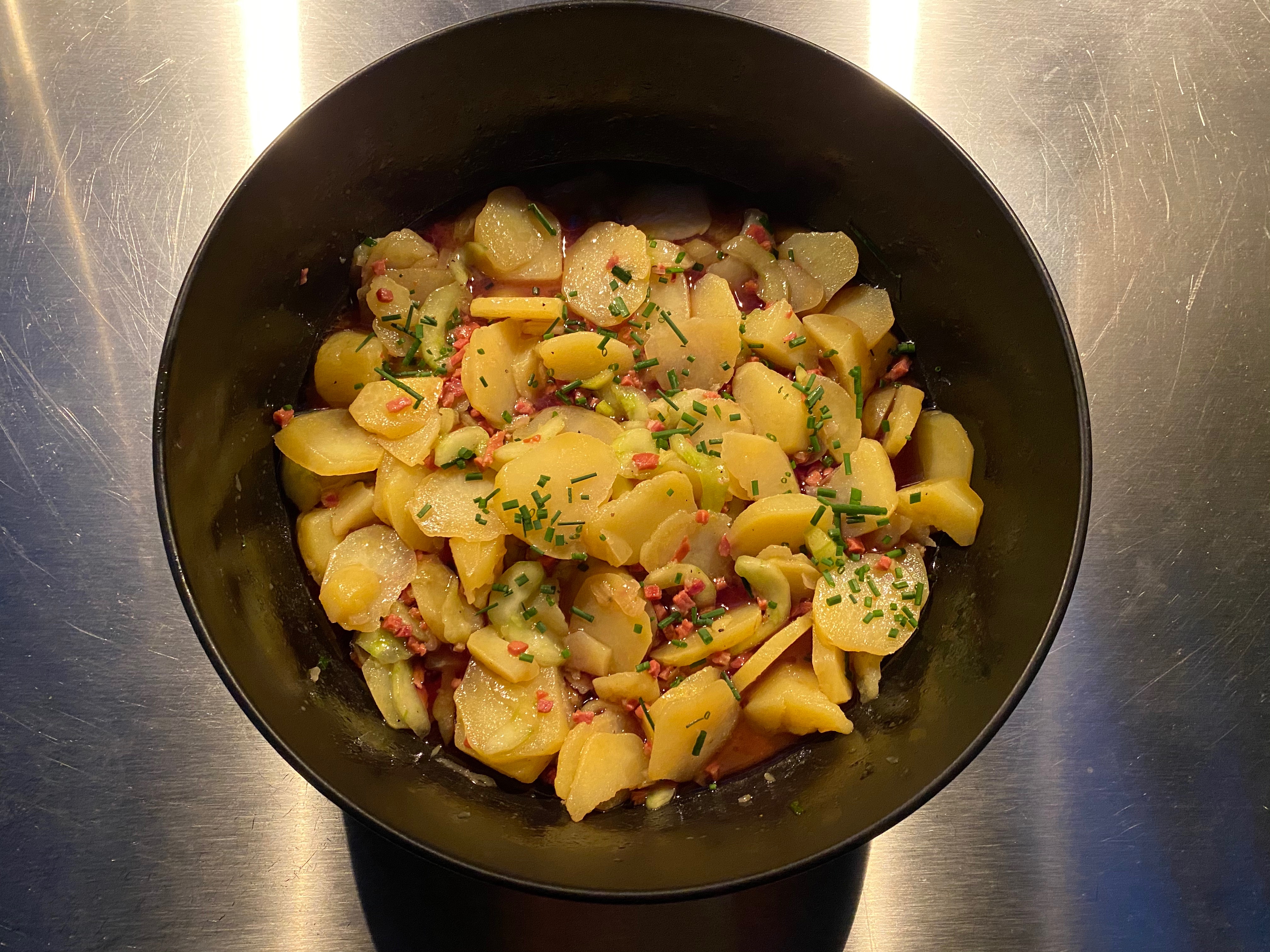 Here comes a classic potato-cucumber salad from Austria. A recipe by the famous austrian-german cook Johann Lafer. You can serve it lukewarm or cold to meat, classic would be Wiener Schnitzel, or fish and seafood.