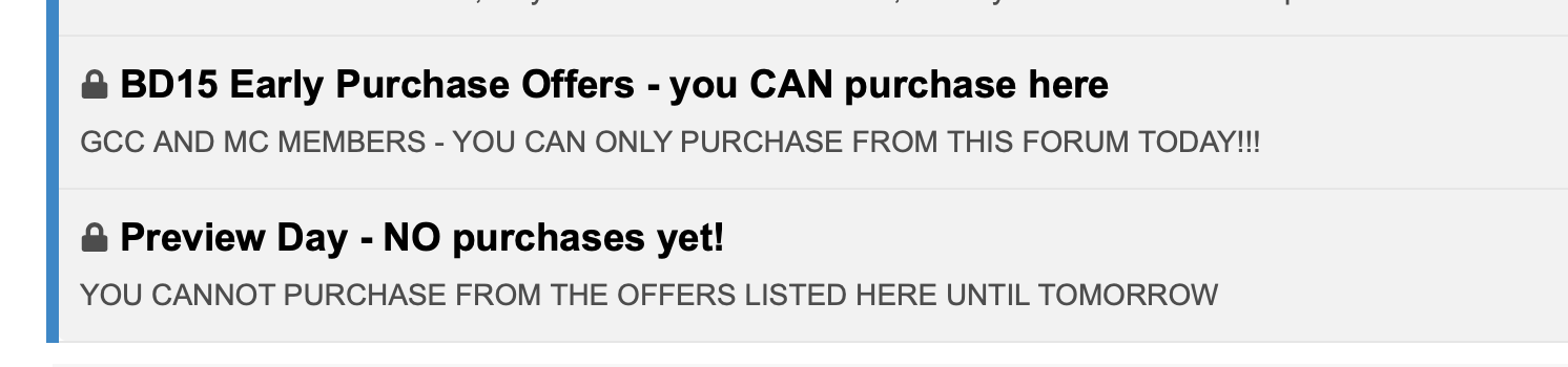 I thought the early purchase offers were special offers for GC and MC members, and didn’t realize that they were just the same BD offers available early. I was not confused at all about the preview forum.