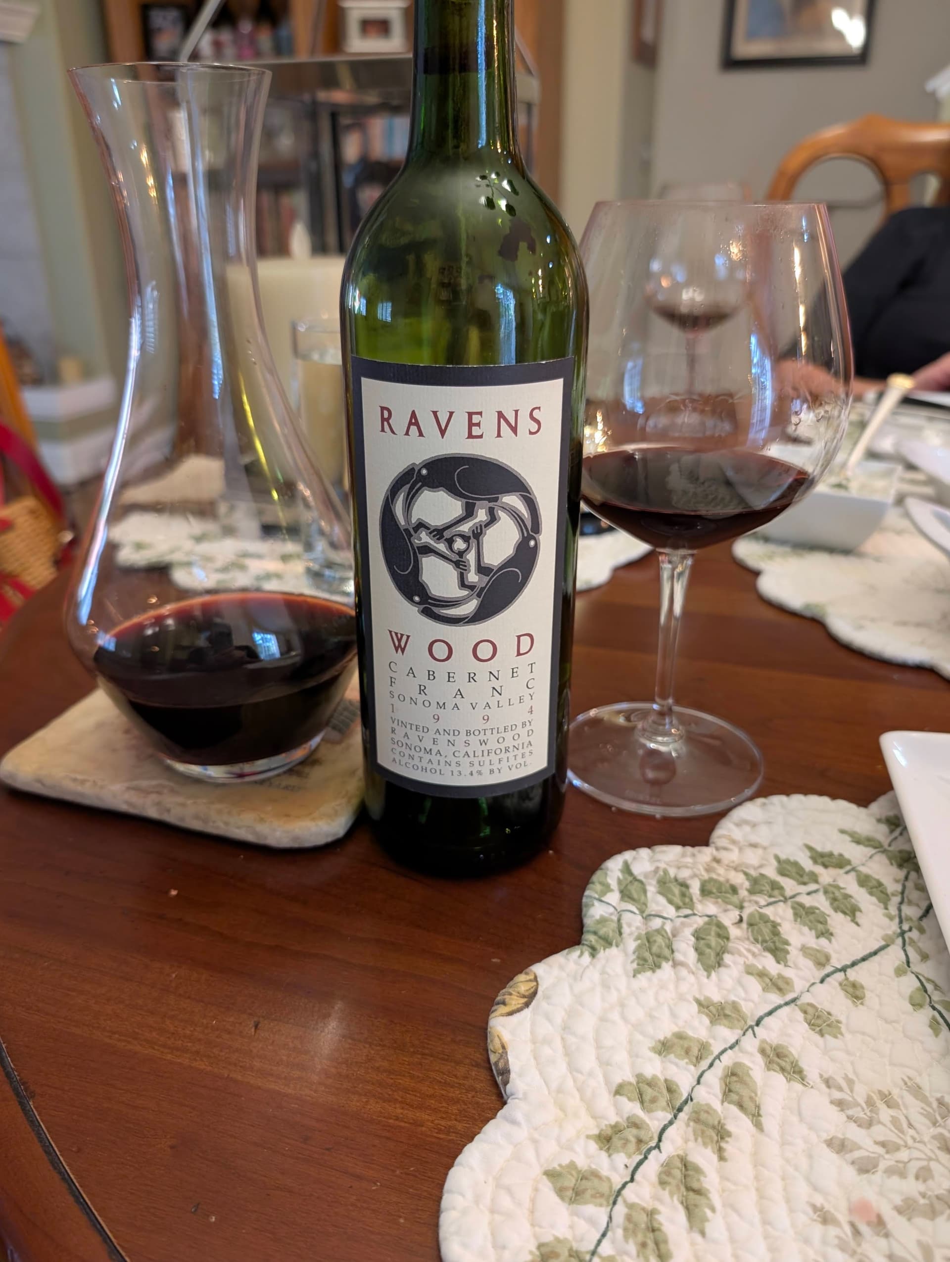 1994 Ravenswood Cabernet Franc Sonoma Valley: Decanted for 1 hour and consumed over 3 hours. Cork came out relatively easy and was in great shape. Aroma of dark cherry-cassis fruit, fennel and earth.