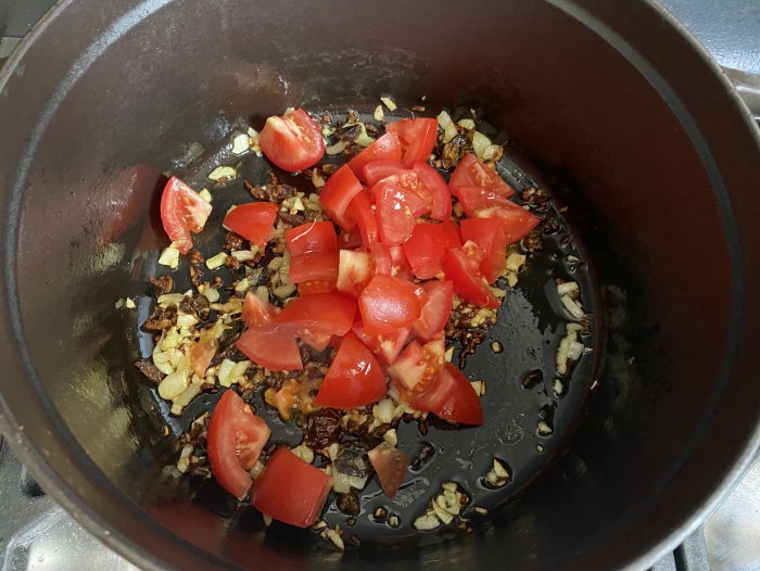 Cook the chopped onion and garlic softly in olive oil until translucent in a Le Creuset/Staub cocotte. Pre-heat the oven to 200 C or 400 F
