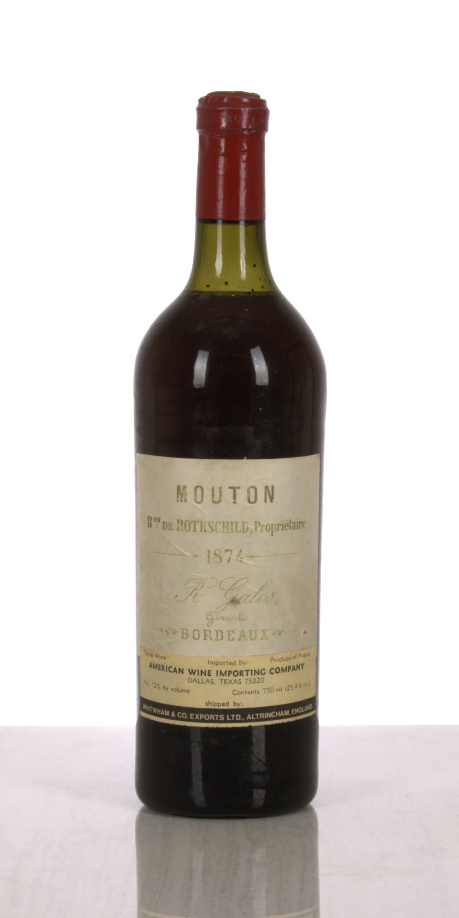 The 1874 Mouton Rothschild has an older, partially faded label. The fonts on that label appear to match the original one in use on the 1874 vintage Mouton labels. There is a long solid red capsule on this wine which, from its appearance, did