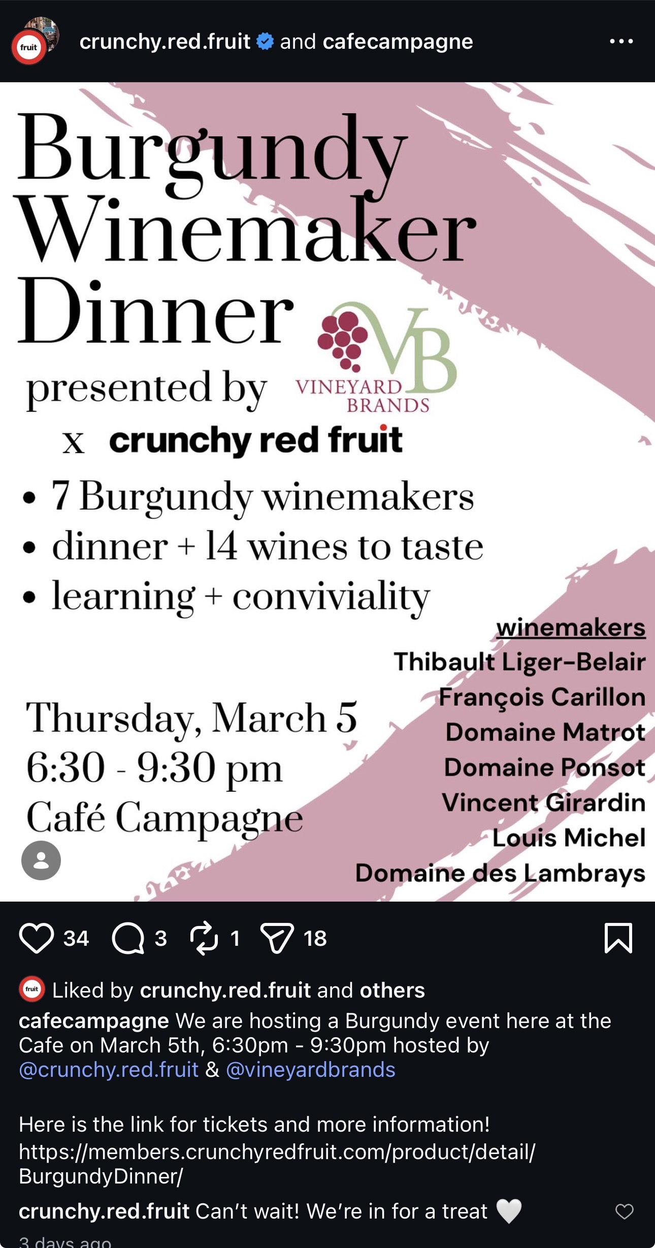 Thanks again for flagging this! I attended and greatly enjoyed the evening. The dinner was relocated from Cafe Campagne to Maximilien due to a plumbing emergency. My delight was meeting the wine growers in person and hearing them talk about their wines. Fifteen wines were presented. “Best in Show” for me–considering style, quality, and value–was Thierry et Pascale Matrot Bourgogne Chardonnay 2022. My other favorites were Vincent Girardin Cremant de Bourgogne Extra-Brut Blanc de Blancs NV and Domaine des Lambrays Morey-Saint-Denis 1er Cru “Les Loups” 2021. Big thanks and appreciation to Crunchy Red Fruit and Vineyard Brands for organizing the dinner and to Maximilien for hosting.