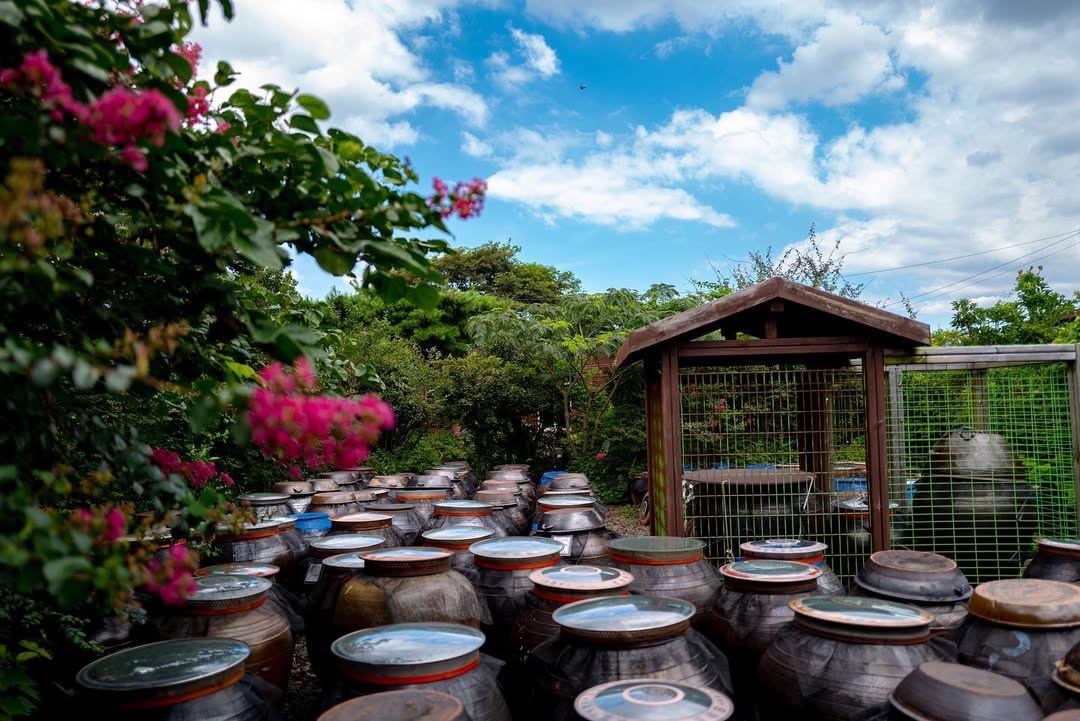 All of these pots have different sauces, mostly soy sauce, doenjang (soy bean paste, similar to miso), and gochujang (hot pepper paste). They are left outside year round.