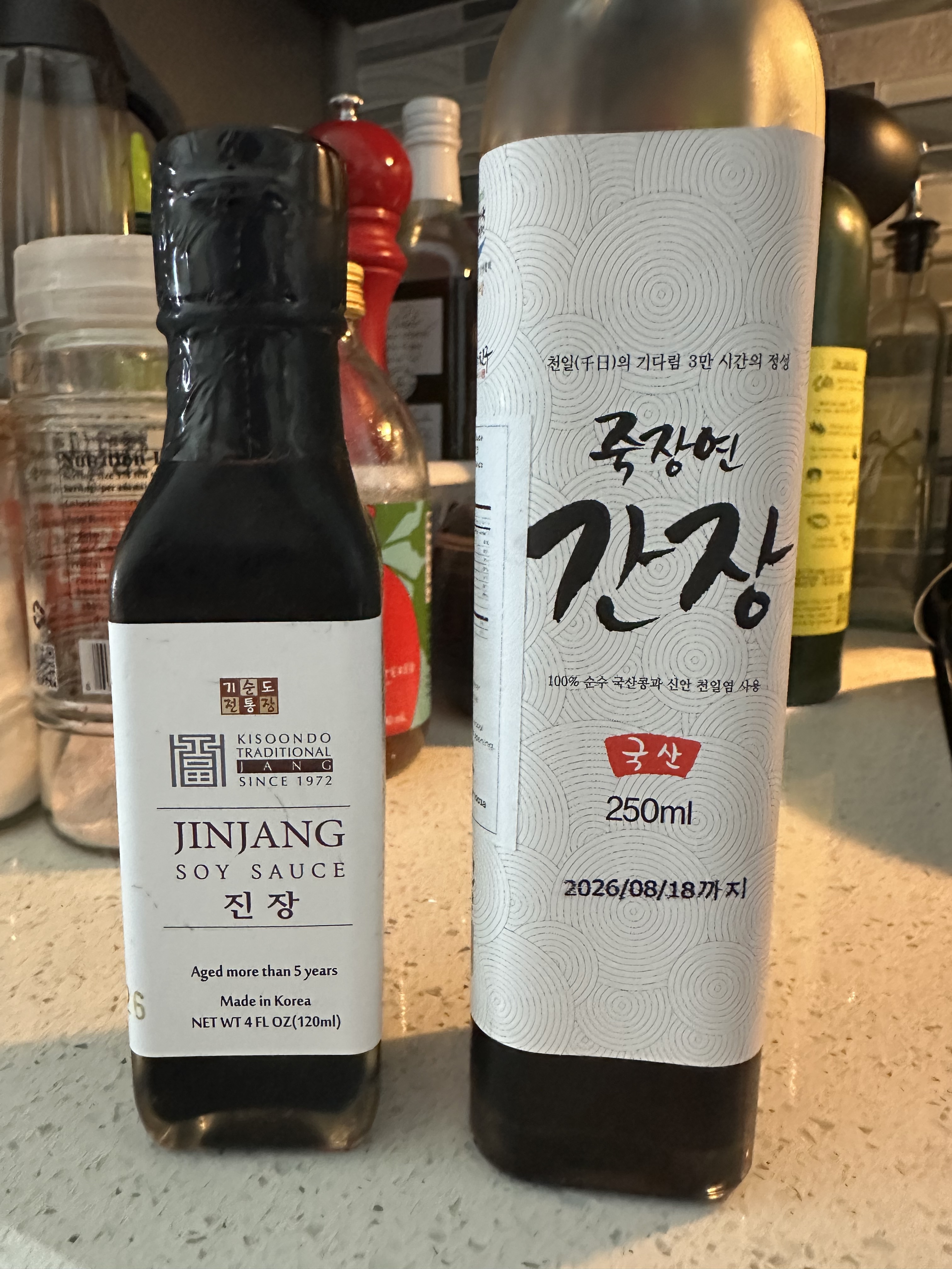 In the second picture, those are our more premium soy sauce—we used the one on the right for bulgogi last night.
