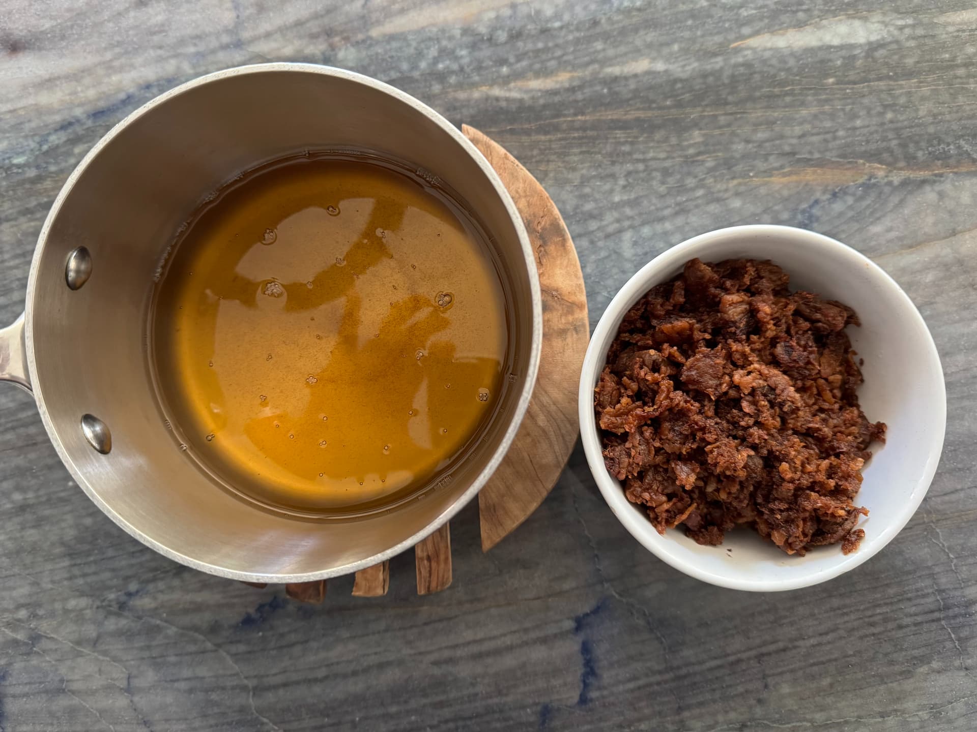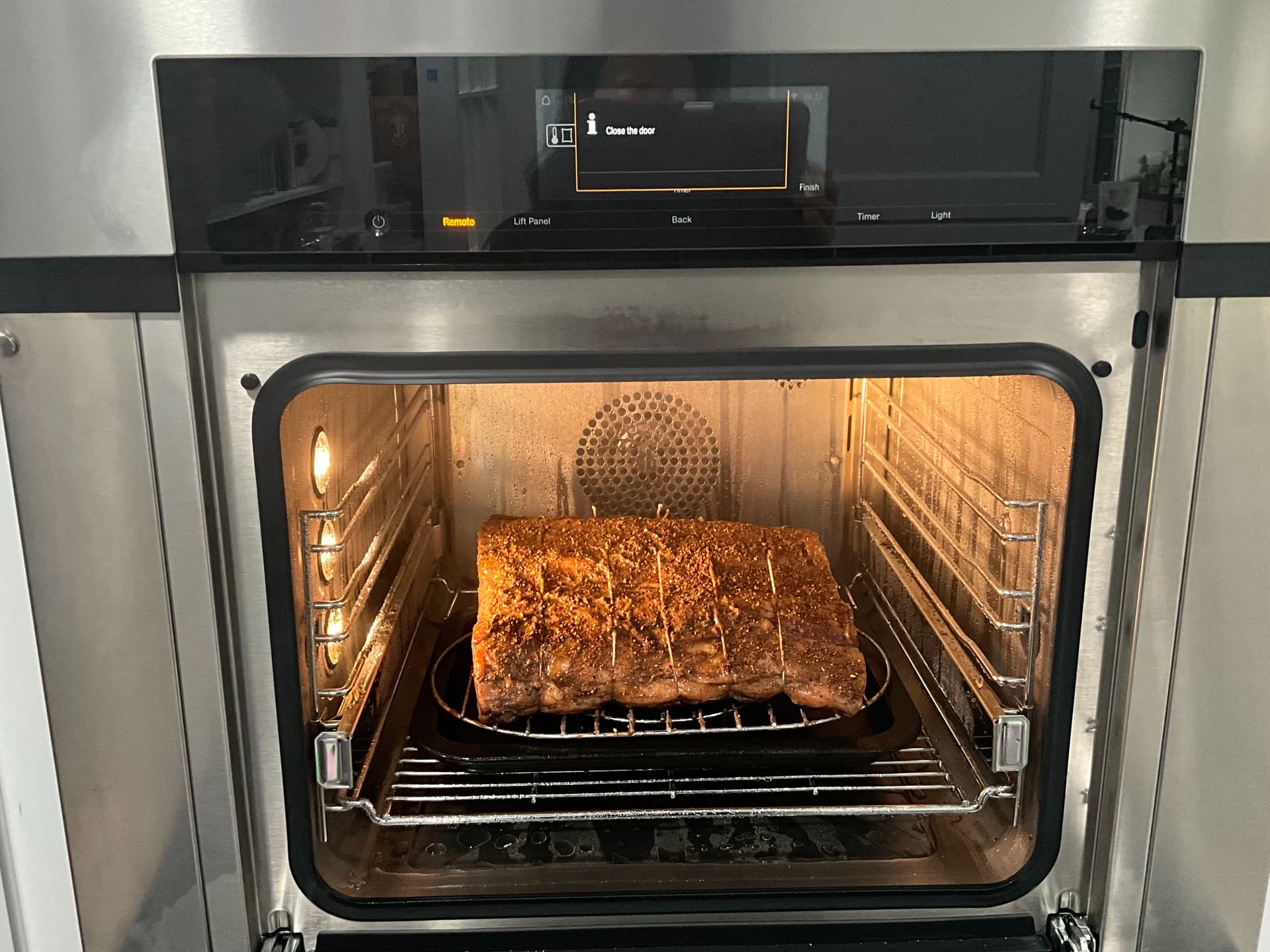I used a hand blender to mix the koji and black garlic cloves, then slathered the whole thing and put it on a rack, uncovered in the fridge for 2 days. after I coated it with the roughly ground peppercorns, I put it in the steam oven to sous vide for 7 hours at 130F. I rendered all the fat trimmings and ladled scorching hot tallow over the roast to start the crust. The roast was then pooped back into a 475F convection oven for 5 minutes just to finish it all off.