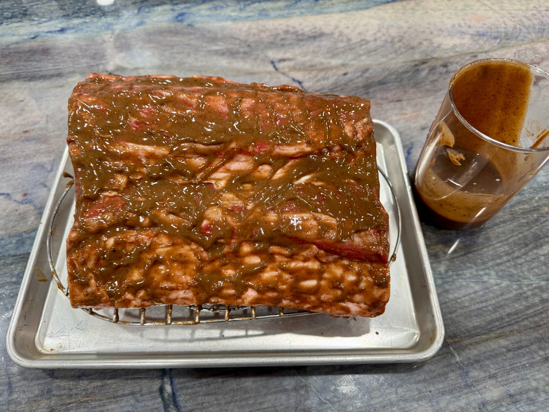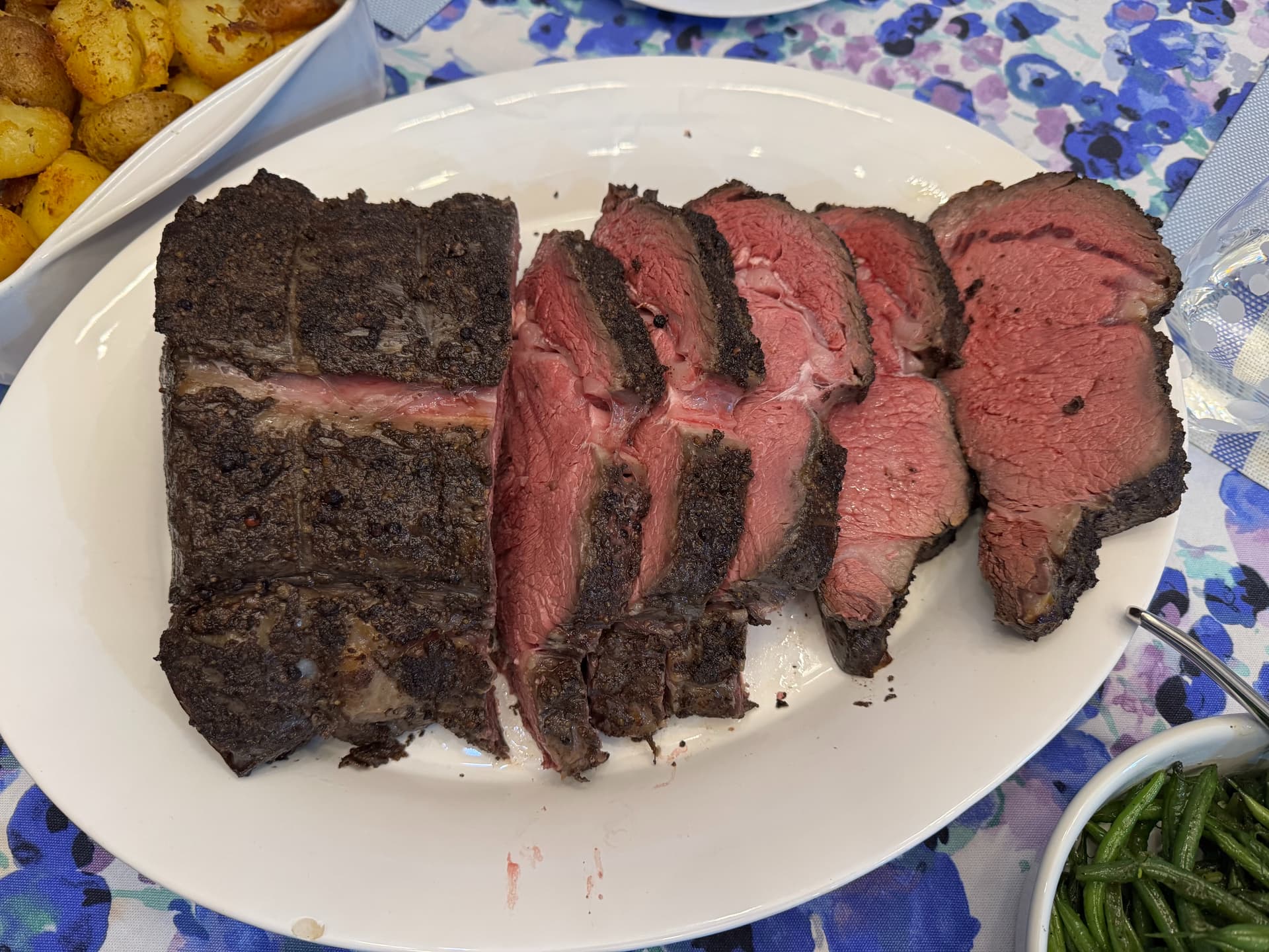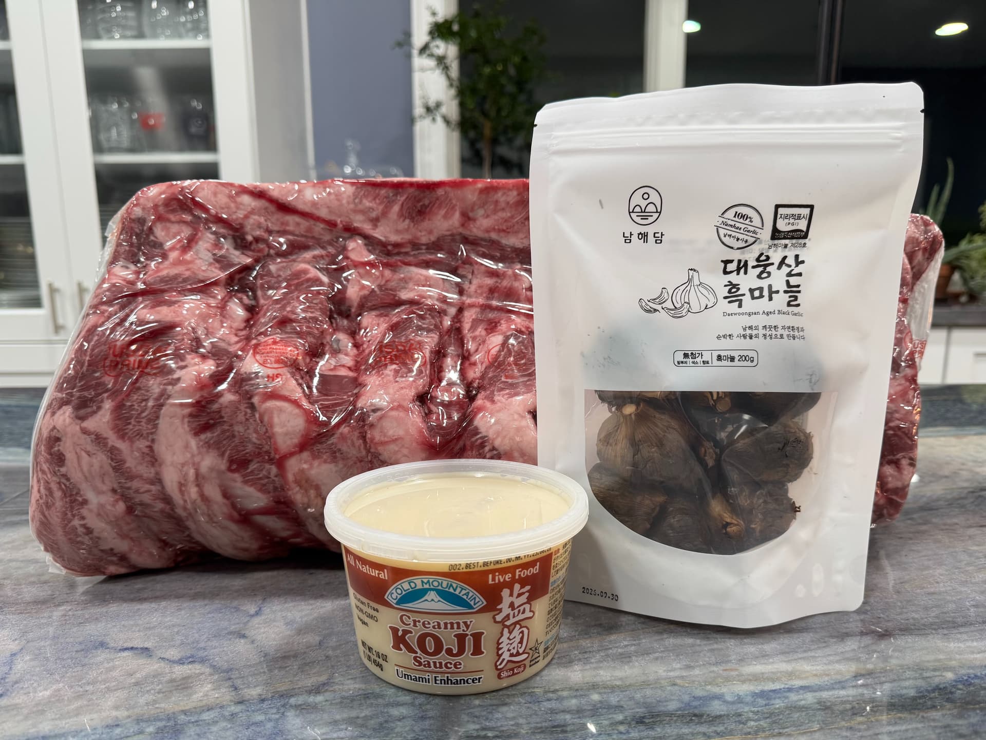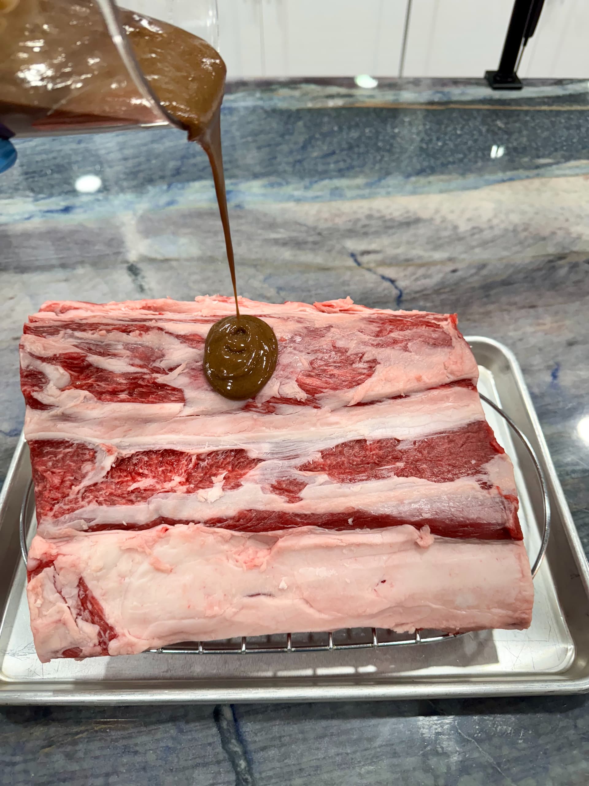 The best prime ribs I’ve ever made were shio koji marinated. I saw a video where they added black fermented garlic to the shio koji, plus hot Korean mustard and then coated it with a spice rub of shio kombu and various peppercorns. Knowing that Max loves garlic but not sure how his teenaged friends would like a bunch of uncommon funky flavors, I opted to just use shio koji and black garlic marinade and pink and black peppercorns for the crust.