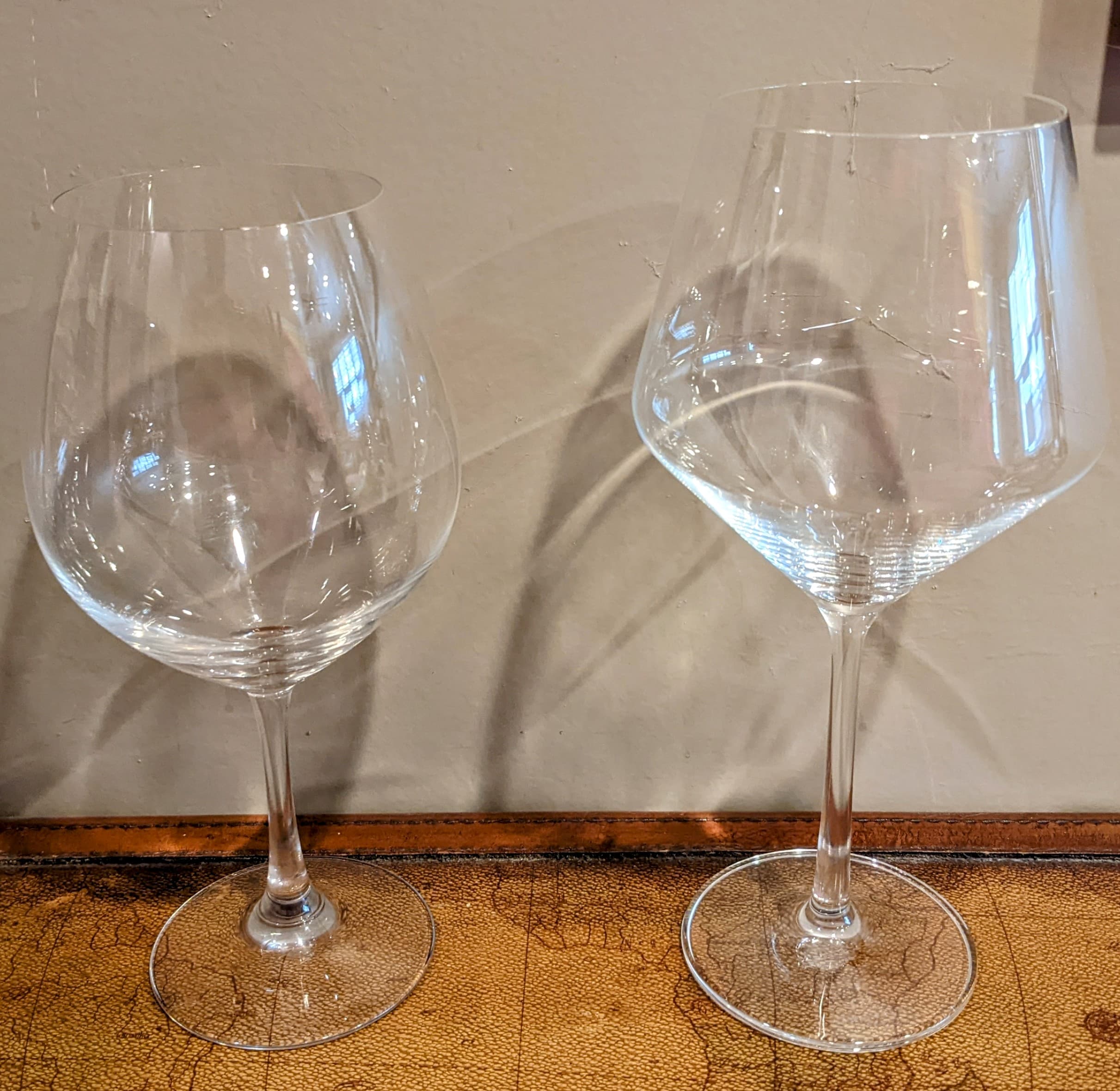Burgundy: again, Spiegalau on left, SZ on right. Here, I’m not sure if the SZ are anything like what OP is considering. These Zwiesel Glas (the new brand SZ had adopted) in their (I think) Chime lineup. I like Spiegelau’s far more - they occupy less table / counter real estate, I prefer rounded geometry, and they feel more refined. The ones on the right have a crease on the stem, a lip on the base. The rims of the bowls, on both, are smooth and crisp, but the SZ might be ever so slightly thicker. It’s not something I’d measure with a caliper, but a person looking/feeling closely, might notice.