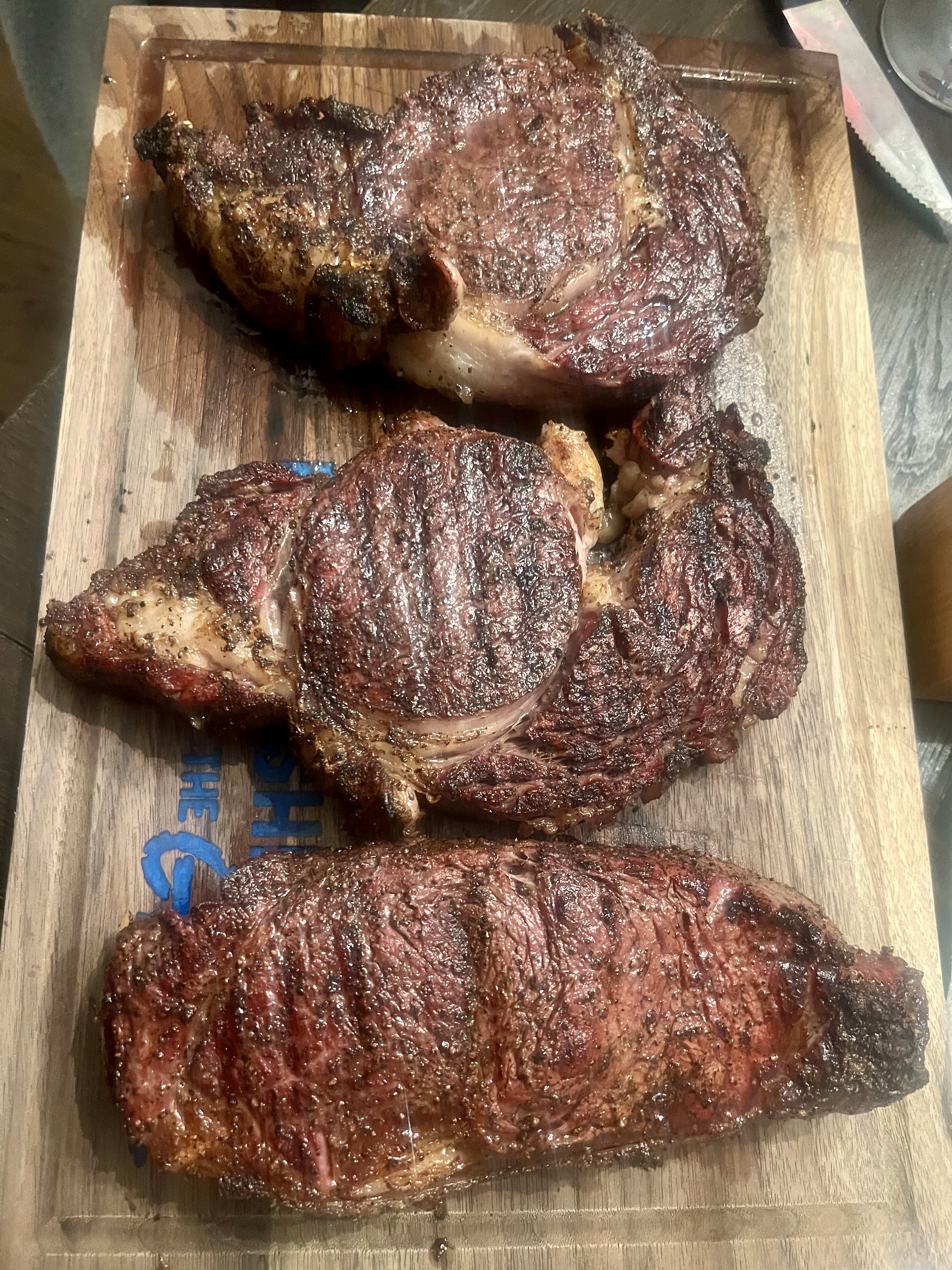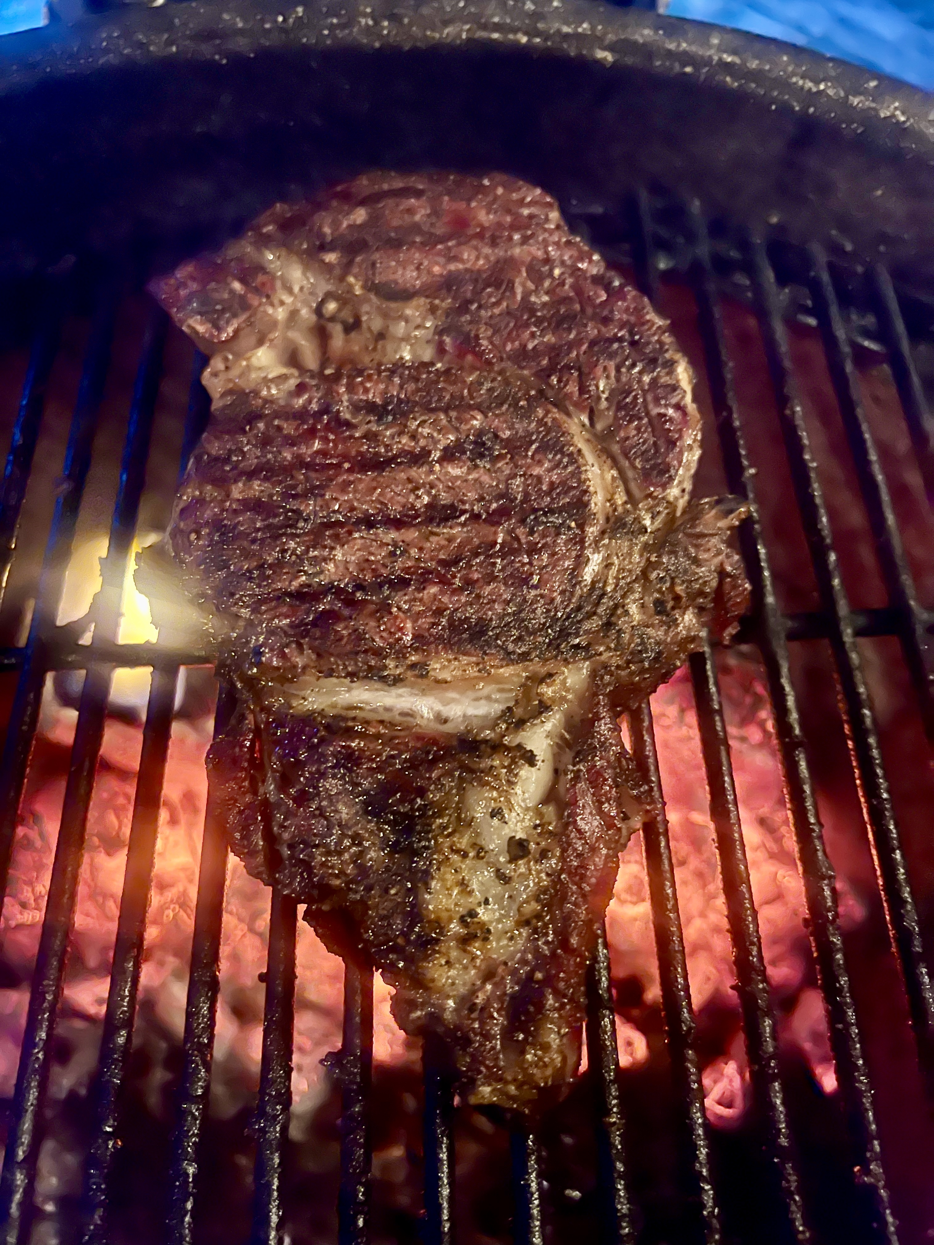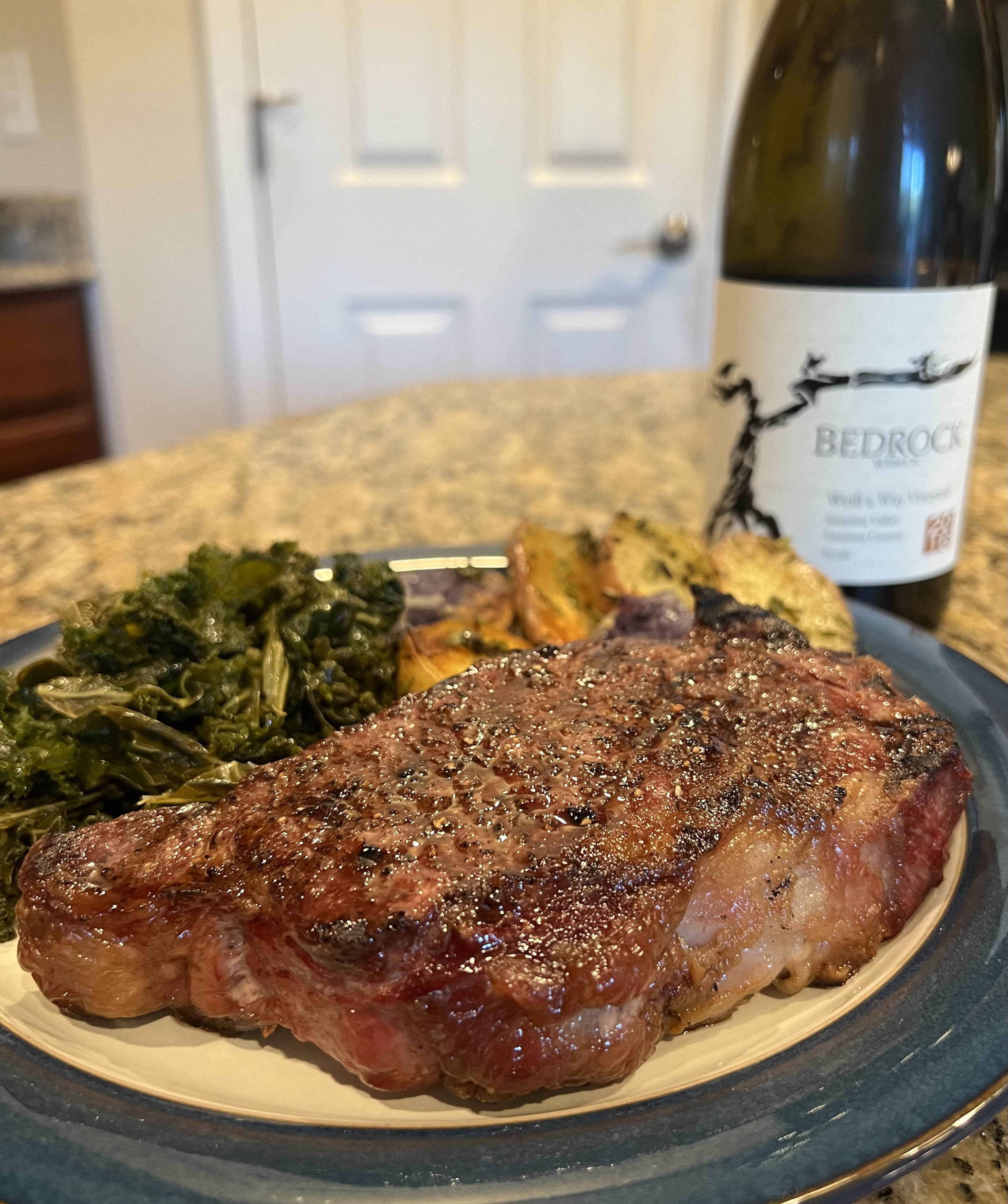 Flannery ribeye on the Weber kettle over lump charcoal, paired with a 2016 Bedrock Weill a Way Syrah.