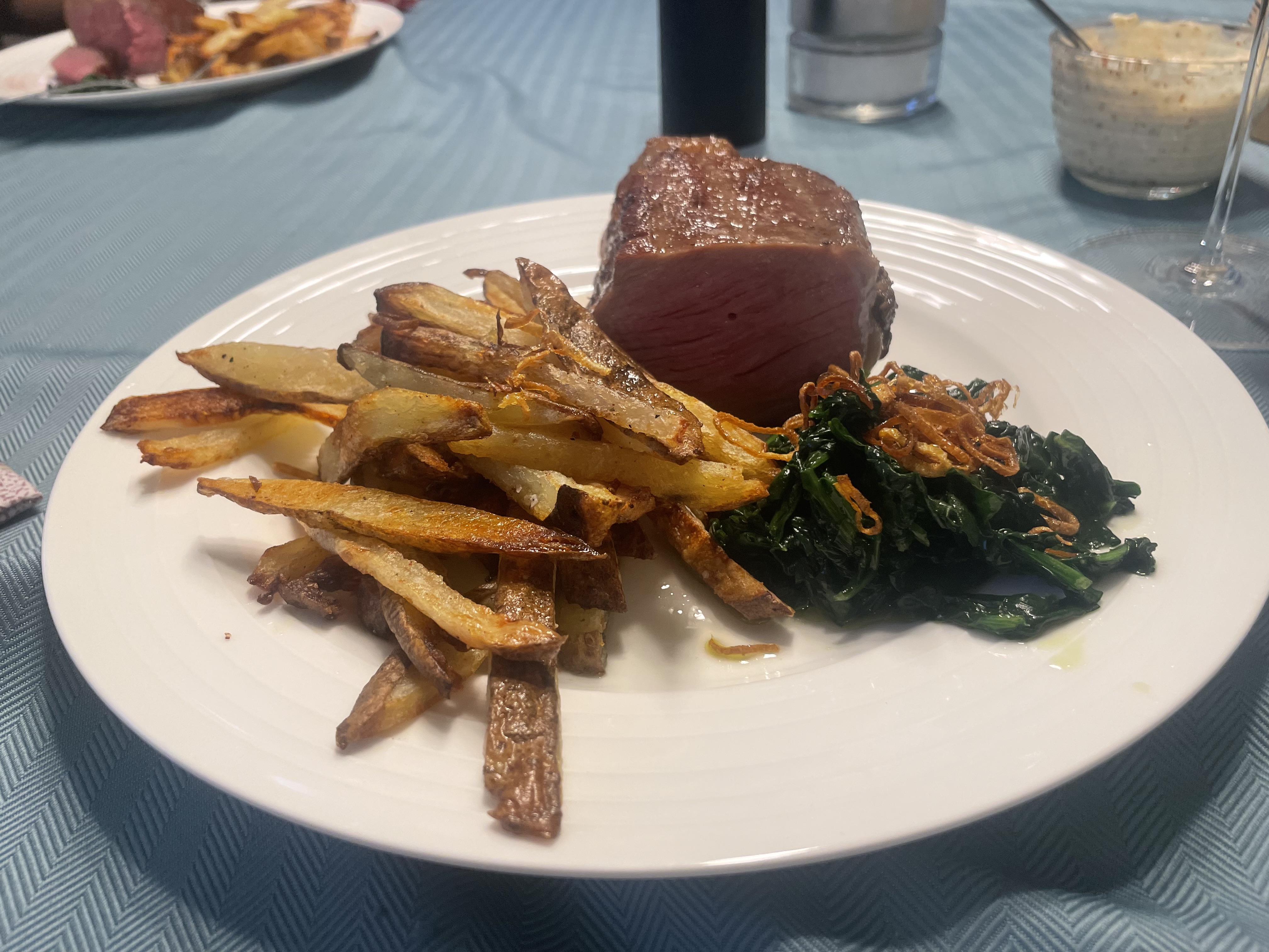 Flannery NY with some oven fries and spinach sautéed in shallot oil with crispy shallots sprinkled on top.
