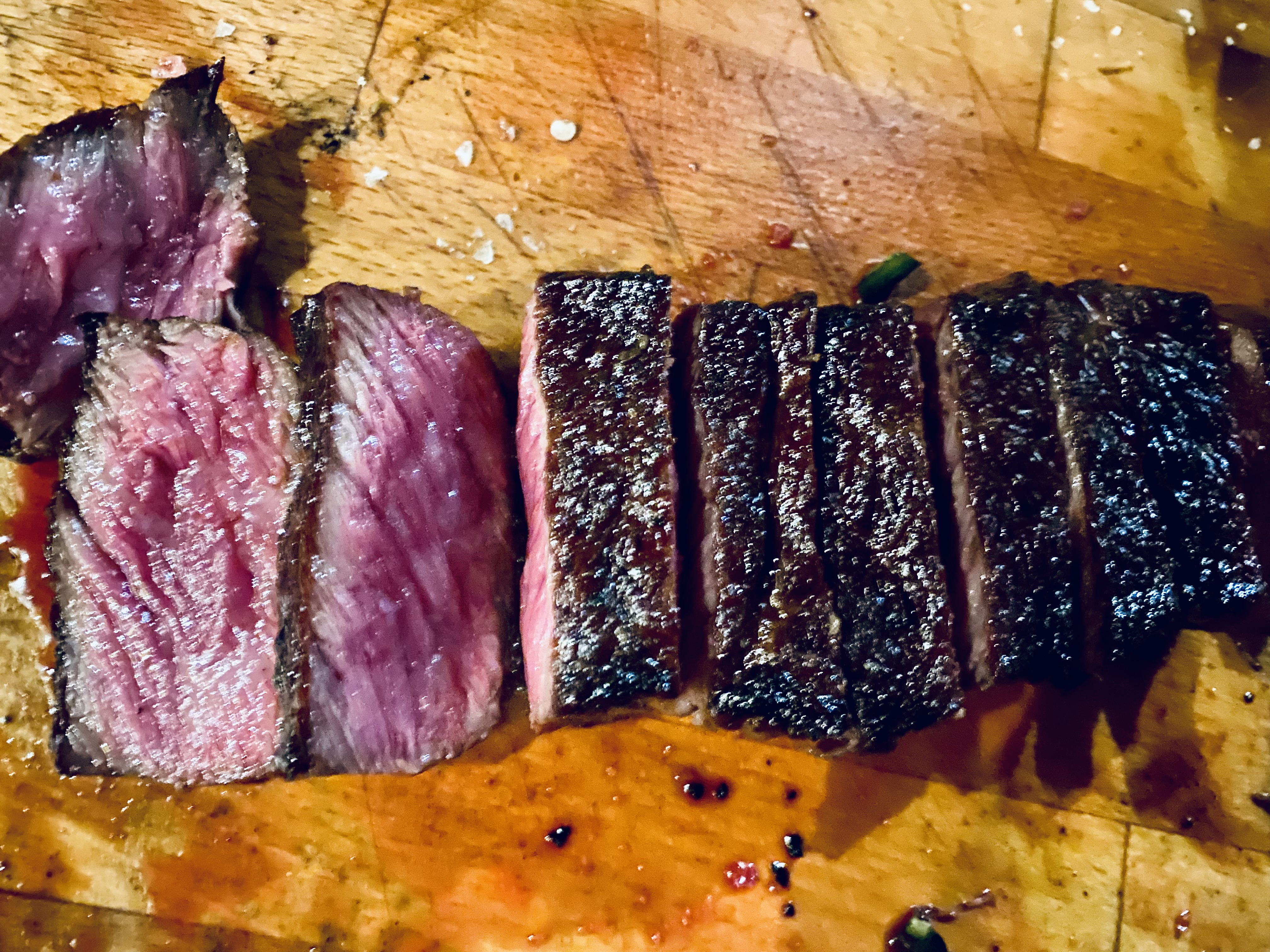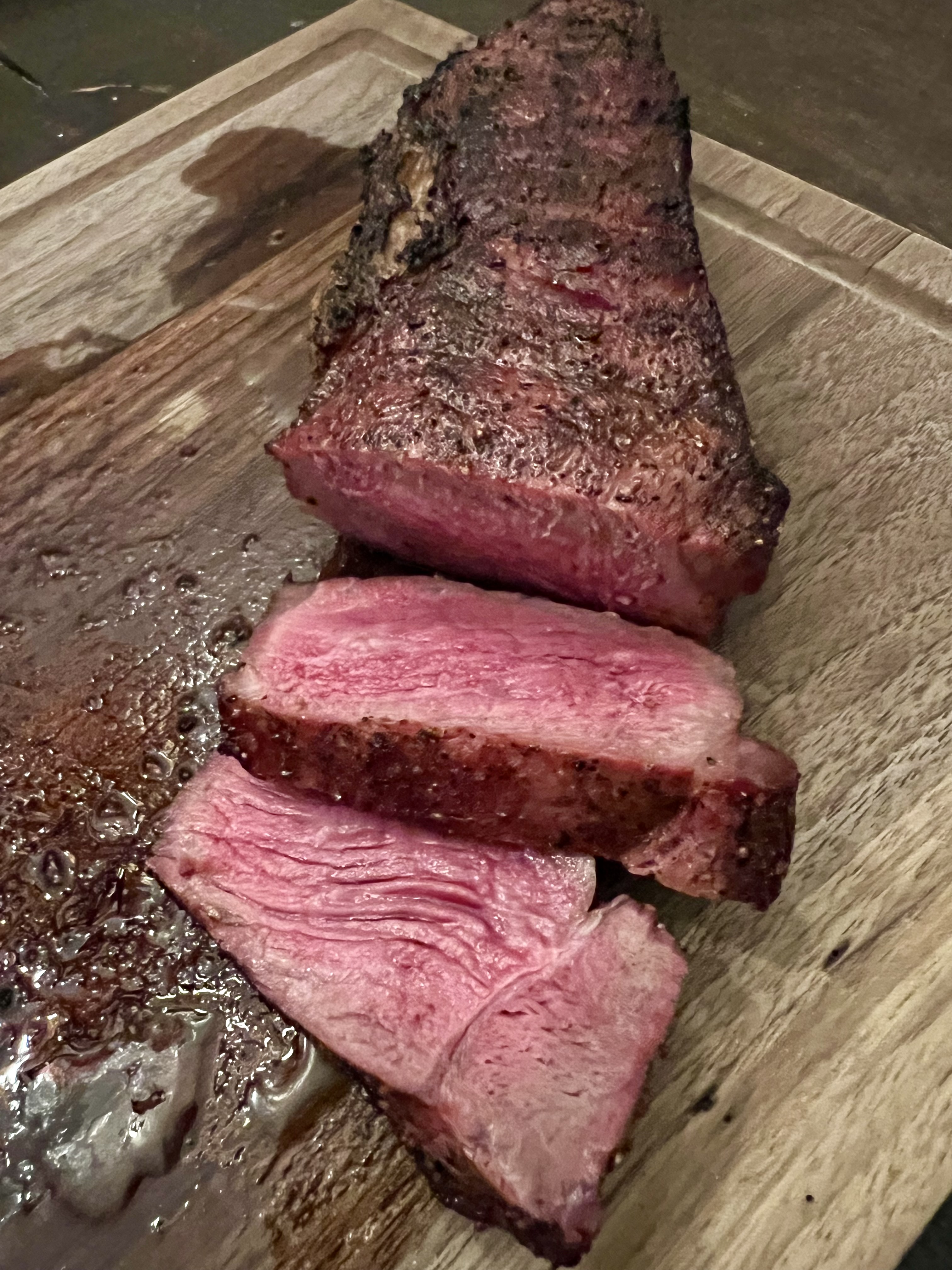 A bit of Maldon salt over the top. These steaks were served between a few other courses; no sides. We just picked the meat right up off the board. It was just so good. Perfect crust, buttery on the inside. Deep, beefy flavor.