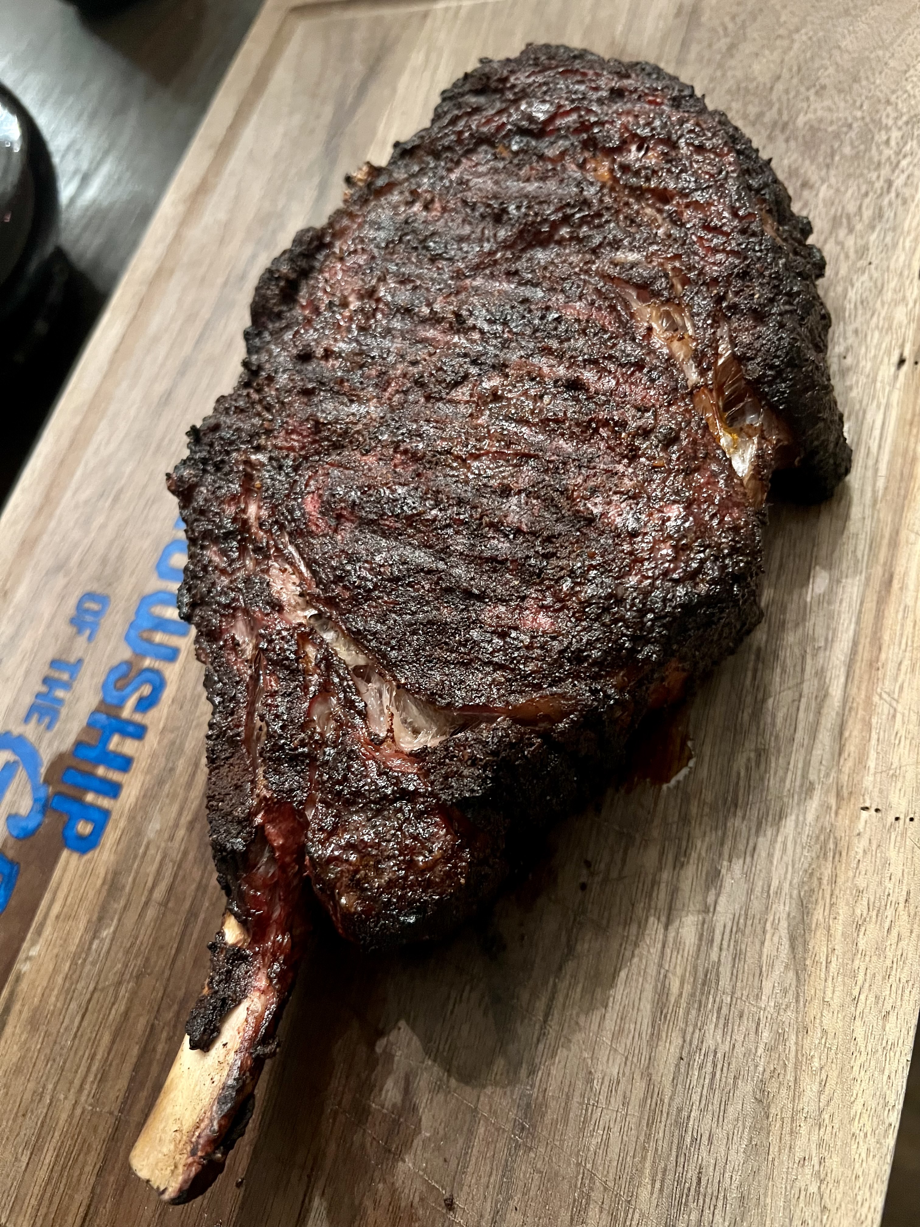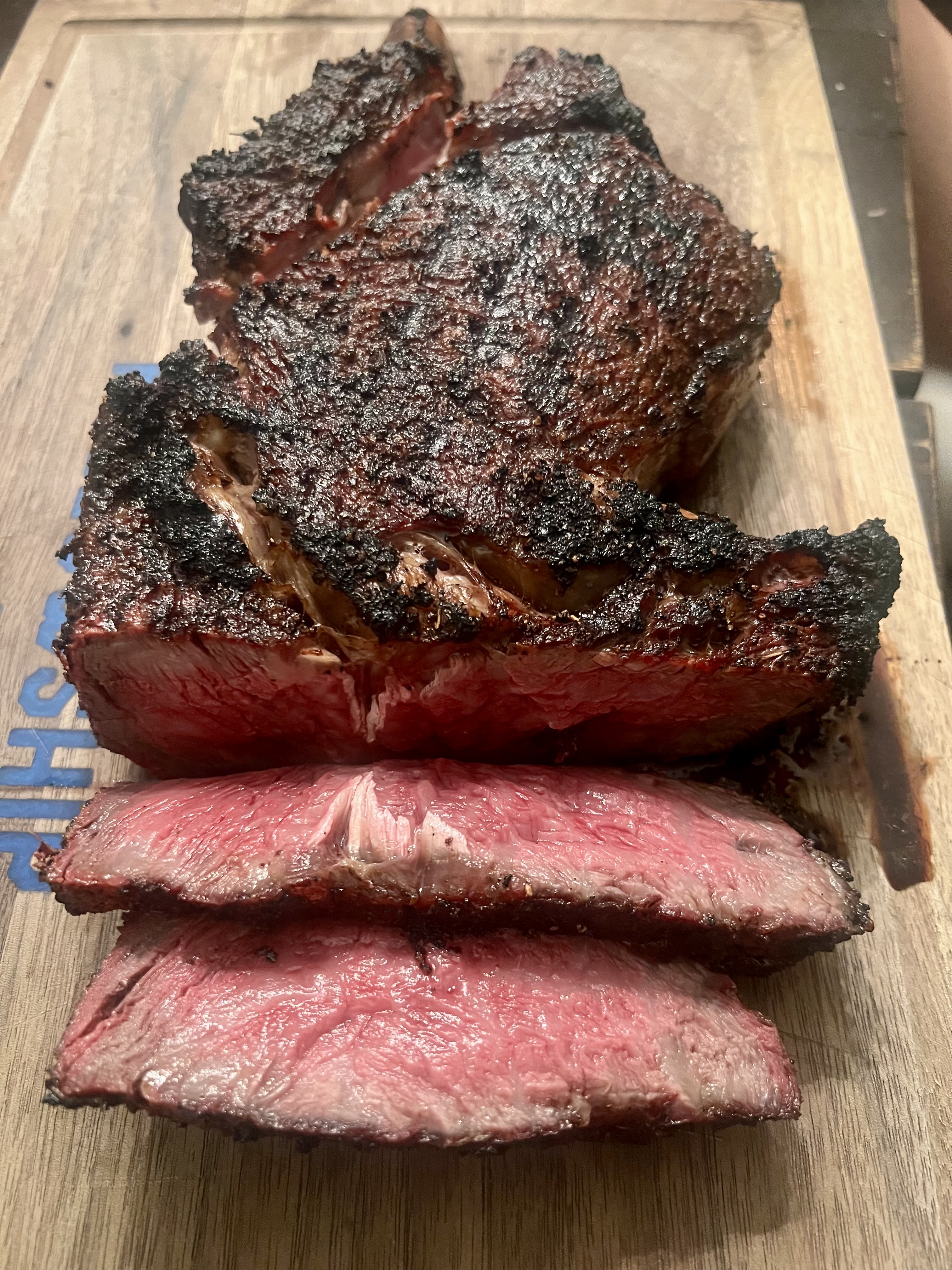 I cooked indirect with a low fire (split charcoal and pecan) for a good 30 mins to “defrost” the steak, let it rest for 30 mins, and then used a fan to crank the fire to sear off. Didn’t get a pic of the final sliced steak, but it came out as well as could be hoped for, with a thin rare line in the middle of an almost uniformly med rare steak.