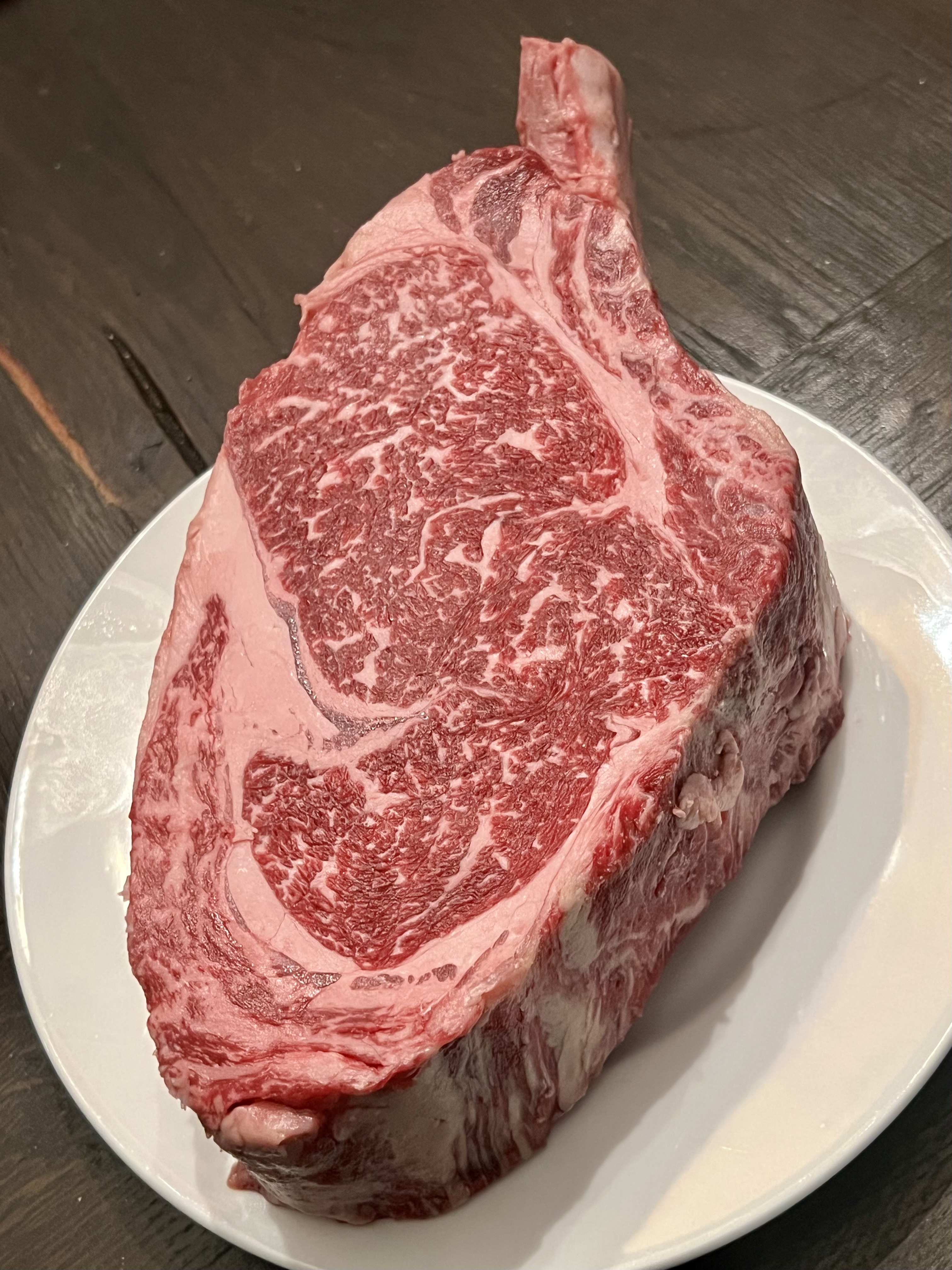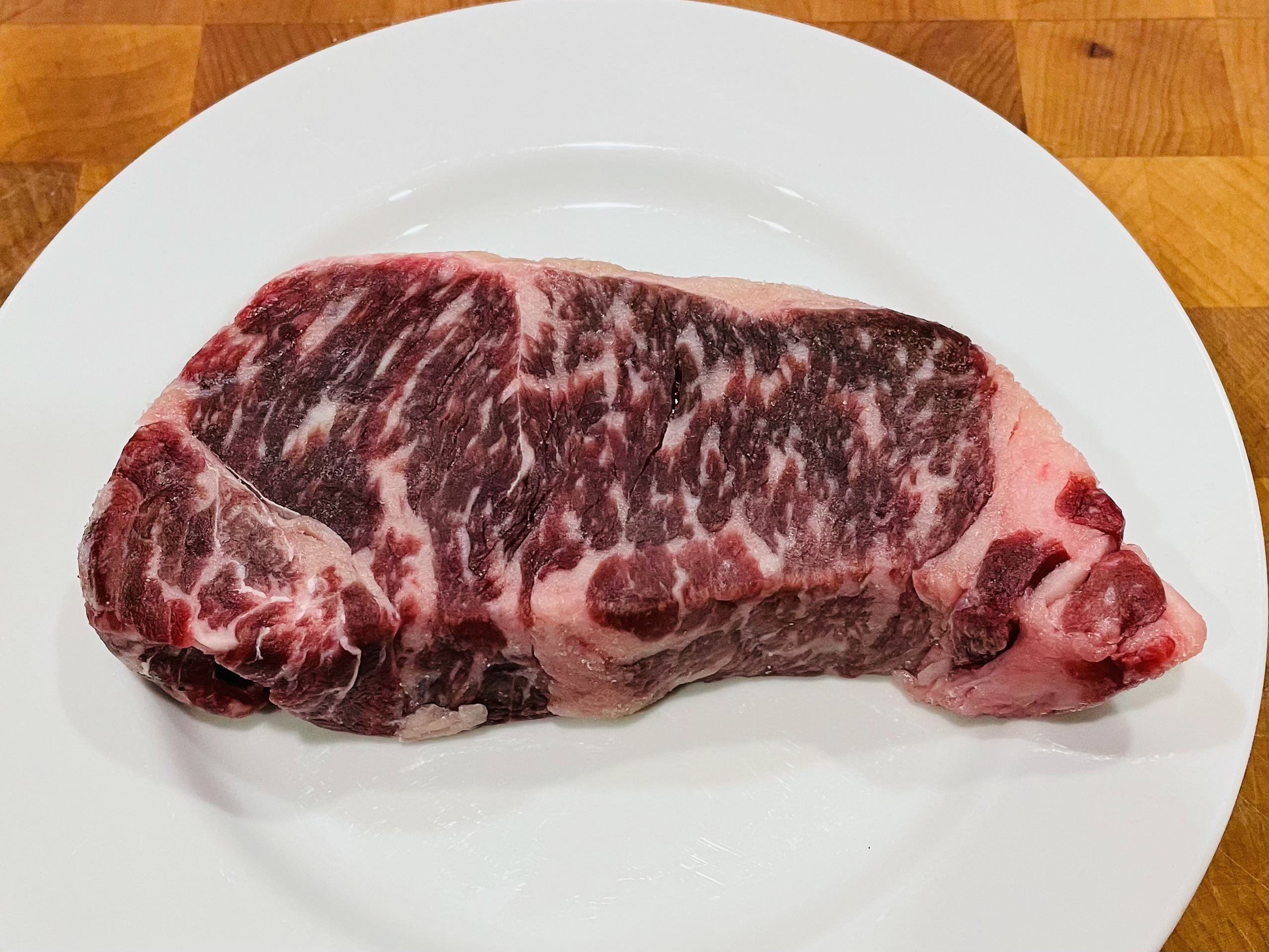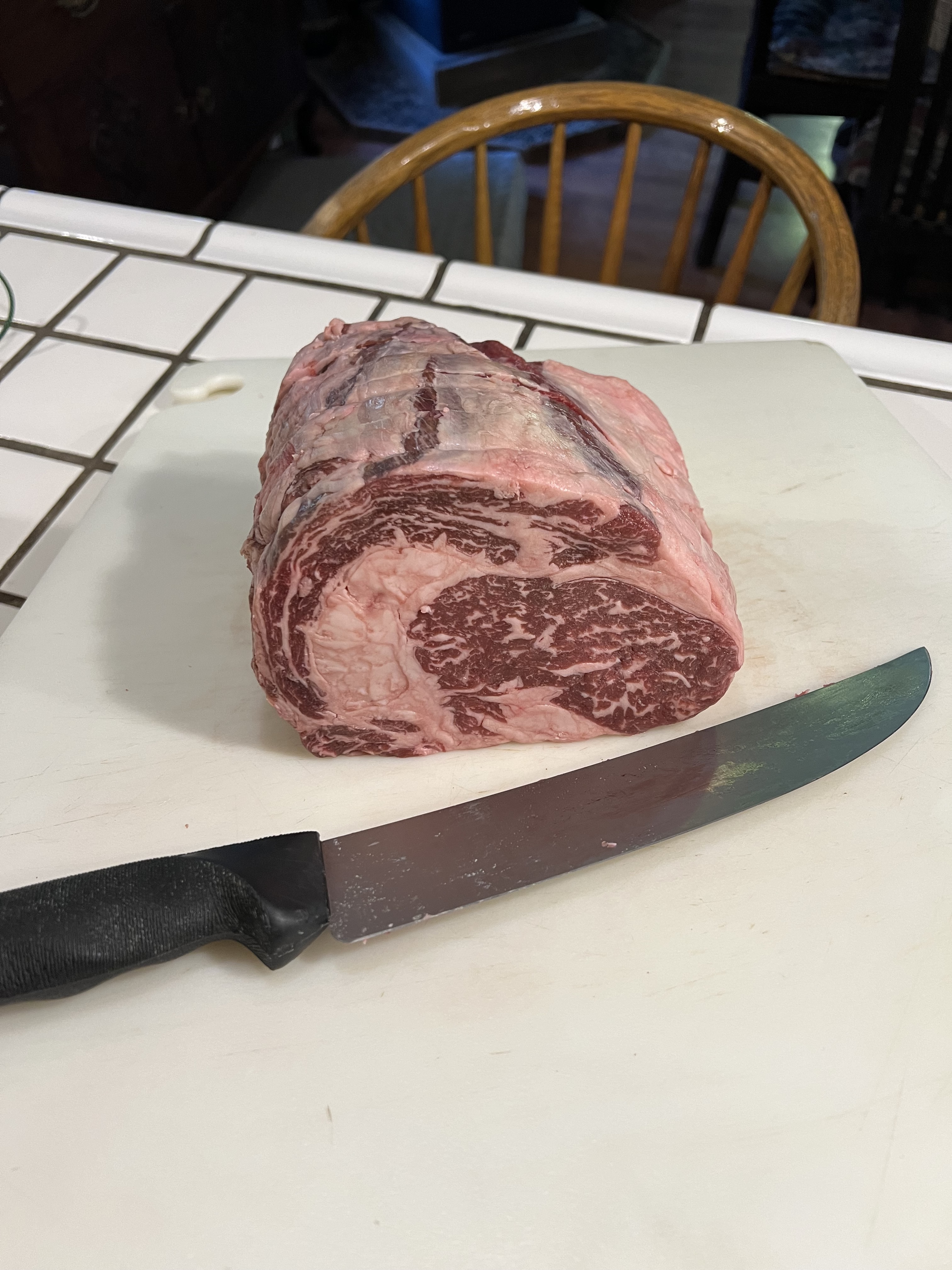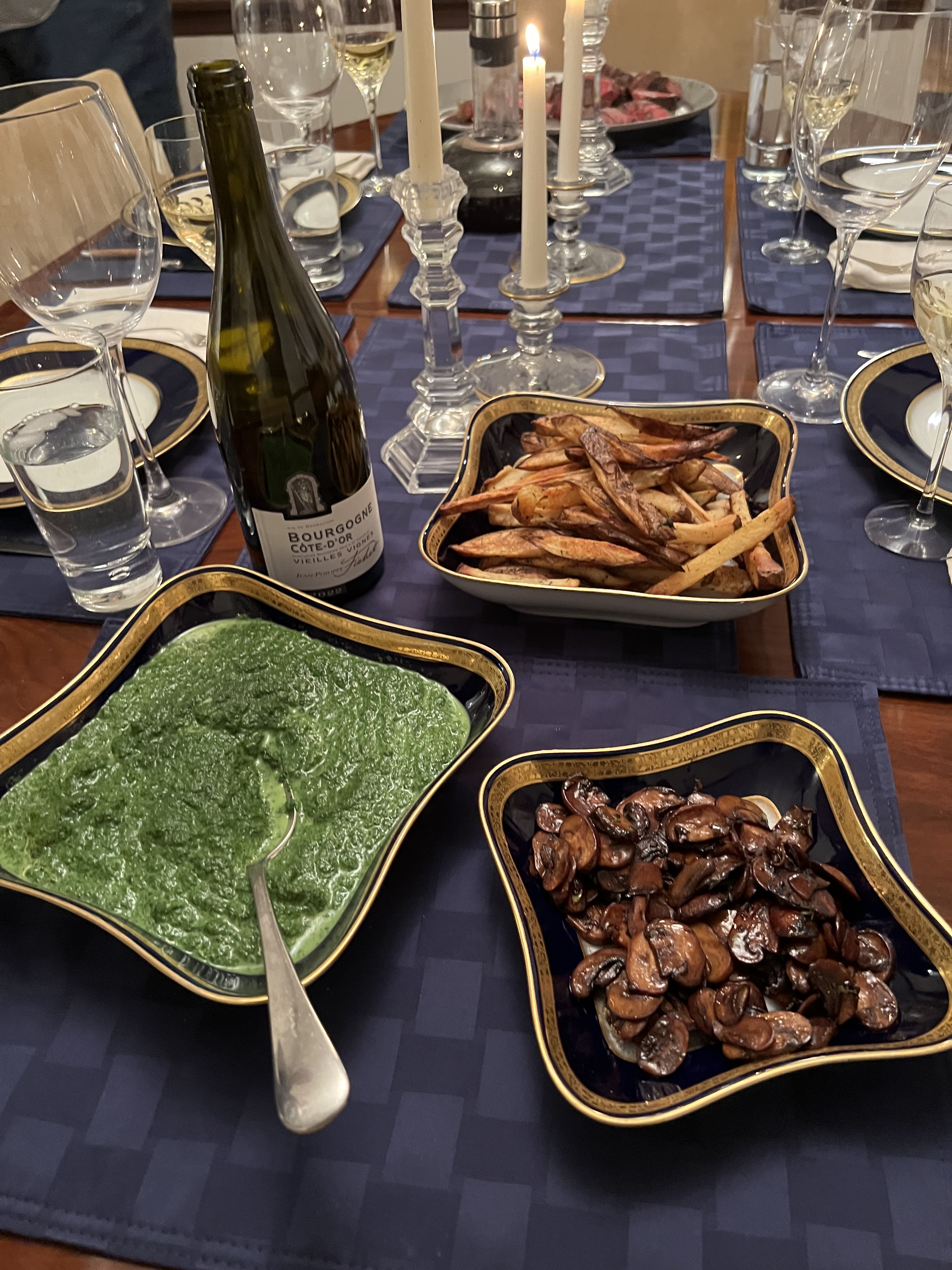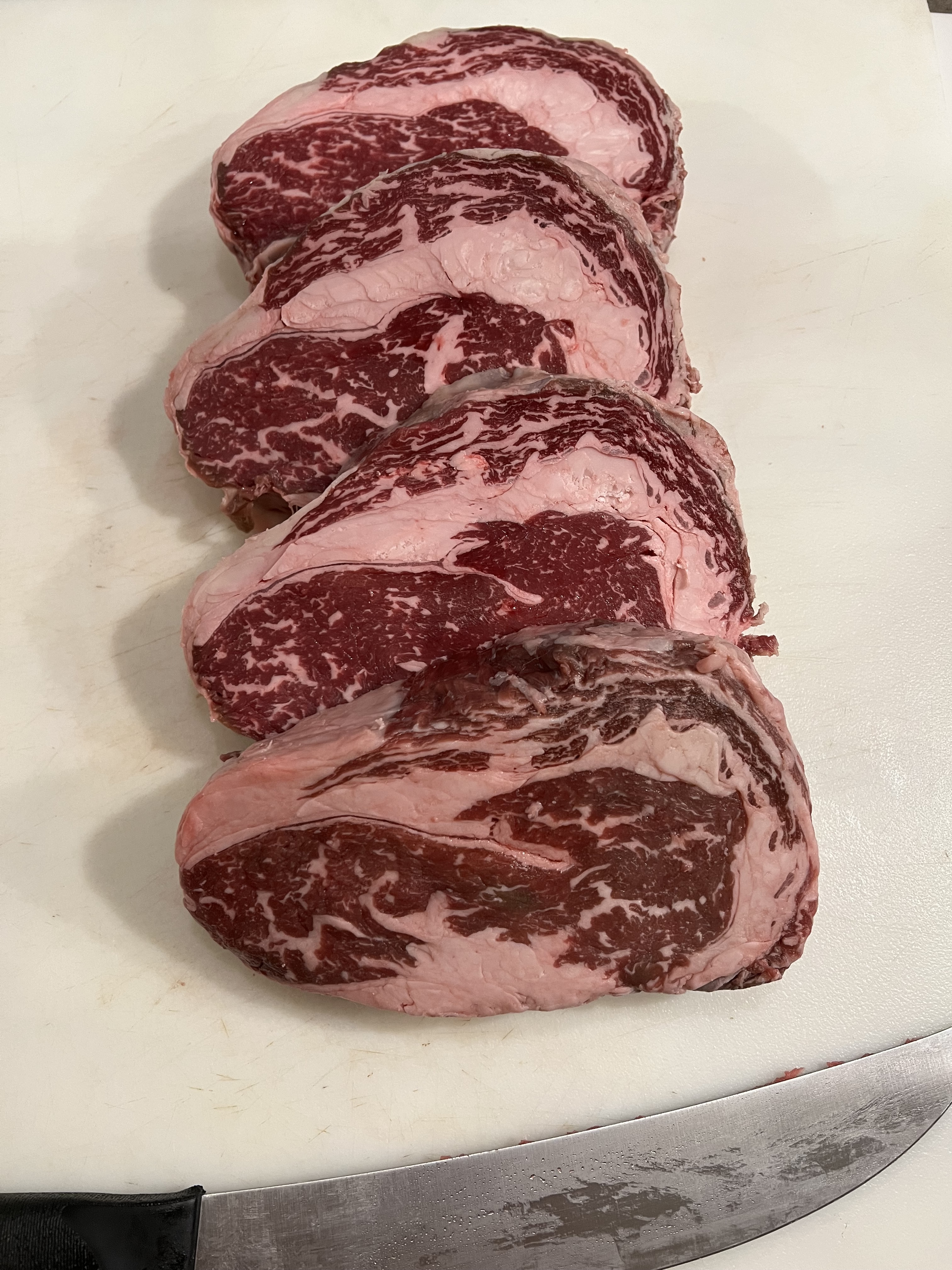 I couldn’t let a French colleague down, so pulled a Morgan Ranch standing rib roast out of the freezer and got it to where I could cut through it enough to break it down into 4 steaks. In fairness, I tried three grocery stores first, but they were all down to non-perishables, given the power outage: