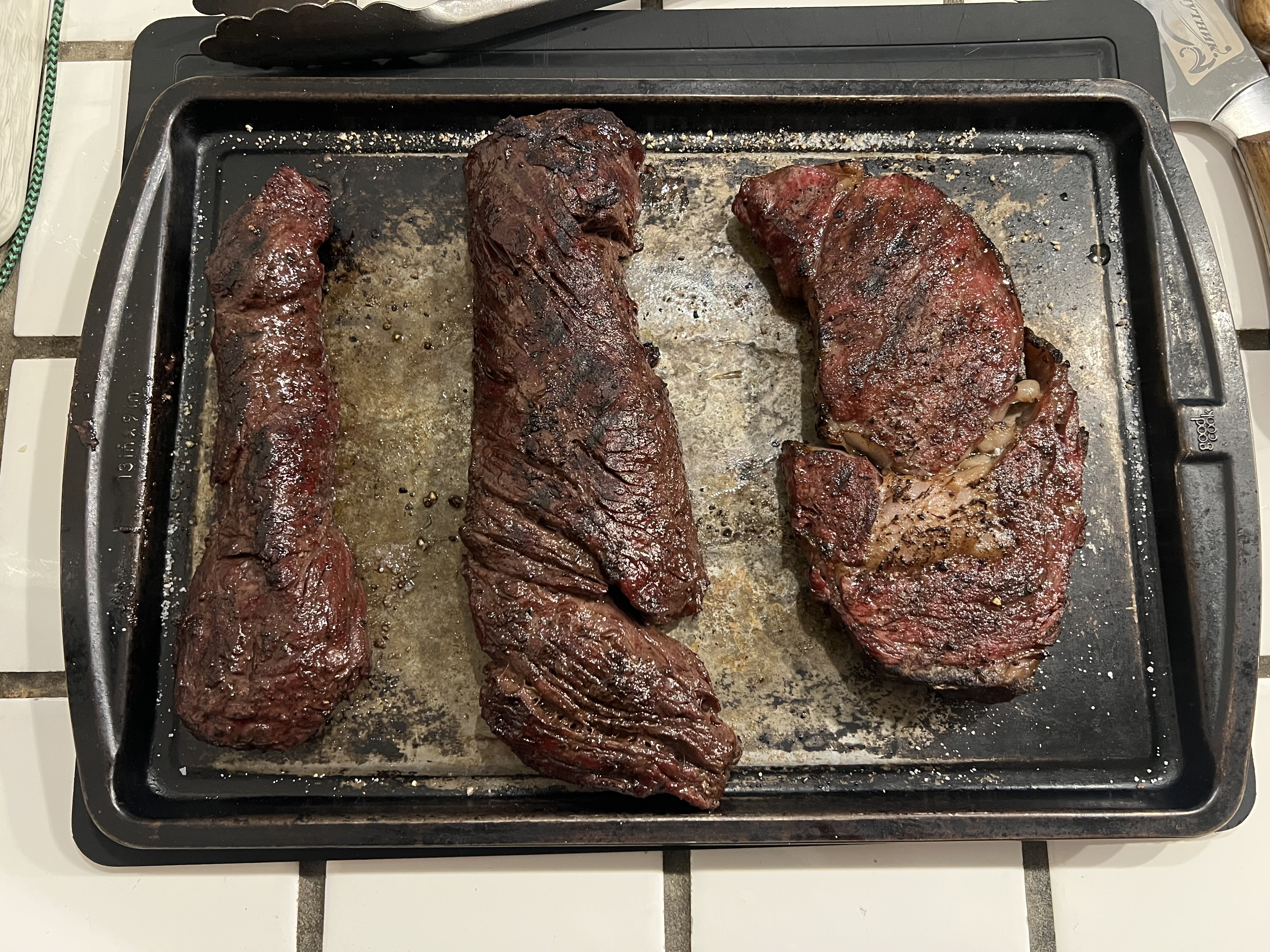 You should have guessed by now that the beef I was using was Morgan Ranch Wagyu. Raised right here, consumed right here. A little SPG on the Coulette is all it needs. Part way through cooking, I turned the steak. Next time I checked, the grill was under 200 degrees. Propane ran out. It was dark, 9:00 and we were hungry.