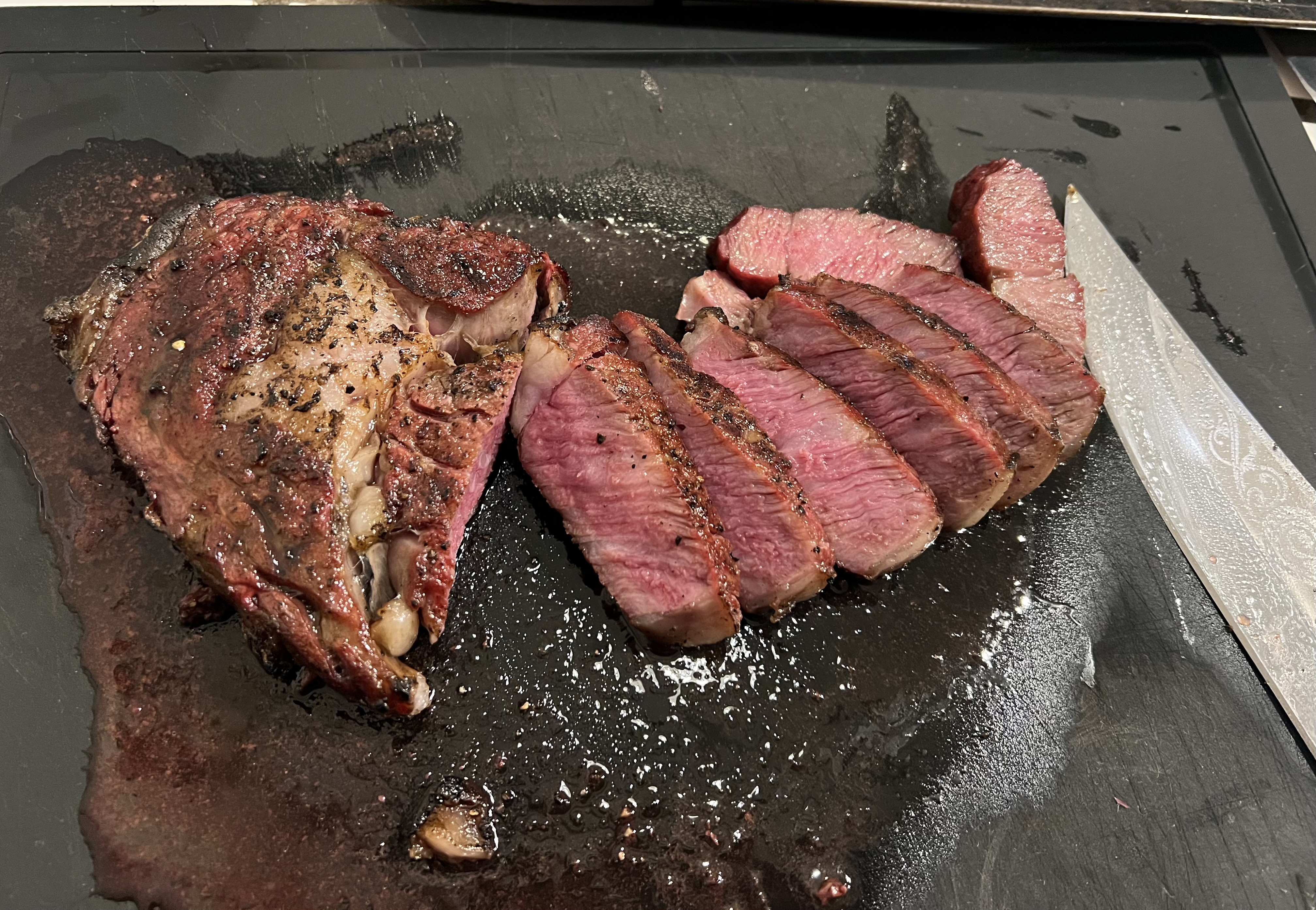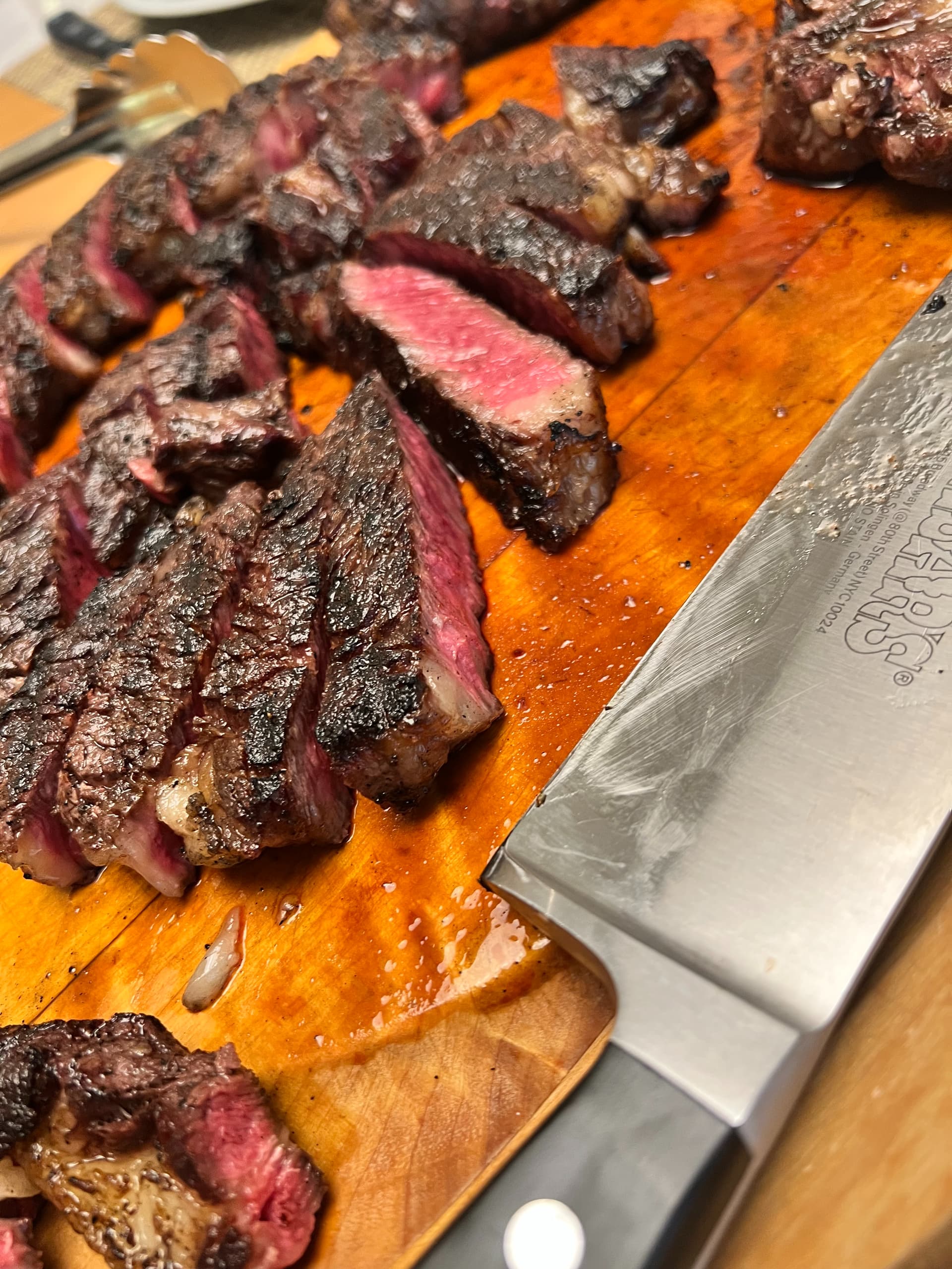 I pulled the beef and headed inside. This winter, we upgraded our range to a Forno. It came with a grill plate that I haven’t used much. Medium heat, maximum attention because I was nervous about over cooking the steak. It. Was. Perfect!