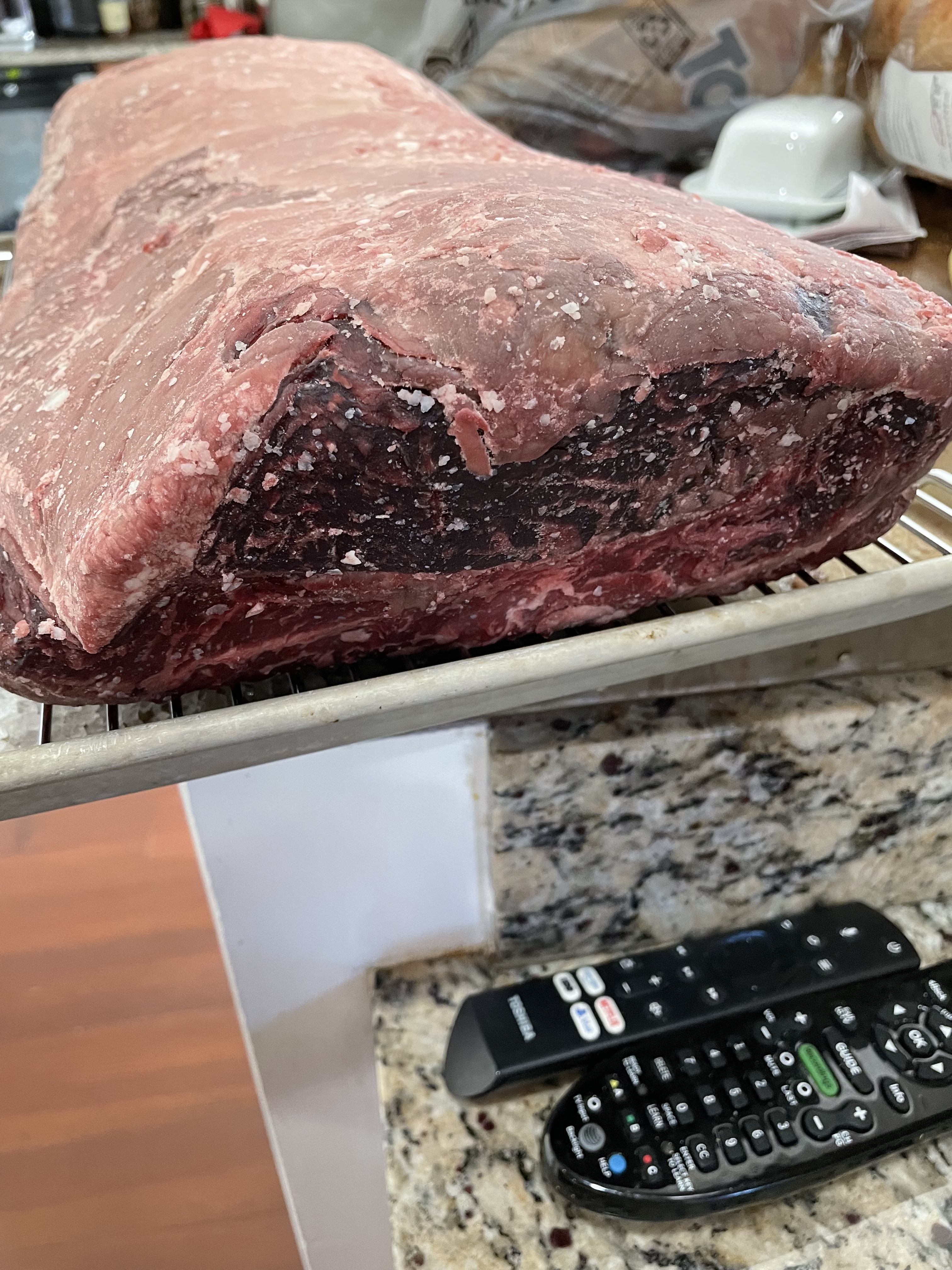 Not sure if I should consider this steak or a roast. This was a 3 inch think piece of prime standing rib roast I purchased on sale at Christmas and decided it was time to get it out of the freezer.