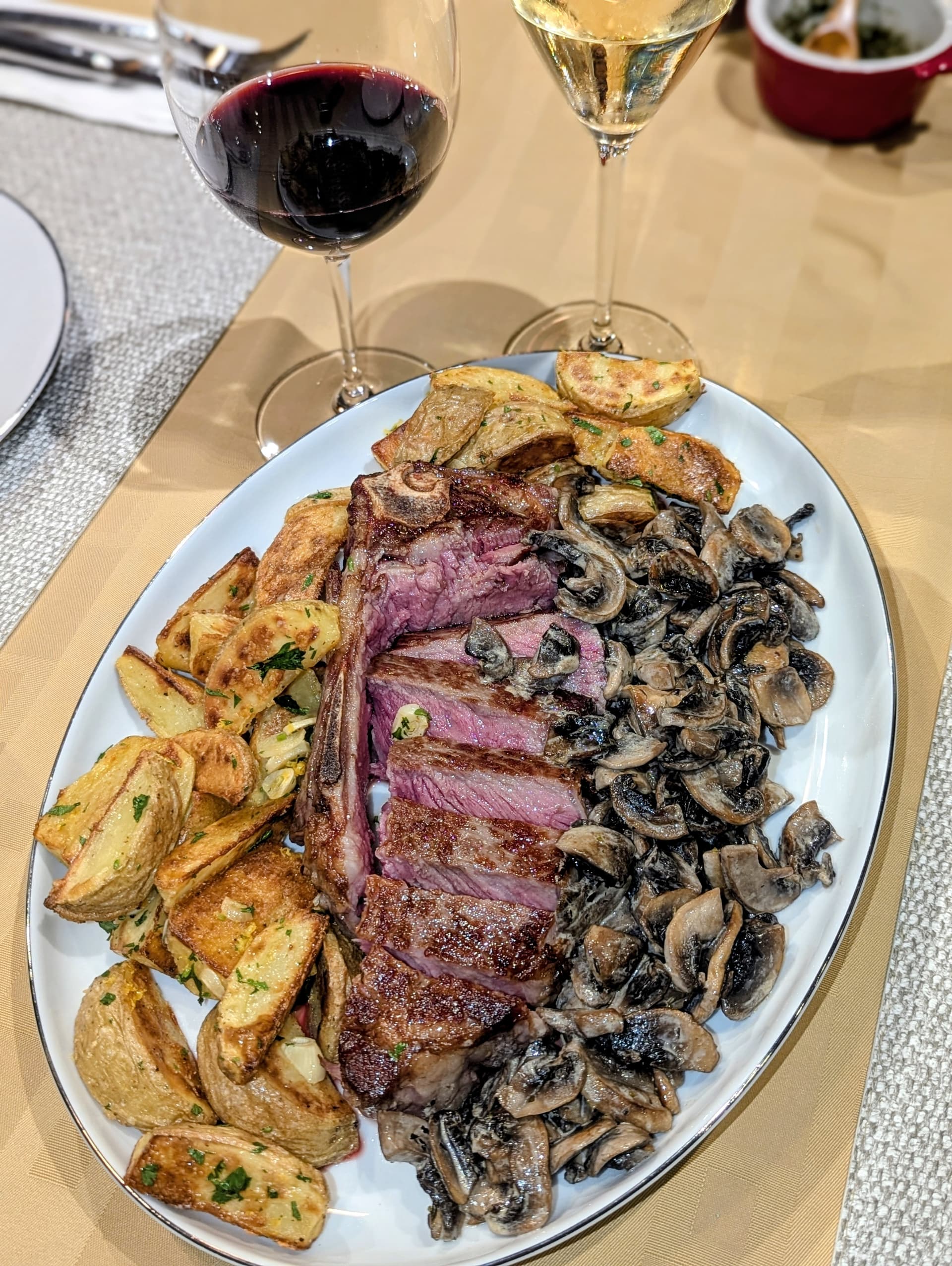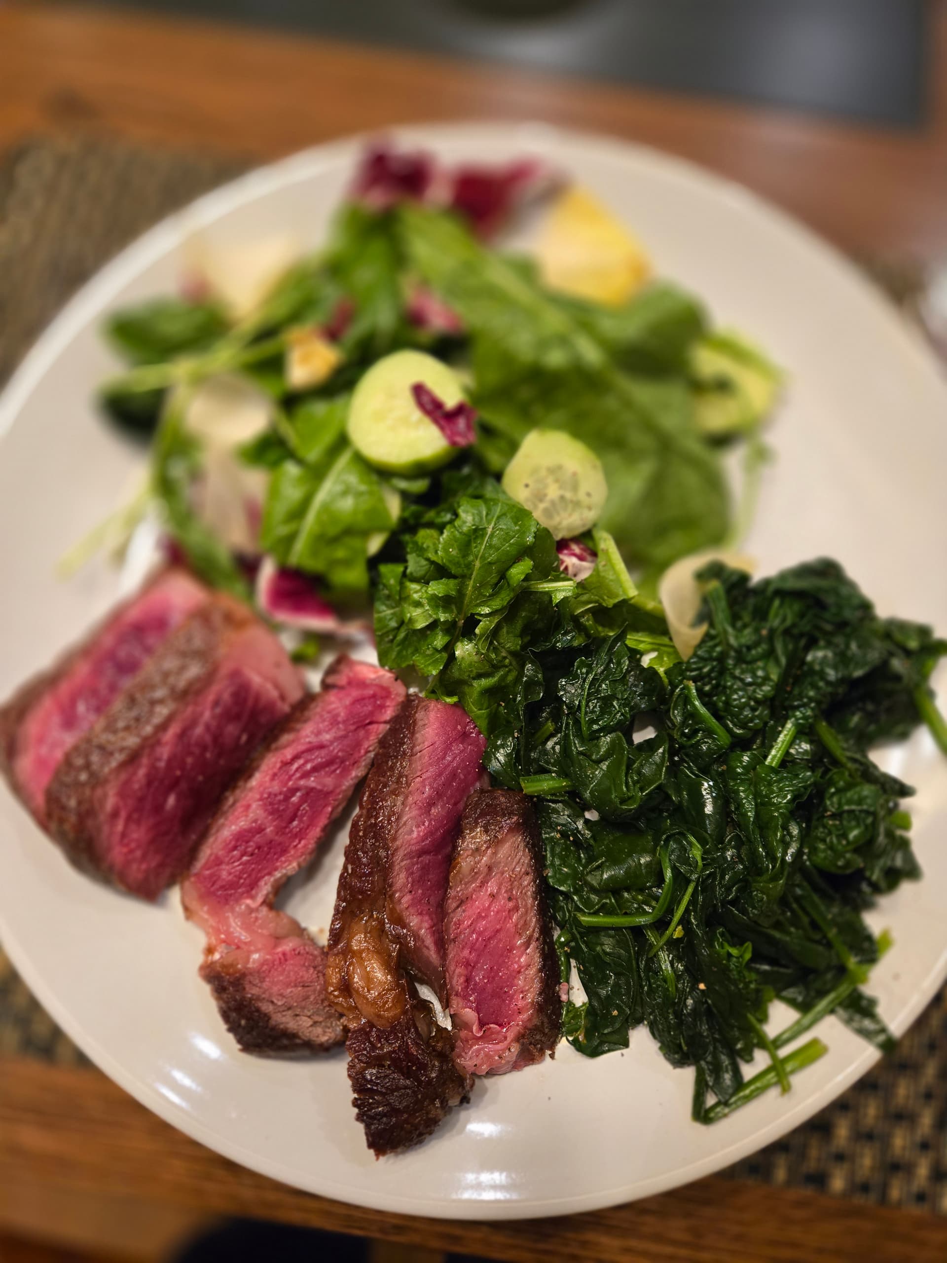 In need of a comfort dinner before going to sit bedside at hospice. Flannery 60 day ribeye and regular CA reserve strip. Sautéed spinach and young arugula salad from Green Meadow Farm. I asked for the steak rarer than usual, and Chef duly obliged.