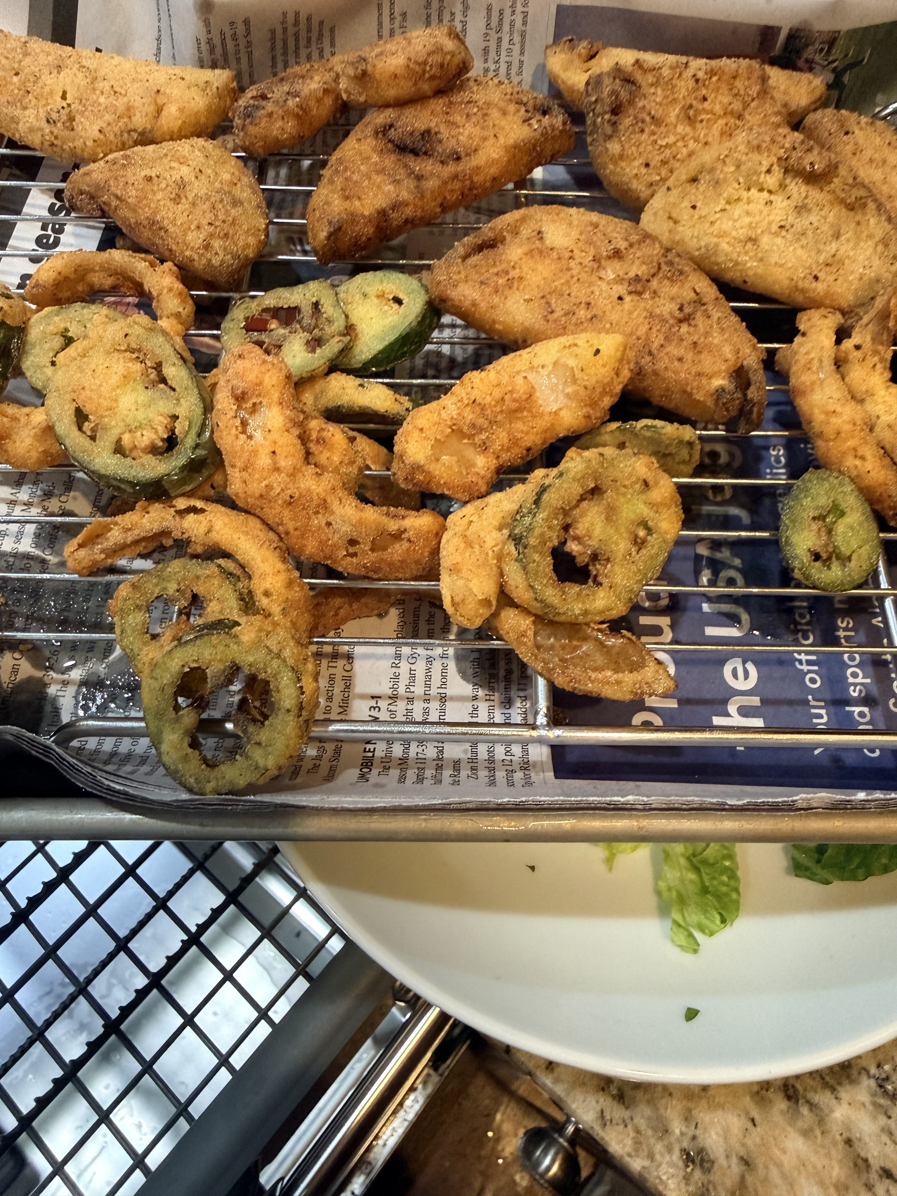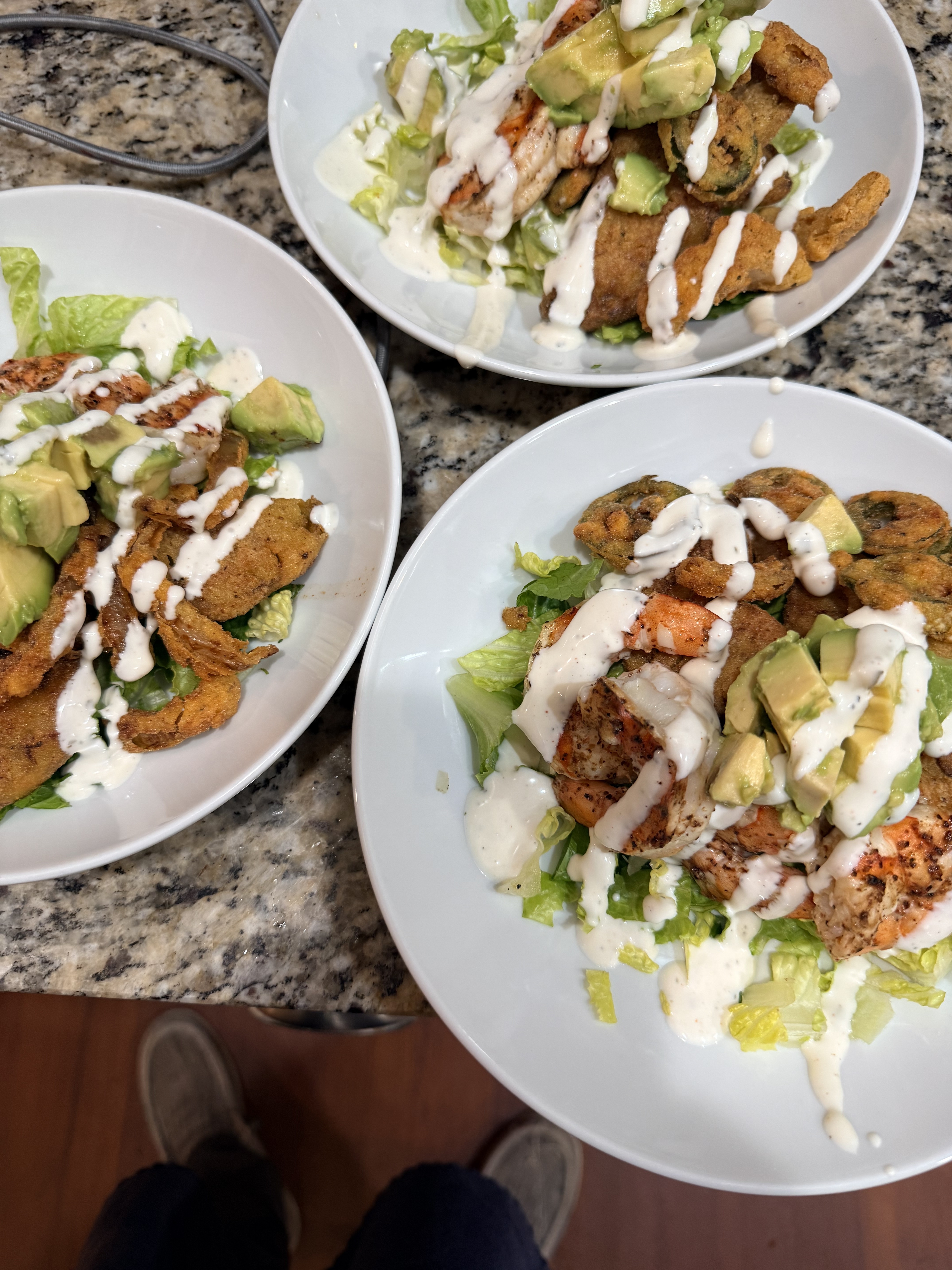 The sauce on the green tomatoes was just homemade ranch because I ran out of time. Normally it would have been a classic French style remoulade. Or if the shrimp were boiled then LeRuths remoulade recipe.