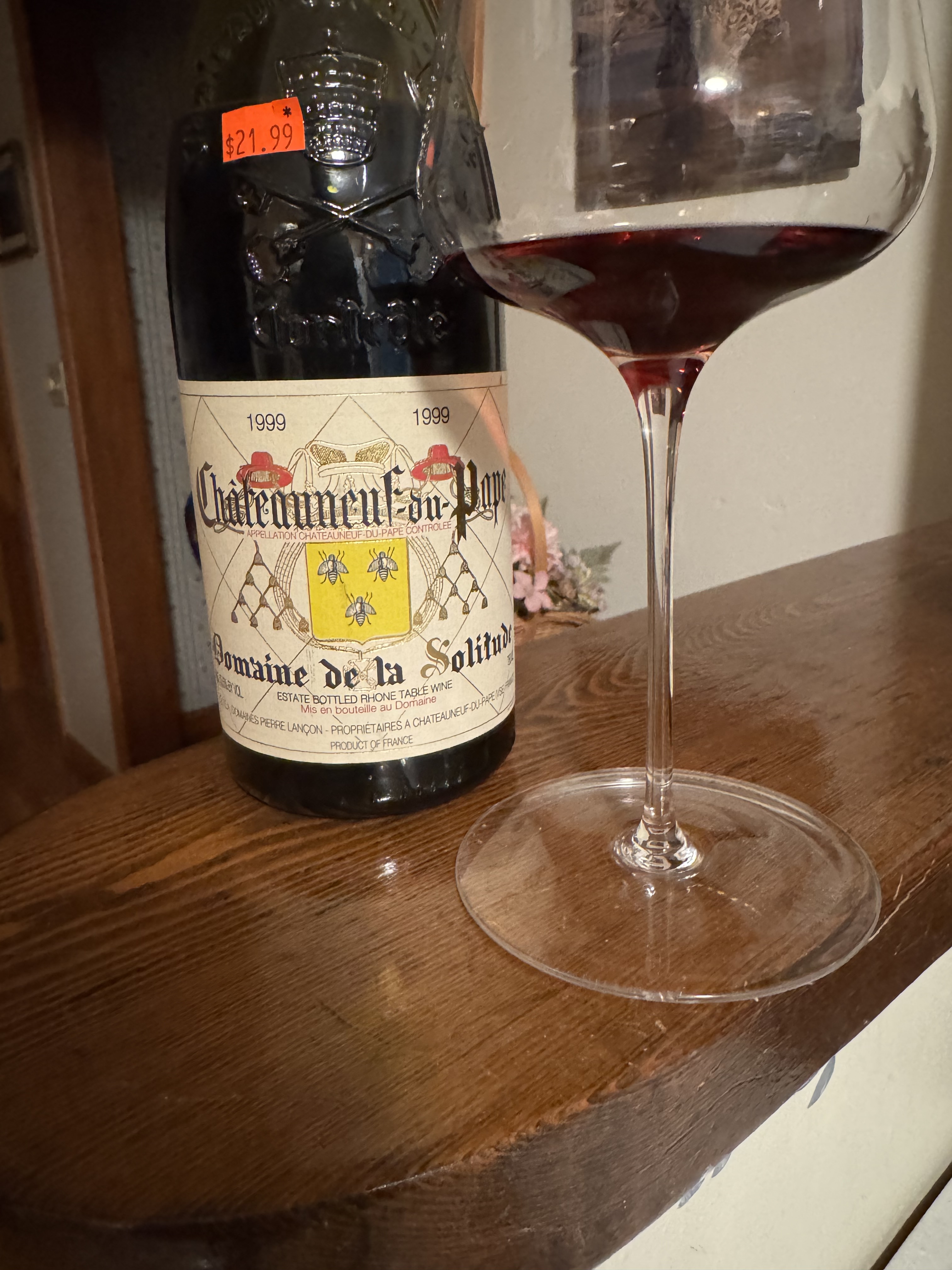 Over the holiday we had dinner with dear friends, and a bottle of 2016 Domaine de la Solitude was opened and greatly enjoyed. It struck a chord with me, as DdlS was my dad’s favorite Chateauneuf du Pape. When I was in Virginia, visiting mom for Christmas I checked around the cellar and found the two bottles of 1999 Domaine de la Solitude Chateauneuf du Pape from a case my dad bought way back on release. Tonight I opened one. 1999 was to a degree a forgotten vintage surrounded by rather more popular years in 1998, 2000, and 2001. I happen to like it a lot for its more graceful style. After a little bit of grumpiness from 25+ years in a bottle, this particular 1999 showed a lot of that gracefulness. Solitude has never been a “big” wine so far as I know, and the flavors were lighter than many “great” Chateauneufs, but still very typical. I sipped on a glass reminded of my dad, and dear friends who reminded me of the wine.