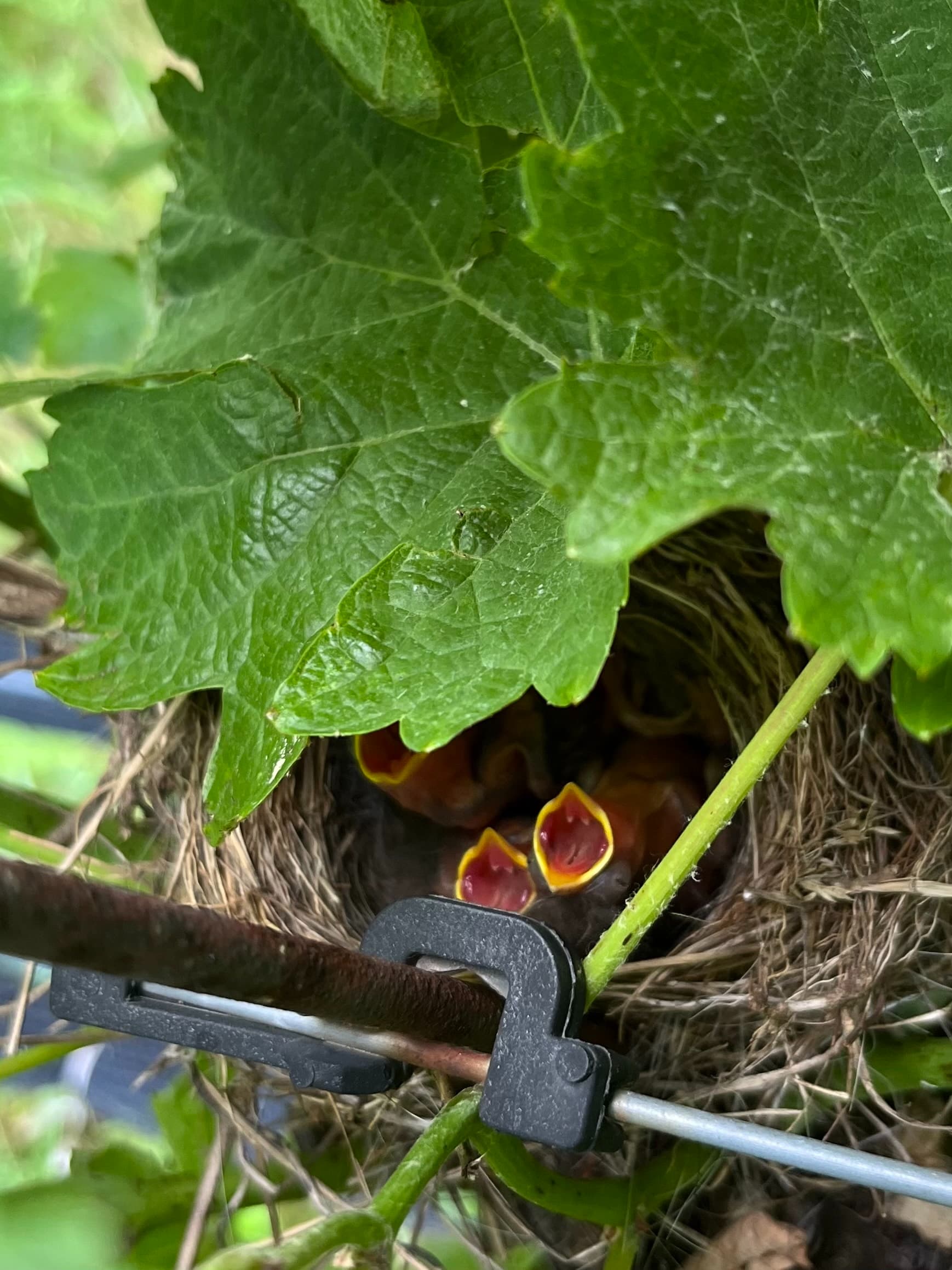 The second is of newly hatched chipping sparrow youngsters in the head region of a chenin block grapevine. This is the second year that chipping sparrows have nested in approximately the same area of the chenin blanc block.