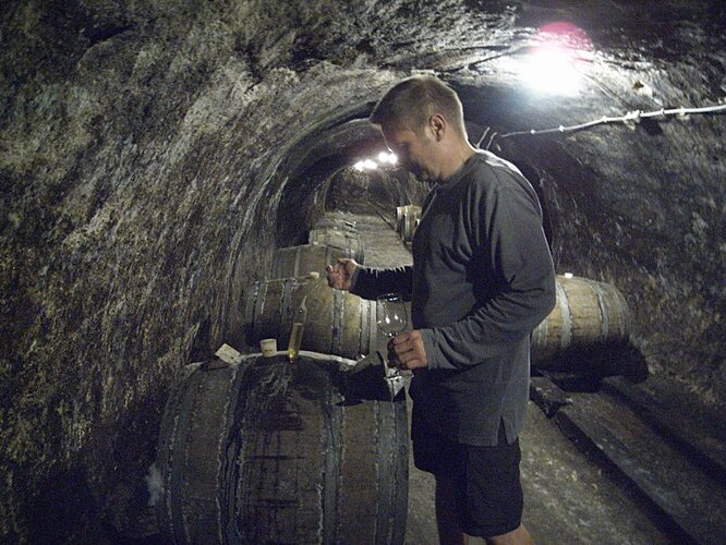 About midway through my tasting, our hostess saw Tamas and I peaking around some corners, and offered to turn the lights on in other areas of the cellar. She then gave us a brief tour of this incredibly interesting cellar. Having primarily tasted in new world areas, I had never seen anything quite like this before: