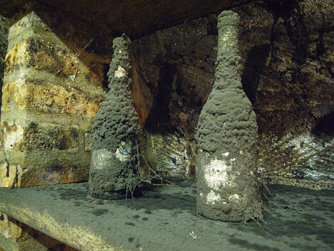 A totally gnarly bottle of Tokaji covered in this black mould. She used this bottle to show how the mould likes the alcohol… this cork probably had some extra permeability, so it grew like a mushroom here.