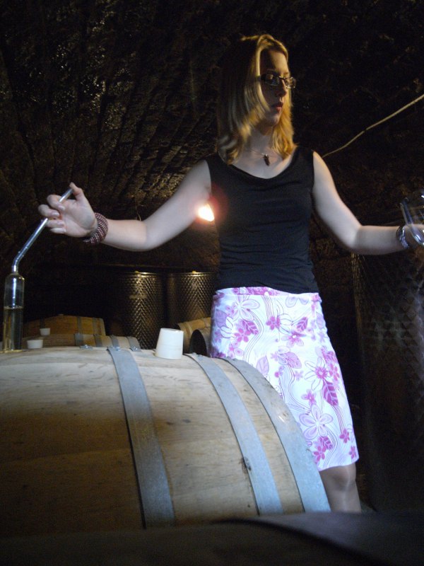 Our first stop. This producers was found on CellarTracker, with one particular bottle (their 2000 Aszu 6 Puttonyos) having quite a bit of recent activity and a community average of 93.6. We were greeted at the gate by the daughter of the owner/winemaker, Angelika Árvay. I could tell right away this would be a little different than your standard tasting experience… we entered a room of the building where a table was set with glasses, and we sat down across from each other as Angelika began talking about the winery and its history. Angelika studied in London and California, speaking very good English and she was able to describe the wines quite well in English. She asked if I wanted to start right into the bottles, or if I’d prefer to visit the cellar and try a barrel sample. I of course jumped at the chance to visit the cellar. It was just outside the main house, with an above ground entrance, with a small little door you had to hunch over to get through, followed by steep steps that went down at least 10 feet. Here was a relatively small cellar. We chatted a bit more as she pulled a sample of the 2010 dry Furmint from barrel.