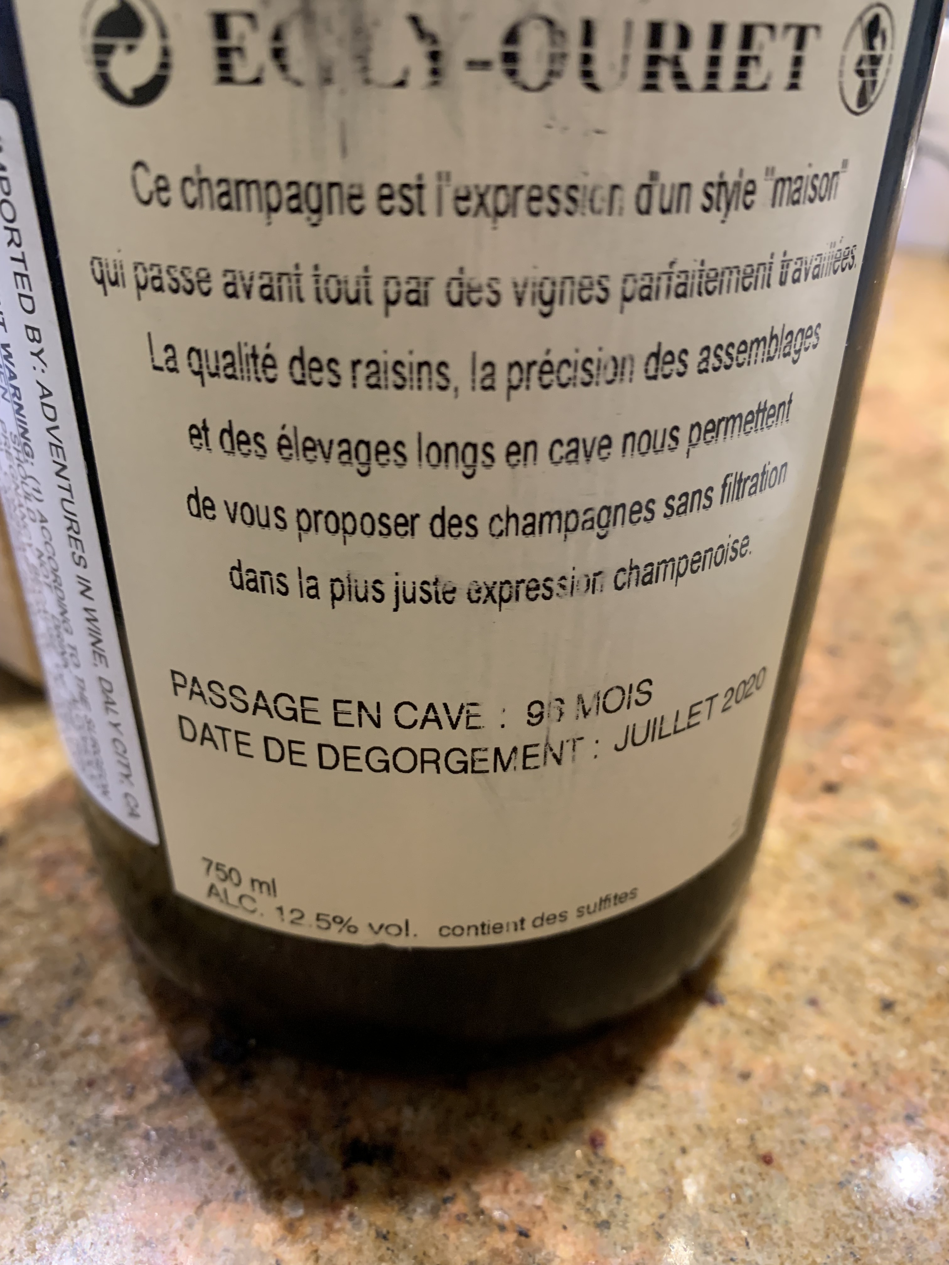 This was a complete bottle of champagne.On the nose there is bright citrus, floral, and yeasty buttery scents. It has very good structure, nice acidity, small persistent bubbles and a long rich finish.
