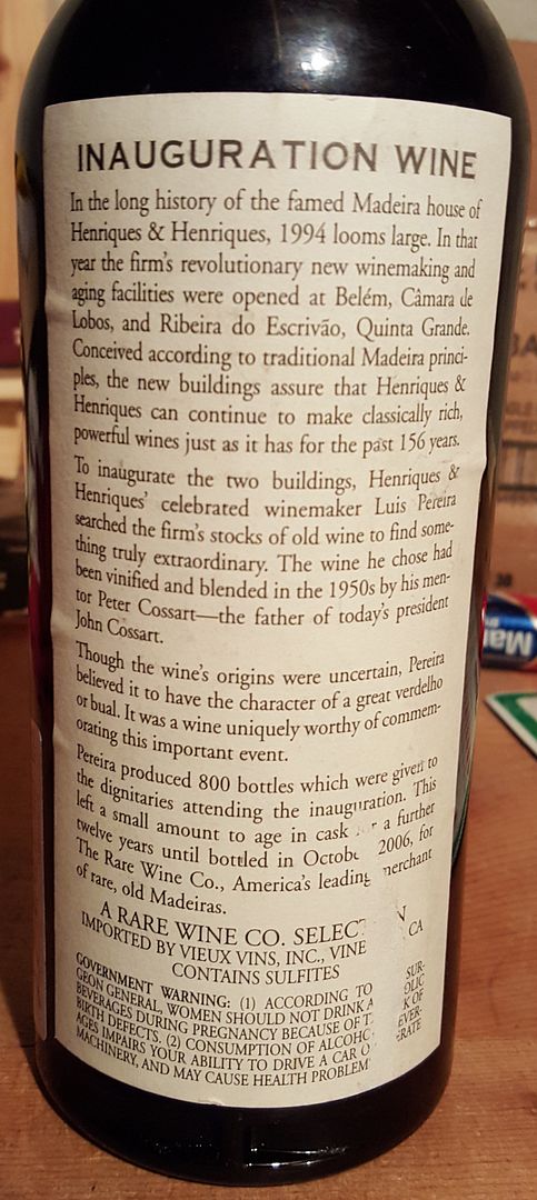 Great question. Henriques & Henriques inaugurated a new facility in 1994 and held a big gala. This wine was specially bottled for the occasion. Here’s a photo of the back label, which gives the story.
