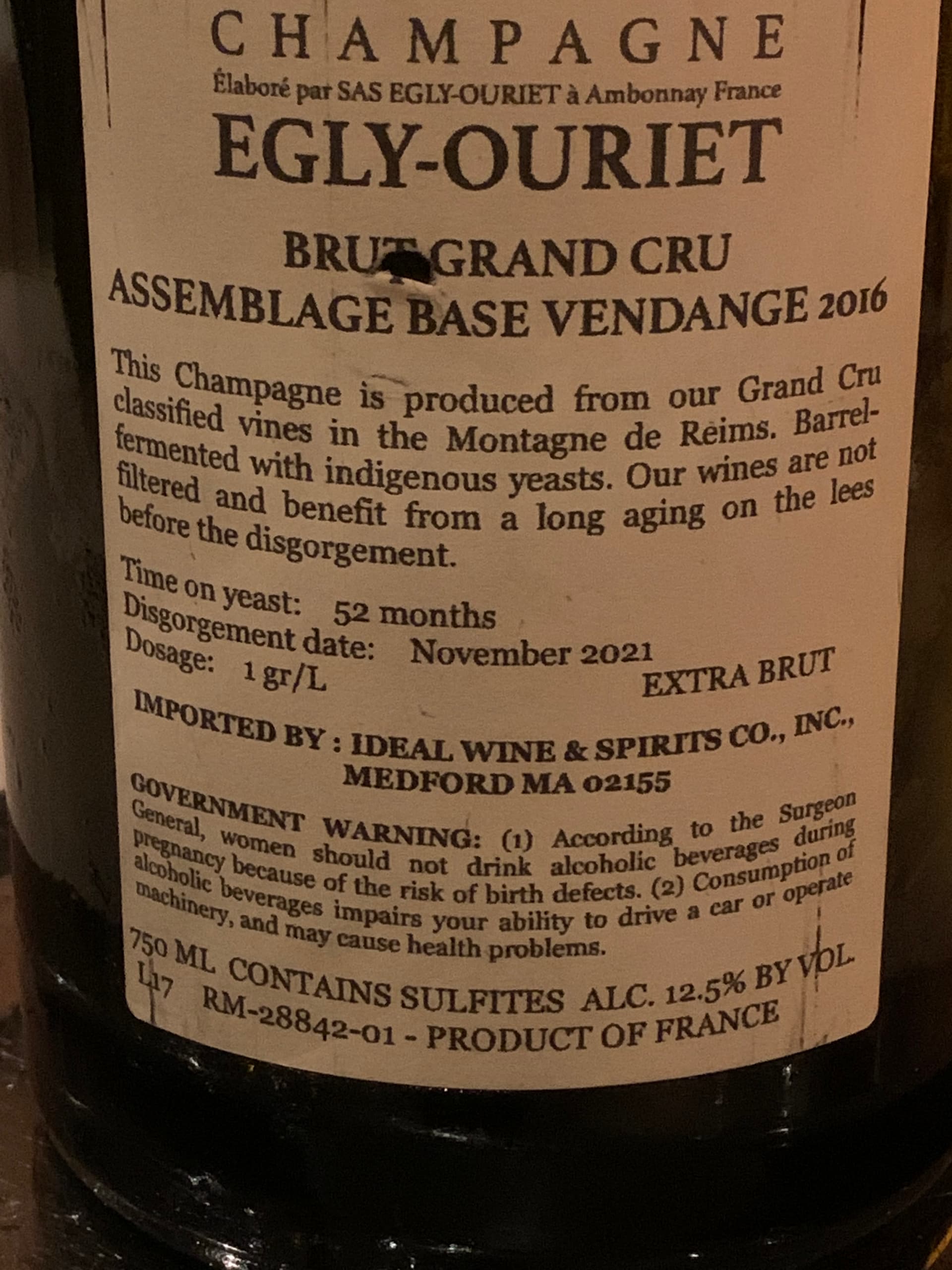 Egly-Ouriet Brut Grand Cru, Base 2016, disgorged November 2021, 52 months on the lees, 1 gr/ L dosage.