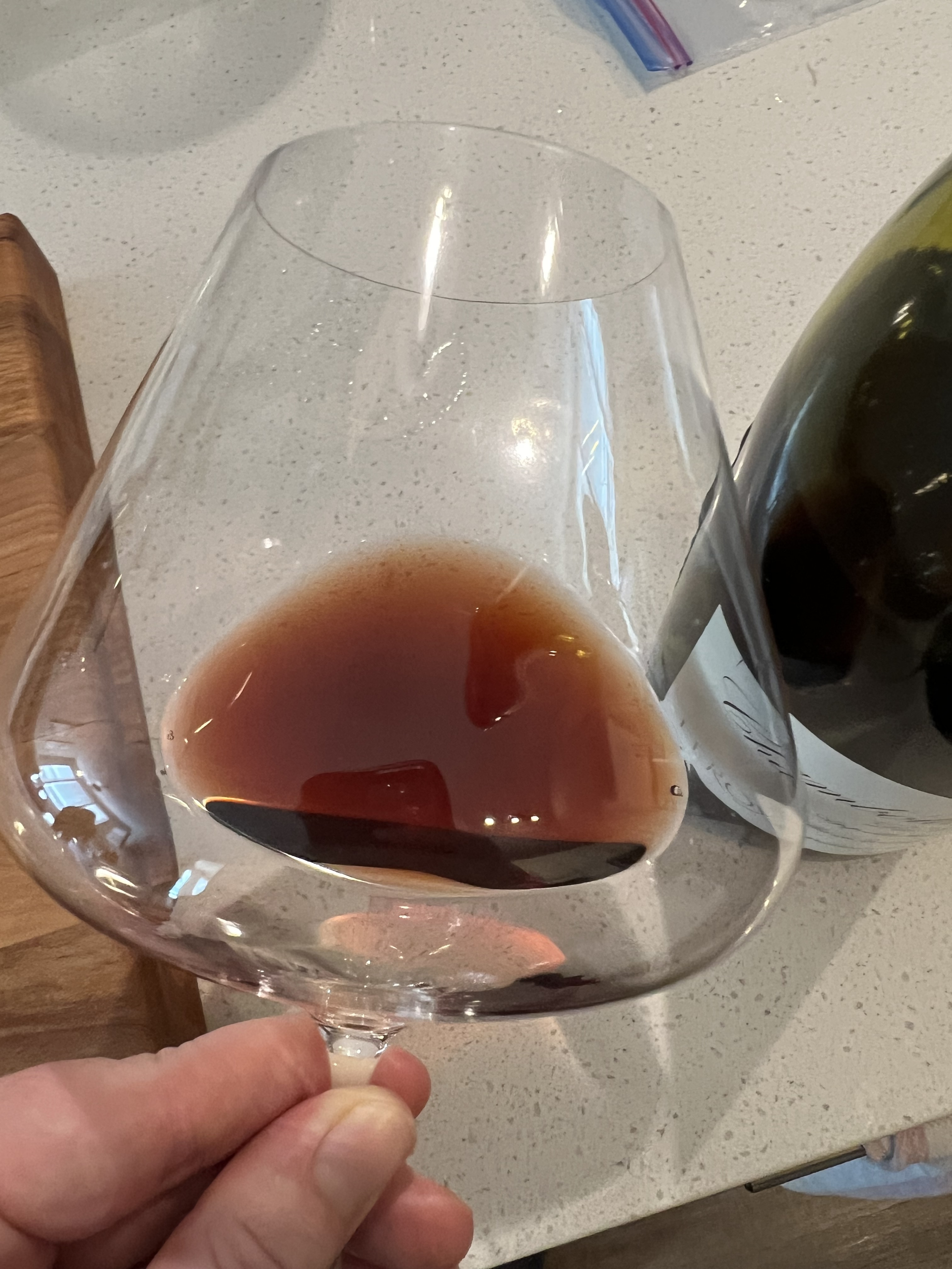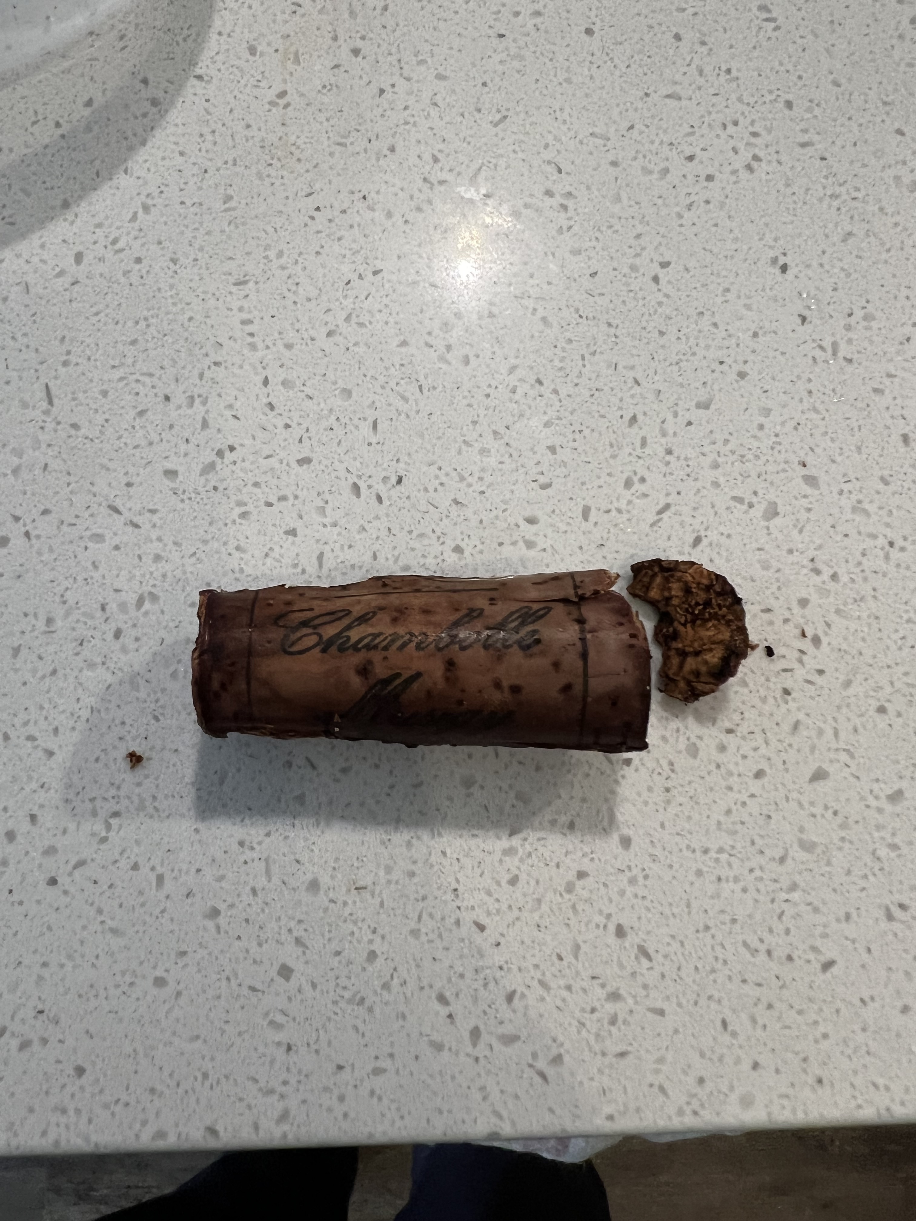 I pour us both a small taste, woah. Meaty and bloody, desiccated rose, sour cherry. Another Leroy with a crap cork from a “bad” vintage that’s still kicking. On the palate in that moment it was sour fruit, some cured meat. Great acidity and no tannin. I put a topper on and brought it home.