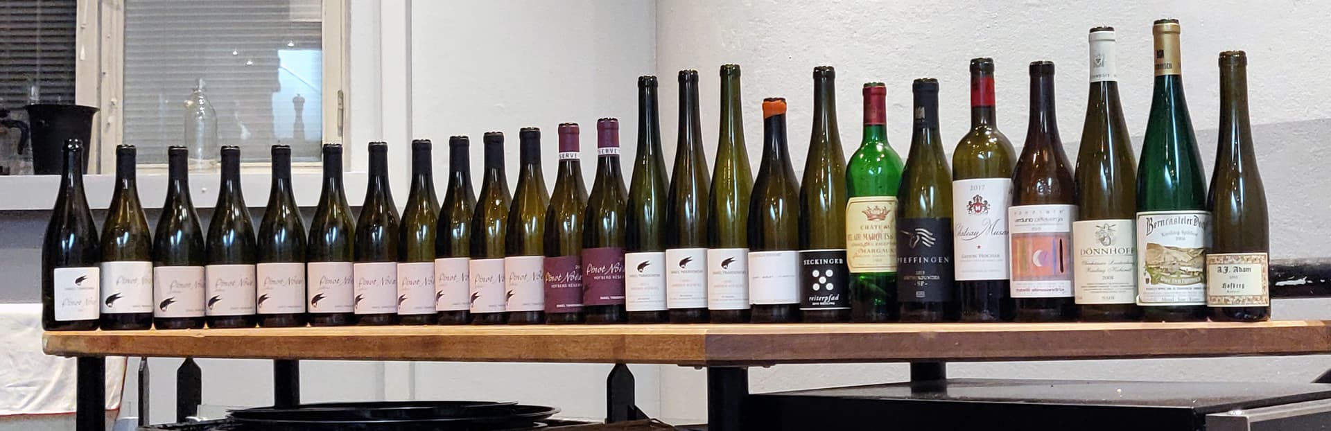 The complete lineup of the evening (although a bottle of Hofgut Falkenstein didn’t make it to the photo, for some reason).
